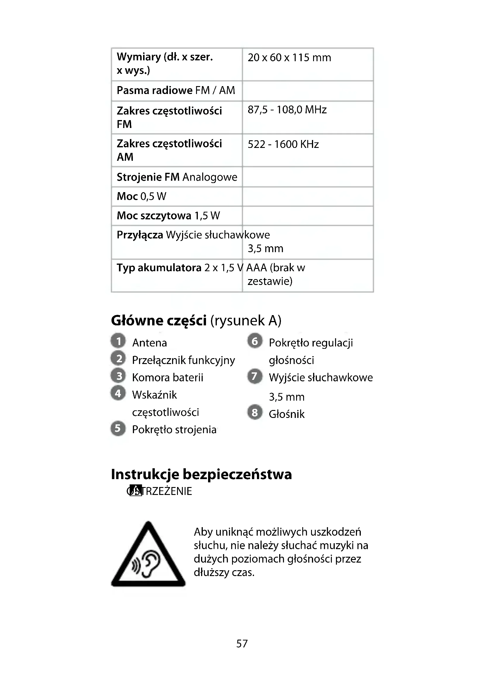 Strojenie FM Analogowe Moc 0,5 W Moc szczytowa 1,5 W Przyłącza Wyjście słuchawkowe 3,5 mm Typ akumulatora 2 x 1,5 V AAA (brak w zestawie) Główne części (rysunek A)
