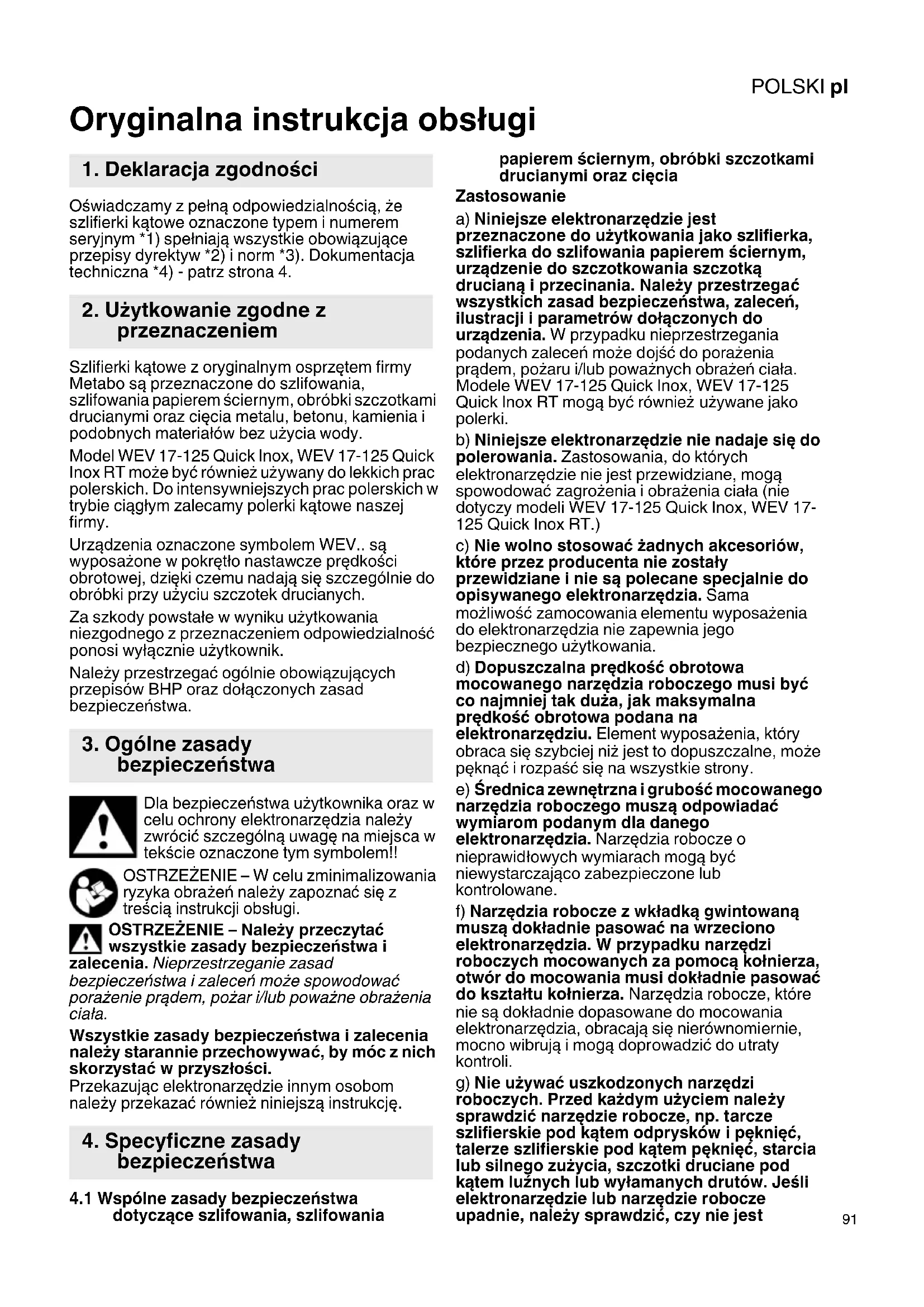 Oryginalna instrukcja obsługi Oświadczamy z pełną odpowiedzialnością, że szlifierki kątowe oznaczone typem i numerem seryjnym *1) spełniają wszystkie obowiązujące przepisy dyrektyw *2) i norm *3). Dokumentacja techniczna *4) - patrz strona 4. Szlifierki kątowe z oryginalnym osprzętem firmy Metabo są przeznaczone do szlifowania, szlifowania papierem ściernym, obróbki szczotkami drucianymi oraz cięcia metalu, betonu, kamienia i podobnych materiałów bez użycia wody. Model WEV 17-125 Quick Inox, WEV 17-125 Quick Inox RT może być również używany do lekkich prac polerskich. Do intensywniejszych prac polerskich w trybie ciągłym zalecamy polerki kątowe naszej firmy. Urządzenia oznaczone symbolem WEV.. są wyposażone w pokrętło nastawcze prędkości obrotowej, dzięki czemu nadają się szczególnie do obróbki przy użyciu szczotek drucianych. Za szkody powstałe w wyniku użytkowania niezgodnego z przeznaczeniem odpowiedzialność ponosi wyłą cznie użytkownik. Należy przestrzegać ogólnie obowiązujących przepisów BHP oraz dołączonych zasad bezpieczeństwa. Dla bezpieczeństwa użytkownika oraz w celu ochrony elektronarzędzia należy zwrócić szczególną uwagę na miejsca w tekście oznaczone tym symbolem!! OSTRZEŻENIE – W celu zminimalizowania ryzyka obrażeń należy zapoznać się z treścią instrukcji obsługi. OSTRZEŻENIE – Należy przeczytać wszystkie zasady bezpieczeństwa i zalecenia. Nieprzestrzeganie zasad bezpieczeństwa i zaleceń może spowodować porażenie prądem, pożar i/lub poważne obrażenia ciała. Wszystkie zasady bezpieczeństwa i zalecenia należy starannie przechowywa ć, by móc z nich skorzystać w przyszłości. Przekazując elektronarzędzie innym osobom należy przekazać również niniejszą instrukcję.