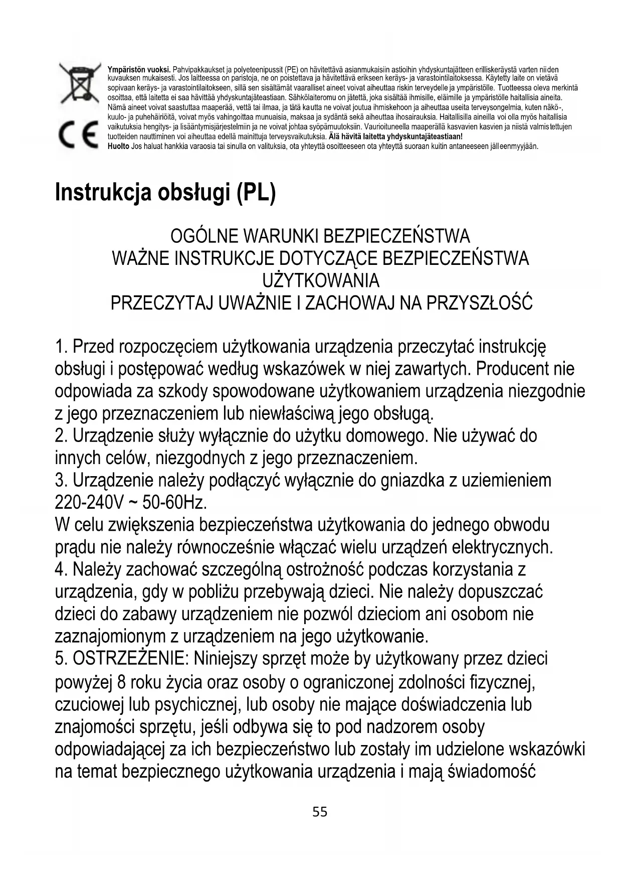 5. OSTRZEŻENIE: Niniejszy sprzęt może by użytkowany przez dzieci