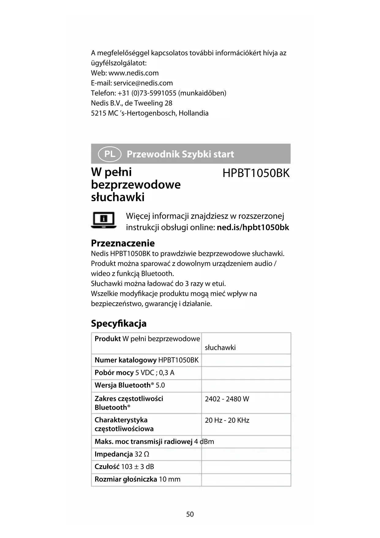 HPBT1050BK - Słuchawki NEDIS - Bezpłatna instrukcja obsługi