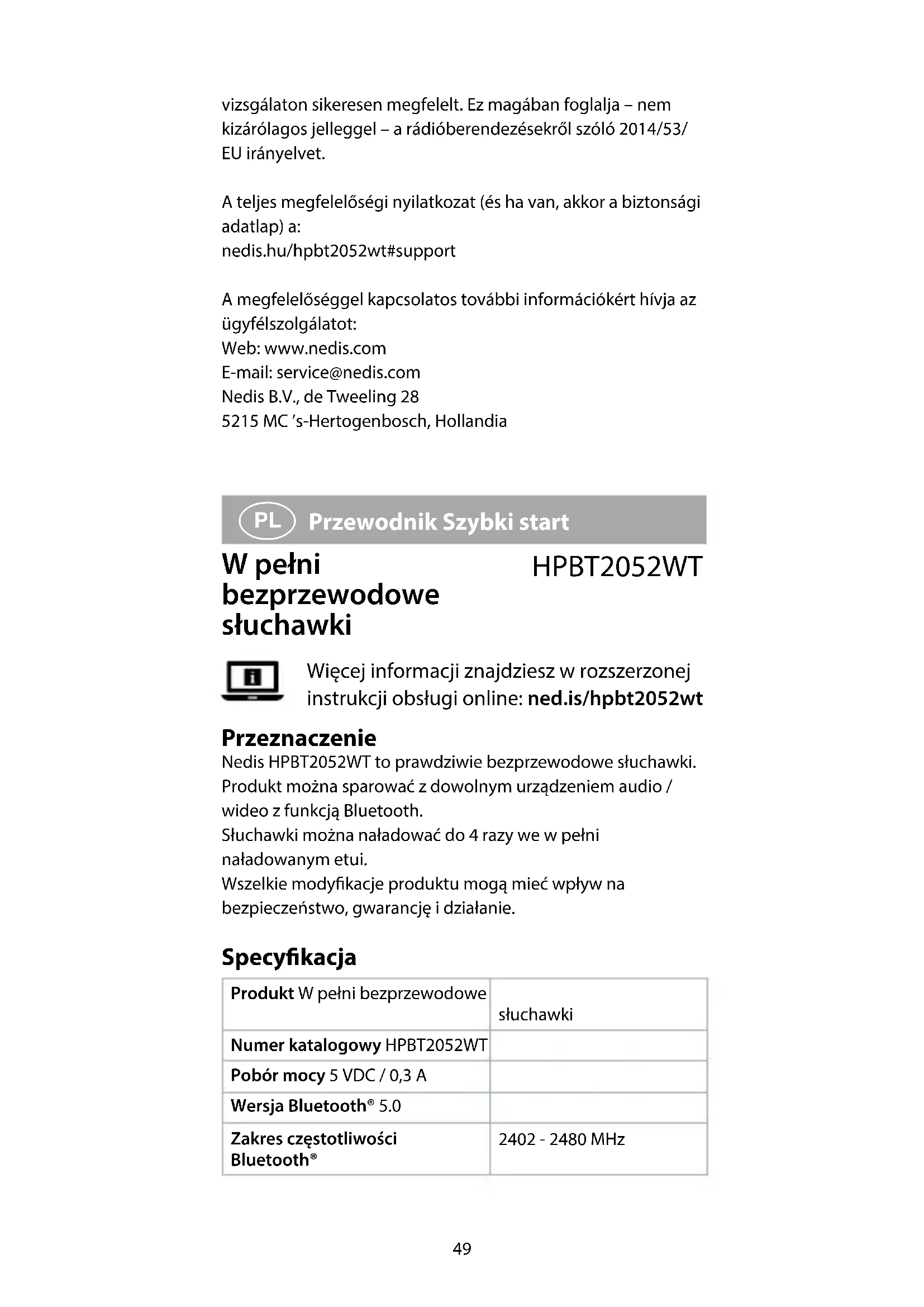 , aby przejść do poprzedniego utworu. Korzystanie z asystenta głosowego Dotknij i przytrzymaj A5 lub Aq przez 3 sek., aby aktywować funkcję Siri/Google Assistant. Deklaracja zgodności Niniejszym rma Nedis B.V. deklaruje jako producent, że produkt HPBT2052WT naszej marki Nedis®, produkowany w Chinach, został przetestowany zgodnie ze wszystkimi53 odpowiednimi normami i przepisami WE oraz że we wszystkich testach uzyskał on pozytywny rezultat. Obejmuje to, ale nie ogranicza się do rozporządzenia RED 2014/53/UE. Pełną deklarację zgodności (oraz kartę danych bezpieczeństwa, jeśli dotyczy) można znaleźć i pobrać tutaj: nedis.pl/hpbt2052wt#support Aby uzyskać dodatkowe informacje dotyczące zgodności, skontaktuj się z obsługą klienta: Strona www: www.nedis.com E-mail: service@nedis.com Nedis B.V., de Tweeling 28 5215 MC ’s-Hertogenbosch, Holandia.
