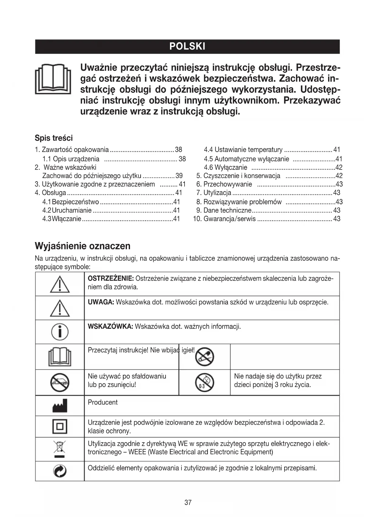 Spis treści Wyjaśnienie oznaczen Na urządzeniu, w instrukcji obsługi, na opakowaniu i tabliczce znamionowej urządzenia zastosowano na- stępujące symbole: OSTRZEŻENIE: Ostrzeżenie związane z niebezpieczeństwem skaleczenia lub zagroże- niem dla zdrowia. UWAGA: Wskazówka dot. możliwości powstania szkód w urządzeniu lub osprzęcie. WSKAZÓWKA: Wskazówka dot. ważnych informacji. Przeczytaj instrukcje! Nie wbijać igieł! Nie używać po sfałdowaniu lub po zsunięciu! Nie nadaje się do użytku przez dzieci poniżej 3roku życia. Producent Urządzenie jest podwójnie izolowane ze względów bezpieczeństwa i odpowiada 2. klasie ochrony. Utylizacja zgodnie z dyrektywą WE w sprawie zużytego sprzętu elektrycznego i elek- tronicznego – WEEE (Waste Electrical and Electronic Equipment) Oddzielić elementy opakowania i zutylizować je zgodnie z lokalnymi przepisami. Uważnie przeczytać niniejszą instrukcję obsługi. Przestrze- gaćostrzeżeń iwskazówek bezpieczeństwa. Zachować in- strukcję obsługi do późniejszego wykorzystania. Udostęp- niać instrukcję obsługi innym użytkownikom. Przekazywać urządzenie wraz zinstrukcją obsługi.38