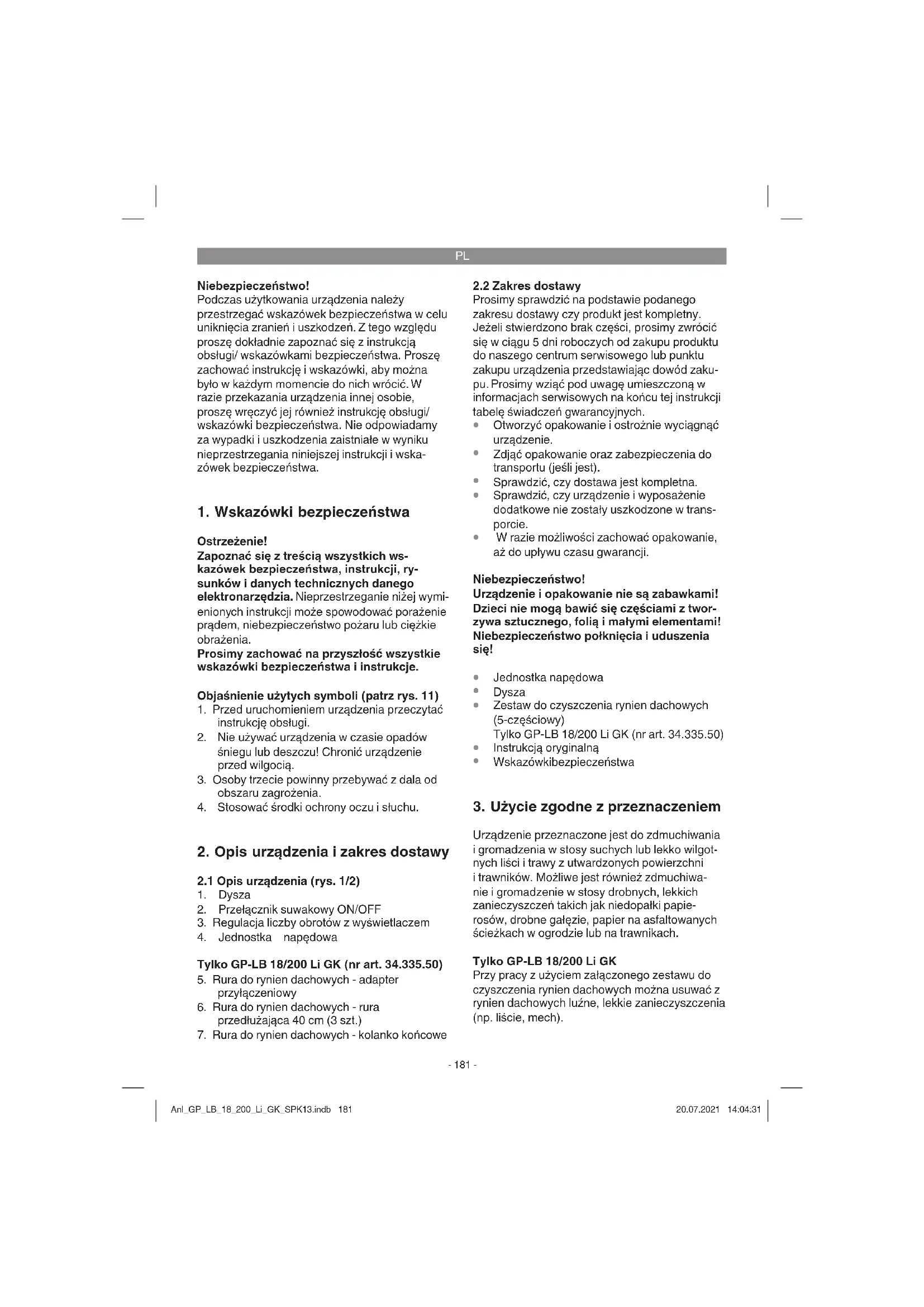 Urządzenie przeznaczone jest do zdmuchiwania i gromadzenia w stosy suchych lub lekko wilgot- nych liści i trawy z utwardzonych powierzchni i trawników. Możliwe jest również zdmuchiwa- nie i gromadzenie w stosy drobnych, lekkich zanieczyszczeń takich jak niedopałki papie- rosów, drobne gałęzie, papier na asfaltowanych ścieżkach w ogrodzie lub na trawnikach. Tylko GP-LB 18/200 Li GK Przy pracy z użyciem załączonego zestawu do czyszczenia rynien dachowych można usuwać z rynien dachowych luźne, lekkie zanieczyszczenia (np. liście, mech). Anl_GP_LB_18_200_Li_GK_SPK13.indb 181Anl_GP_LB_18_200_Li_GK_SPK13.indb 181 20.07.2021 14:04:3120.07.2021 14:04:31PL