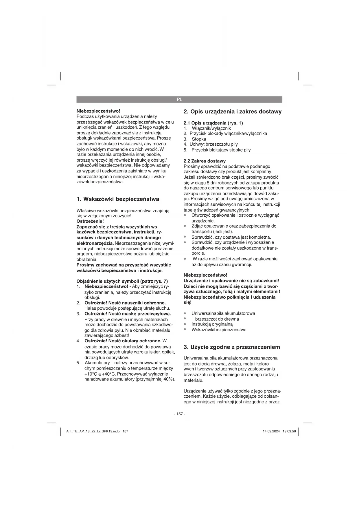 Uniwersalna piła akumulatorowa przeznaczona jest do cięcia drewna, żelaza, metali koloro- wych i tworzyw sztucznych przy zastosowaniu brzeszczotu odpowiedniego do danego rodzaju materiału. Urządzenie używać tylko zgodnie z jego przezna- czeniem. Każde użycie, odbiegające od opisan- ego w niniejszej instrukcji jest niezgodne z przez- Anl_TE_AP_18_22_Li_SPK13.indb 157Anl_TE_AP_18_22_Li_SPK13.indb 157 14.03.2024 13:03:5614.03.2024 13:03:56PL