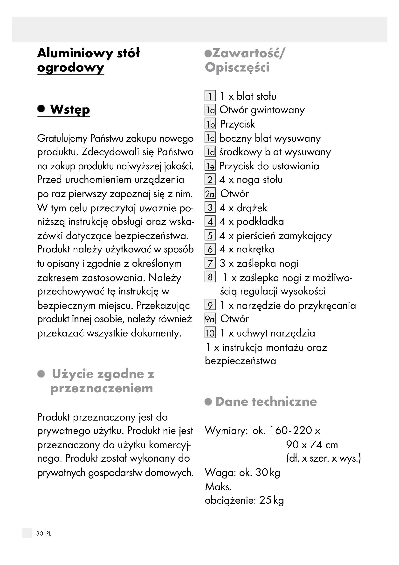 , aż słyszalnie zaskoczy (rys. J). Czyszczenie i pielęgnacja Czyścić produkt wilgotną ściereczką, w razie potrzeby z dodatkiem łagodnego środka myjącego. Przed ponownym zapakow- aniem produktu należy dobrze osuszyć wszystkie części. Zapo- biega to tworzeniu się pleśni, nieprzyjemnych zapachów i przebarwień. Przechowywanie Produkt przechowywać w chron- ionym, suchym pomieszczeniu. Przechowywać suchy i czysty produkt zawsze w temperaturze pokojowej.34 PL Utylizacja Opakowanie wykonane jest z materiałów przyjaznych dla środo- wiska, które można przekazać do utylizacji w lokalnym punkcie prze- twarzania surowców wtórnych. Informacji na temat możliwości uty- lizacji wyeksploatowanego pro- duktu udziela urząd gminy lub miasta. Gwarancja Produkt wyprodukowano według wysokich standardów jakości i pod- dano skrupulatnej kontroli przed wysyłką. W przypadku wad produktu nabywcy przysługują ustawowe prawa. Gwarancja nie ogranicza ustawowych praw nabywcy pro- duktu. Produkt objęte jest 3 gwarancją, licząc od daty zakupu. Gwarancja wygasa w razie zawinionego przez użytkownika uszkodzenia produktu, niewłaściwego użycia lub konserwacji. W przypadku wystąpienia w ciągu 3 lat od daty zakupu wad materia- łowych lub fabrycznych, dokonujemy – według własnej oceny – bezpłat- nej naprawy lub wymiany produktu. Świadczenie gwarancyjne obej- muje wady materiałowe i fa- bryczne. Gwarancja nie obejmuje części produktu ulegających nor- malnemu zużyciu, uznawanych za części zużywalne (np. baterie) oraz uszkodzeń części łamliwych, np. przełączników, akumulatorów lub wykonanych ze szkła.35 CZ Úvod ...........................................................................................Strana 36 Použití ke stanovenému účelu ....................................................Strana 36 Obsah dodávky / Popis dílů ......................................................Strana 36 Technická data ...........................................................................Strana 36 Bezpečnostní upozornění ...........................................Strana 37 Montáž .....................................................................................Strana 38 Roztahování stolní desky ...........................................................Strana 38 Čistění a ošetřování .........................................................Strana 39 Skladování ............................................................................Strana 39 Zlikvidování .........................................................................Strana 39 Záruka ......................................................................................Strana 3936 CZ Hliníkový zahradní stůl Úvod Blahopřejeme Vám ke koupi nového výrobku. Rozhodli jste se pro kva- litní výrobek. Před prvním uvedením do provozu se seznamte s výrobkem. K tomu si pozorně přečtěte následu- jící návod k obsluze a bezpečnostní pokyny. Používejte výrobek jen po- psaným způsobem a pouze pro uvedené oblasti použití. Uschovejte si tento návod na bezpečném místě. Všechny podklady vydejte při pře- dání výrobku i třetí osobě. Použití ke stanovenému účelu Výrobek je vhodný k privátnímu po- užití. Výrobek není určen pro podni- katelské účely. Výrobek byl vyroben pro privátní obytné prostory. Obsah dodávky / Popis dílů