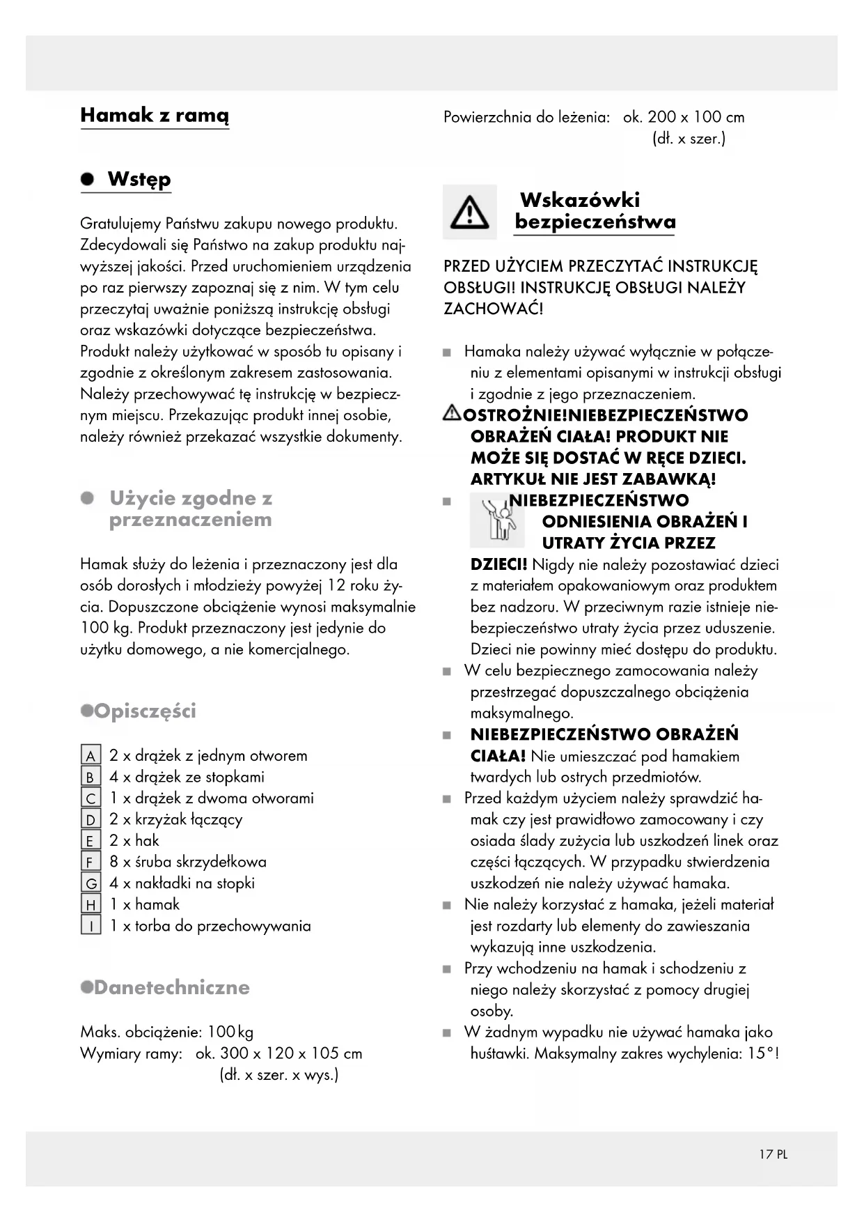 OBSŁUGI! INSTRUKCJĘ OBSŁUGI NALEŻY ZACHOWAĆ! Hamaka należy używać wyłącznie w połącze- niu z elementami opisanymi w instrukcji obsługi i zgodnie z jego przeznaczeniem.