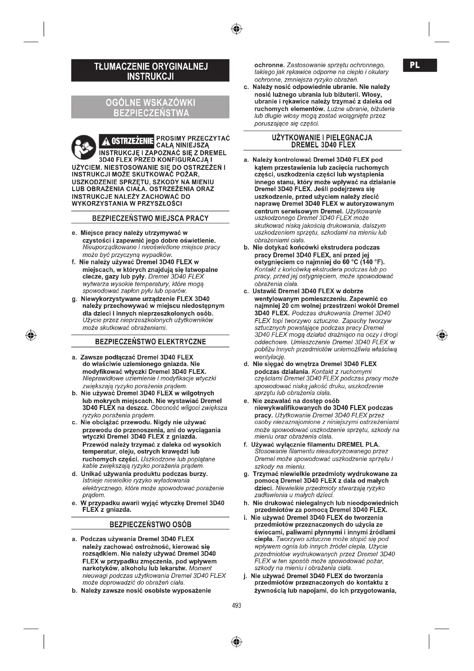 e. Miejsce pracy należy utrzymywać w czystości i zapewnić jego dobre oświetlenie. Nieuporządkowane i nieoświetlone miejsce pracy może być przyczyną wypadków. f. Nie należy używać Dremel 3D40 FLEX w miejscach, w których znajdują się łatwopalne ciecze, gazy lub pyły. Dremel 3D40 FLEX wytwarza wysokie temperatury, które mogą spowodować zapłon pyłu lub oparów.g. Niewykorzystywane urządzenie FLEX 3D40 należy przechowywać w miejscu niedostępnym dla dzieci i innych nieprzeszkolonych osób. Użycie przez nieprzeszkolonych użytkowników może skutkować obrażeniami.