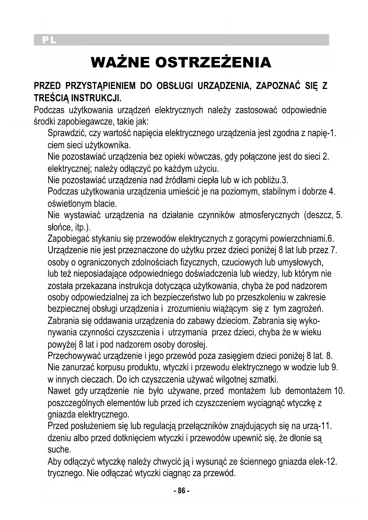 PRZED PRZYSTĄPIENIEM DO OBSŁUGI URZĄDZENIA, ZAPOZNAĆ SIĘ Z TREŚCIĄ INSTRUKCJI. Podczas użytkowania urządzeń elektrycznych należy zastosować odpowiednie środki zapobiegawcze, takie jak: Sprawdzić, czy wartość napięcia elektrycznego urządzenia jest zgodna z napię-1. ciem sieci użytkownika. Nie pozostawiać urządzenia bez opieki wówczas, gdy połączone jest do sieci 2. elektrycznej; należy odłączyć po każdym użyciu. Nie pozostawiać urządzenia nad źródłami ciepła lub w ich pobliżu.3. Podczas użytkowania urządzenia umieścić je na poziomym, stabilnym i dobrze 4. oświetlonym blacie. Nie wystawiać urządzenia na działanie czynników atmosferycznych (deszcz, 5. słońce, itp.). Zapobiegać stykaniu się przewodów elektrycznych z gorącymi powierzchniami.6. Urządzenie nie jest przeznaczone do użytku przez dzieci poniżej 8 lat lub przez 7. osoby o ograniczonych zdolnościach fizycznych, czuciowych lub umysłowych, lub też nieposiadające odpowiedniego doświadczenia lub wiedzy, lub którym nie została przekazana instrukcja dotycząca użytkowania, chyba że pod nadzorem osoby odpowiedzialnej za ich bezpieczeństwo lub po przeszkoleniu w zakresie bezpiecznej obsługi urządzenia i zrozumieniu wiążącym się z tym zagrożeń. Zabrania się oddawania urządzenia do zabawy dzieciom. Zabrania się wyko- nywania czynności czyszczenia i utrzymania przez dzieci, chyba że w wieku powyżej 8 lat i pod nadzorem osoby dorosłej. Przechowywać urządzenie i jego przewód poza zasięgiem dzieci poniżej 8 lat. 8. Nie zanurzać korpusu produktu, wtyczki i przewodu elektrycznego w wodzie lub 9. w innych cieczach. Do ich czyszczenia używać wilgotnej szmatki. Nawet gdy urządzenie nie było używane, przed montażem lub demontażem 10. poszczególnych elementów lub przed ich czyszczeniem wyciągnąć wtyczkę z gniazda elektrycznego. Przed posłużeniem się lub regulacją przełączników znajdujących się na urzą-11. dzeniu albo przed dotknięciem wtyczki i przewodów upewnić się, że dłonie są suche. Aby odłączyć wtyczkę należy chwycić ją i wysunąć ze ściennego gniazda elek-12. trycznego. Nie odłączać wtyczki ciągnąc za przewód.PL