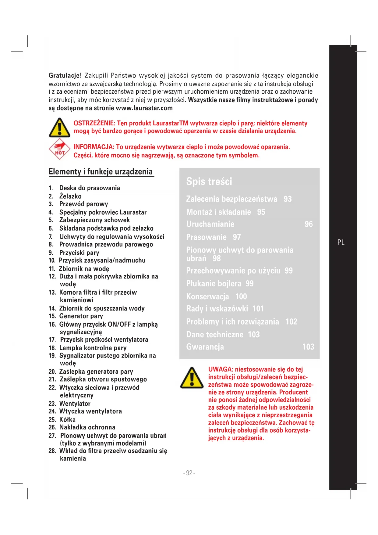 cional produz efeitos a partir de junho de 2017.- 92 - UWAGA: niestosowanie się do tej instrukcji obsługi/zaleceń bezpiec- zeństwa może spowodować zagroże- nie ze strony urządzenia. Producent nie ponosi żadnej odpowiedzialności za szkody materialne lub uszkodzenia ciała wynikające z nieprzestrzegania zaleceń bezpieczeństwa. Zachować tę instrukcję obsługi dla osób korzysta- jących z urządzenia. OSTRZEŻENIE: Ten produkt LaurastarTM wytwarza ciepło i parę; niektóre elementy mogą być bardzo gorące i powodować oparzenia w czasie działania urządzenia. INFORMACJA: To urządzenie wytwarza ciepło i może powodować oparzenia. Części, które mocno się nagrzewają, są oznaczone tym symbolem. Spis treści Zalecenia bezpieczeństwa 93 Montaż i składanie 95 Uruchamianie 96 Prasowanie 97 Pionowy uchwyt do parowania ubrań 98 Przechowywanie po użyciu 99 Płukanie bojlera 99 Konserwacja 100 Rady i wskazówki 101 Problemy i ich rozwiązania 102 Dane techniczne 103 Gwarancja 103 Gratulacje! Zakupili Państwo wysokiej jakości system do prasowania łączący eleganckie wzornictwo ze szwajcarską technologią. Prosimy o uważne zapoznanie się z tą instrukcją obsługi i z zaleceniami bezpieczeństwa przed pierwszym uruchomieniem urządzenia oraz o zachowanie instrukcji, aby móc korzystać z niej w przyszłości. Wszystkie nasze fi lmy instruktażowe i porady są dostępne na stronie www.laurastar.com Elementy i funkcje urządzenia