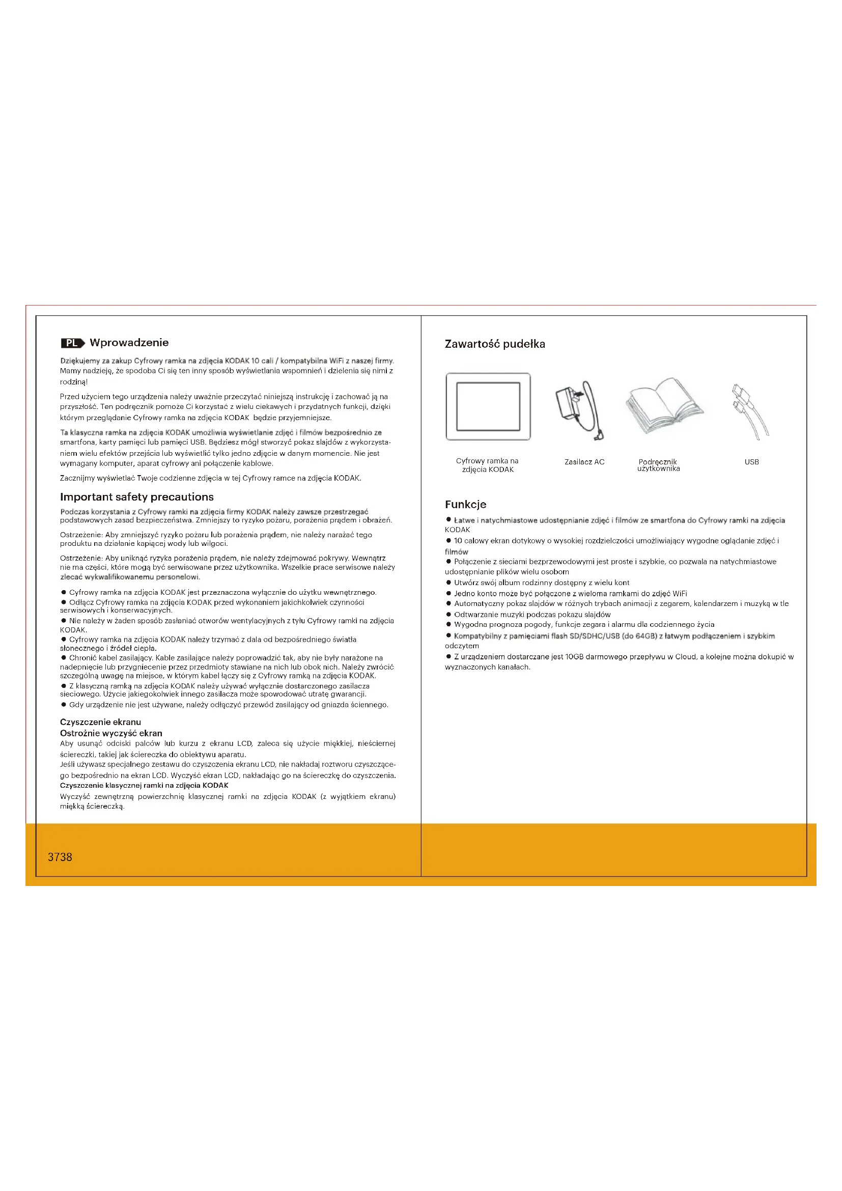 Impostazioni 35 36PL podstawowych zasad bezpieczeństwa. Zmniejszy to ryzyko pożaru, porażenia prądem i obrażeń. Ostrzeżenie: Aby zmniejszyć ryzyko pożaru lub porażenia prądem, nie należy narażać tego produktu na działanie kapiącej wody lub wilgoci. Ostrzeżenie: Aby uniknąć ryzyka porażenia prądem, nie należy zdejmować pokrywy. Wewnątrz nie ma części, które mogą być serwisowane przez użytkownika. Wszelkie prace serwisowe należy Cyfrowy ramka na zdjęcia KODAK jest przeznaczona wyłącznie do użytku wewnętrznego. Odłącz Cyfrowy ramka na zdjęcia KODAK przed wykonaniem jakichkolwiek czynności serwisowych i konserwacyjnych. Nie należy w żaden sposób zasłaniać otworów wentylacyjnych z tyłu Cyfrowy ramki na zdjęcia KODAK. Cyfrowy ramka na zdjęcia KODAK należy trzymać z dala od bezpośredniego światła słonecznego i źródeł ciepła. Chronić kabel zasilający. Kable zasilające należy poprowadzić tak, aby nie były narażone na nadepnięcie lub przygniecenie przez przedmioty stawiane na nich lub obok nich. Należy zwrócić szczególną uwagę na miejsce, w którym kabel łączy się z Cyfrowy ramką na zdjęcia KODAK. Z klasyczną ramką na zdjęcia KODAK należy używać wyłącznie dostarczonego zasilacza sieciowego. Użycie jakiegokolwiek innego zasilacza może spowodować utratę gwarancji. Gdy urządzenie nie jest używane, należy odłączyć przewód zasilający od gniazda ściennego. Mamy nadzieję, że spodoba Ci się ten inny sposób wyświetlania wspomnień i dzielenia się nimi z rodziną! Przed użyciem tego urządzenia należy uważnie przeczytać niniejszą instrukcję i zachować ją na przyszłość. Ten podręcznik pomoże Ci korzystać z wielu ciekawych i przydatnych funkcji, dzięki którym przeglądanie Cyfrowy ramka na zdjęcia KODAK będzie przyjemniejsze. smartfona, karty pamięci lub pamięci USB. Będziesz mógł stworzyć pokaz slajdów z wykorzysta- niem wielu efektów przejścia lub wyświetlić tylko jedno zdjęcie w danym momencie. Nie jest wymagany komputer, aparat cyfrowy ani połączenie kablowe. Zacznijmy wyświetlać Twoje codzienne zdjęcia w tej Cyfrowy ramce na zdjęcia KODAK. Czyszczenie ekranu Ostrożnie wyczyść ekran Aby usunąć odciski palców lub kurzu z ekranu LCD, zaleca się użycie miękkiej, nieściernej ściereczki, takiej jak ściereczka do obiektywu aparatu. Jeśli używasz specjalnego zestawu do czyszczenia ekranu LCD, nie nakładaj roztworu czyszczące- go bezpośrednio na ekran LCD. Wyczyść ekran LCD, nakładając go na ściereczkę do czyszczenia. Czyszczenie klasycznej ramki na zdjęcia KODAK Wyczyść zewnętrzną powierzchnię klasycznej ramki na zdjęcia KODAK (z wyjątkiem ekranu) miękką ściereczką. Zawartość pudełka Funkcje