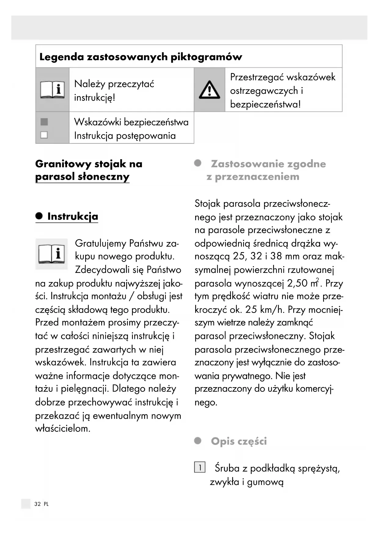 stevig vastdraaien (zie afb. F). Opbergen en onderhoud De graniet voet is onderhoudsvrij. Verwijder eventuele verontreini- gingen met een beetje warm zeepsop. Indien nodig de schroeven opnieuw vastdraaien. Graniet voet, als deze niet in gebruik is, bijv. tijdens de winter, droog opbergen. Voor het ruimtebesparend op- bergen demonteert u de voetplaat in omgekeerde volg- orde zoals bij „Voetplaat monte- ren“ beschreven. Edelstaal onderdelen: De edelstalen buis indien nodig alstublieft met auto-chroom ver- zorgingsproducten of edelstaal verzorgingslotion behandelen. Service SunRain Handels GmbH Bahnhofstrasse 63 4910 Ried OOSTENRIJK gardenservice@gmx.at IAN 354883_2004 Granieten parasolstandaard rechthoekig IAN 354884_2004 Granieten parasolstandaard rond Houd bij alle vragen alstublieft de kassabon en het artikelnummer (bijv. IAN 123456_7890) als be- wijs van aankoop bij de hand.30 NL/BE Afvoer De verpakking bestaat uit milieu- vriendelijke grondstoffen die u via de plaatselijke recyclingcontainers kunt afvoeren. Het product kunt u, als het heeft uitgediend, via het normale huisvuil afvoeren.31 PL Legenda zastosowanych piktogramów........................Strona 32 Instrukcja ....................................................................................Strona 32 Zastosowanie zgodne z przeznaczeniem .................................Strona 32 Opis części ..................................................................................Strona 32 Dane techniczne ..........................................................................Strona 33 Wskazówki bezpieczeństwa .............................................Strona 34 Montaż .........................................................................................Strona 34 Montaż cokołu ............................................................................Strona 34 Stasowanie wkładek ...................................................................Strona 35 Przechowywanie i pielęgnacja ......................................... Strona 35 Serwis...........................................................................................Strona 36 Utylizacja .................................................................................... Strona 3632 PL Legenda zastosowanych piktogramów Należy przeczytać instrukcję! Przestrzegać wskazówek ostrzegawczych i bezpieczeństwa! Wskazówki bezpieczeństwa Instrukcja postępowania Granitowy stojak na parasol słoneczny Instrukcja Gratulujemy Państwu za- kupu nowego produktu. Zdecydowali się Państwo na zakup produktu najwyższej jako- ści. Instrukcja montażu / obsługi jest częścią składową tego produktu. Przed montażem prosimy przeczy- tać w całości niniejszą instrukcję i przestrzegać zawartych w niej wskazówek. Instrukcja ta zawiera ważne informacje dotyczące mon- tażu i pielęgnacji. Dlatego należy dobrze przechowywać instrukcję i przekazać ją ewentualnym nowym właścicielom. Zastosowanie zgodne z przeznaczeniem Stojak parasola przeciwsłonecz- nego jest przeznaczony jako stojak na parasole przeciwsłoneczne z odpowiednią średnicą drążka wy- noszącą 25, 32 i 38 mm oraz mak- symalnej powierzchni rzutowanej parasola wynoszącej 2,50 m