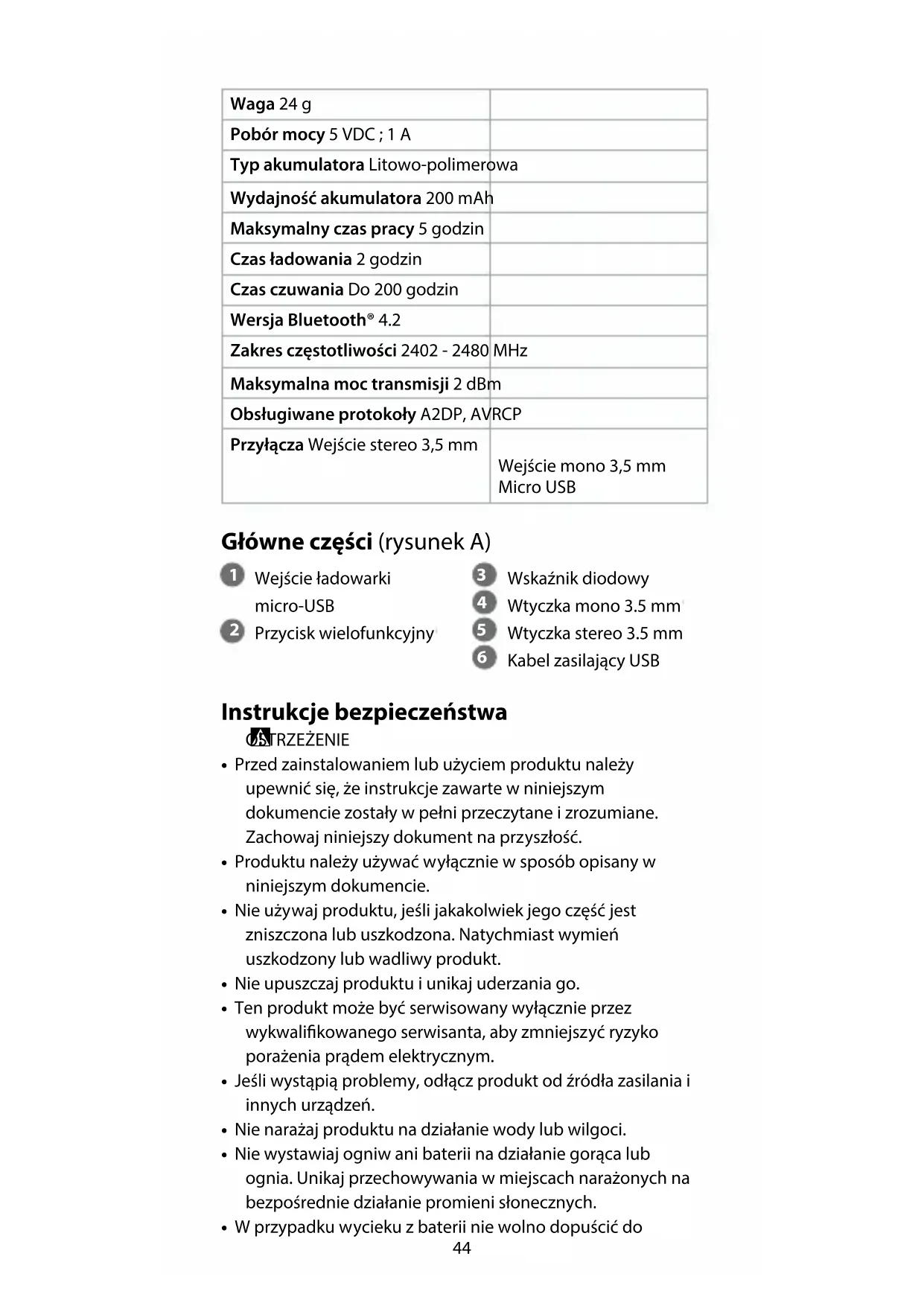 Przewodnik Szybki start Samolotowy nadajnik Bluetooth® BTTR400BK Więcej informacji znajdziesz w rozszerzonej instrukcji obsługi online: ned.is/bttr400bk Przeznaczenie BTTR400BK można podłączyć do wyjścia audio w samolocie, aby przesyłać dźwięk do słuchawek bezprzewodowych Bluetooth. Produkt jest przeznaczony wyłącznie do użytku wewnątrz pomieszczeń. Produkt nie jest przeznaczony do użytku zawodowego. Wszelkie modykacje produktu mogą mieć wpływ na bezpieczeństwo, gwarancję i działanie. Specykacja Produkt Samolotowy nadajnik Bluetooth® Numer katalogowy BTTR400BK Wymiary (dł. x szer. x wys.) 46,5 x 45 x 14 mm44 Waga 24 g Pobór mocy 5 VDC ; 1 A Typ akumulatora Litowo-polimerowa Wydajność akumulatora 200 mAh Maksymalny czas pracy 5 godzin Czas ładowania 2 godzin Czas czuwania Do 200 godzin Wersja Bluetooth® 4.2 Zakres częstotliwości 2402 - 2480 MHz Maksymalna moc transmisji 2 dBm Obsługiwane protokoły A2DP, AVRCP Przyłącza Wejście stereo 3,5 mm Wejście mono 3,5 mm Micro USB Główne części (rysunek A)