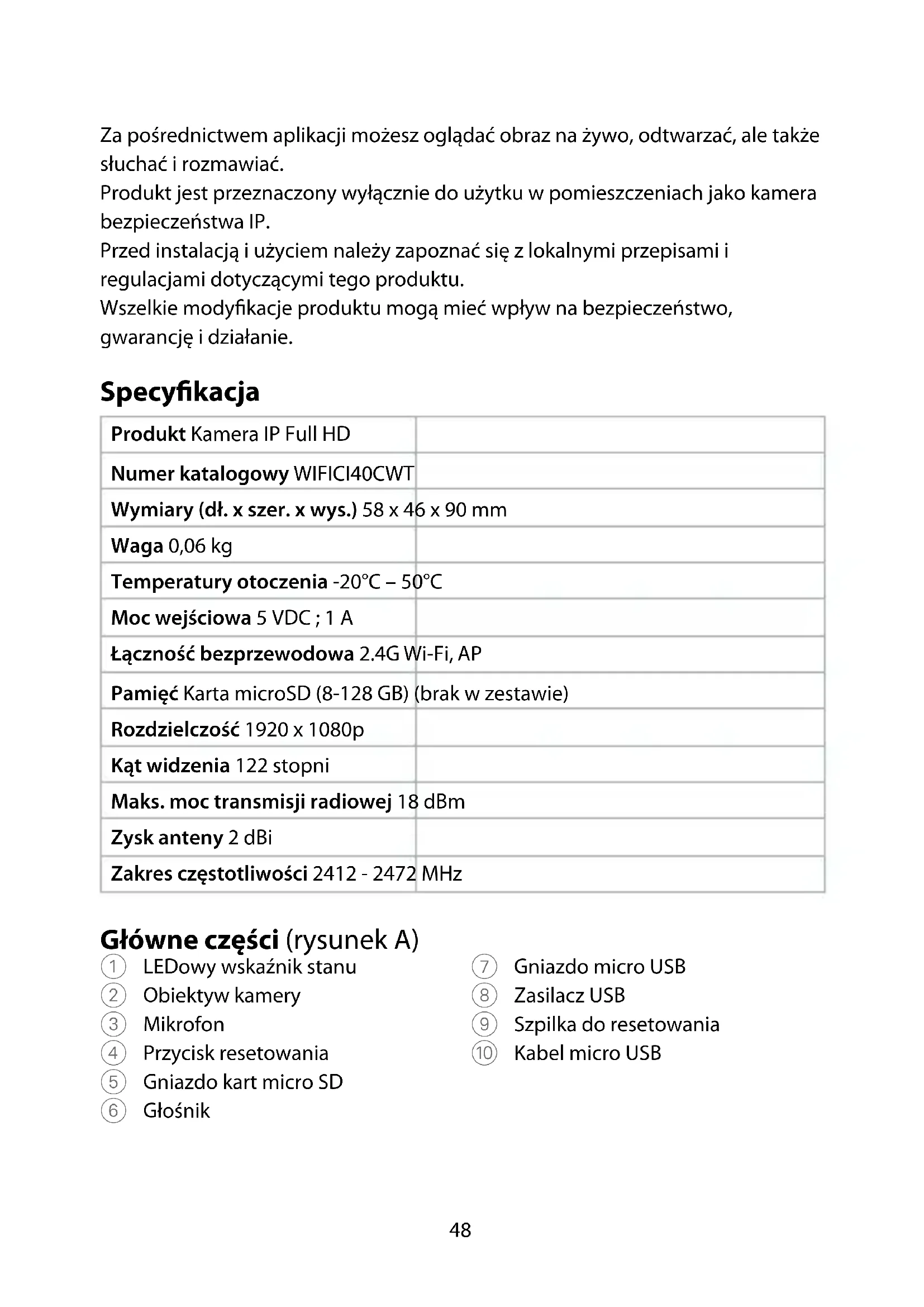 Przewodnik Szybki start Kamera IP Full HD WIFICI40CWT Więcej informacji znajdziesz w rozszerzonej instrukcji obsługi online: ned.is/wici40cwt Przeznaczenie Urządzenie Nedis WIFICI40CWT to kamera bezpieczeństwa IP o kącie widzenia 122 stopni. Gdy kamera wykryje ruch lub dźwięk, otrzymasz komunikat ostrzegawczy na telefon.48 Za pośrednictwem aplikacji możesz oglądać obraz na żywo, odtwarzać, ale także słuchać i rozmawiać. Produkt jest przeznaczony wyłącznie do użytku w pomieszczeniach jako kamera bezpieczeństwa IP. Przed instalacją i użyciem należy zapoznać się z lokalnymi przepisami i regulacjami dotyczącymi tego produktu. Wszelkie modykacje produktu mogą mieć wpływ na bezpieczeństwo, gwarancję i działanie. Specykacja Produkt Kamera IP Full HD Numer katalogowy WIFICI40CWT Wymiary (dł. x szer. x wys.) 58 x 46 x 90 mm Waga 0,06 kg Temperatury otoczenia -20°C – 50°C Moc wejściowa 5 VDC ; 1 A Łączność bezprzewodowa 2.4G Wi-Fi, AP Pamięć Karta microSD (8-128 GB) (brak w zestawie) Rozdzielczość 1920 x 1080p Kąt widzenia 122 stopni Maks. moc transmisji radiowej 18 dBm Zysk anteny 2 dBi Zakres częstotliwości 2412 - 2472 MHz Główne części (rysunek A) 1 LEDowy wskaźnik stanu 2 Obiektyw kamery 3 Mikrofon 4 Przycisk resetowania 5 Gniazdo kart micro SD 6 Głośnik 7 Gniazdo micro USB 8 Zasilacz USB 9 Szpilka do resetowania q Kabel micro USB49 Instrukcje bezpieczeństwa