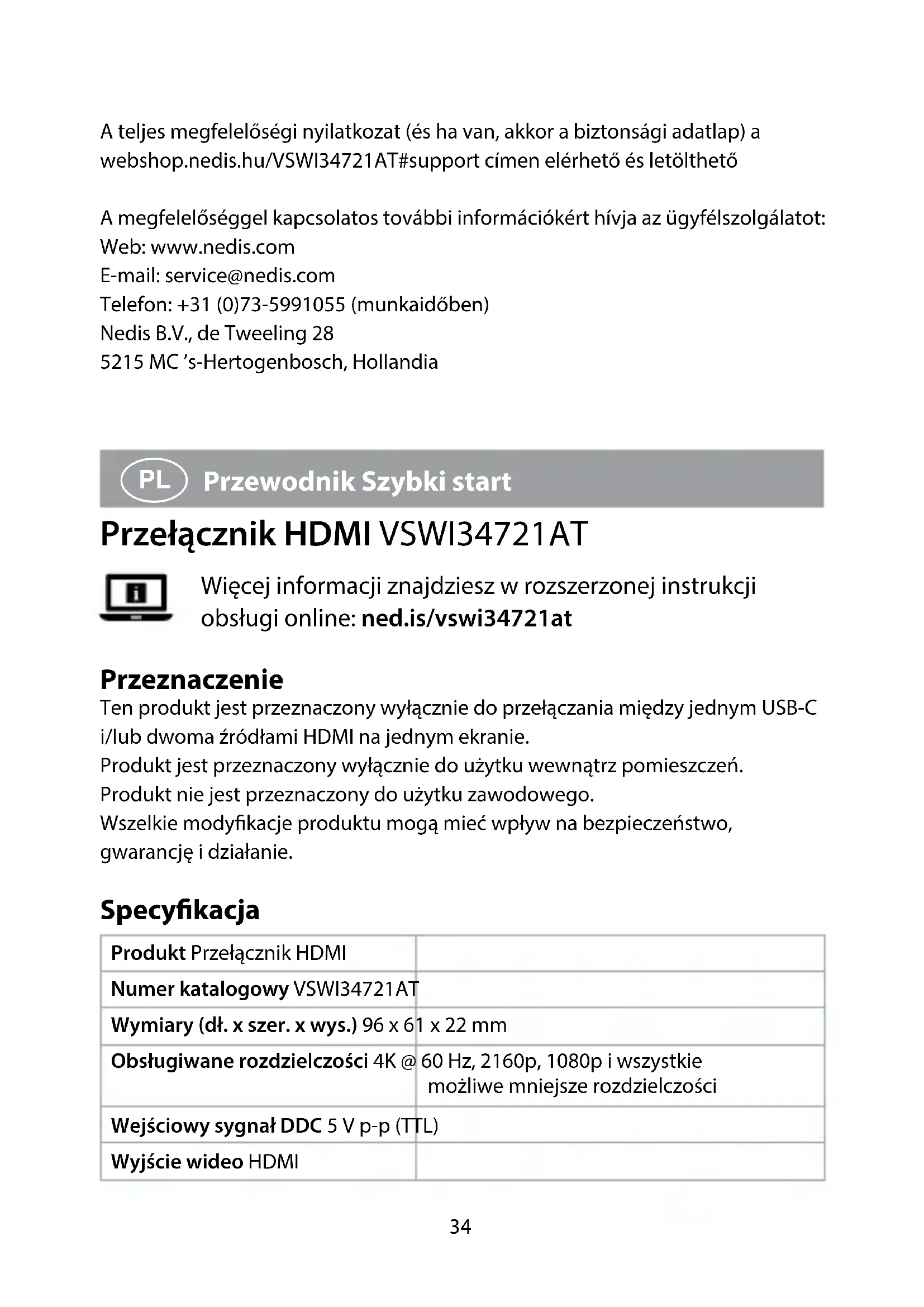 Znajdź bezpłatnie instrukcję urządzenia VSWI34721AT NEDIS w formacie PDF.