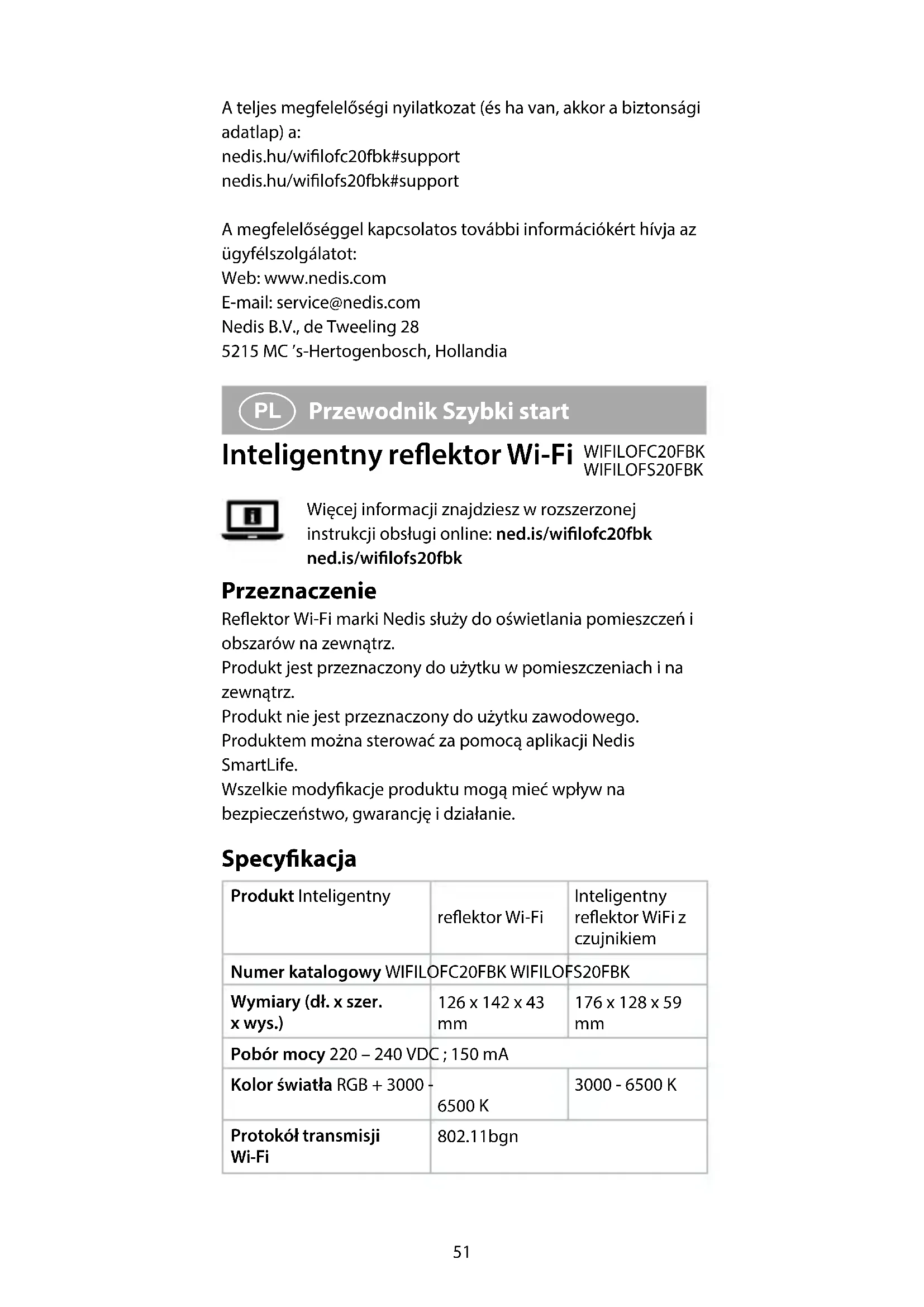 Po zakończeniu okresu świecenia produkt przechodzi w tryb czuwania. Deklaracja zgodności Niniejszym rma Nedis B.V. deklaruje jako producent, że produkt WIFILOFC20FBK / WIFILOFS20FBK naszej marki Nedis