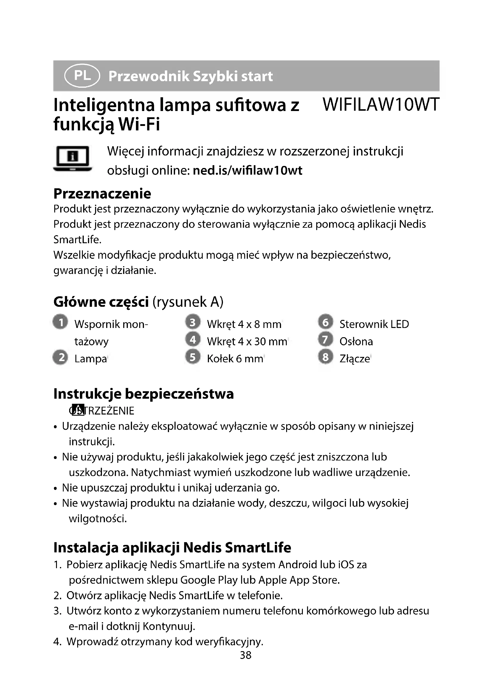Przewodnik Szybki start Inteligentna lampa sutowa z funkcją Wi-Fi WIFILAW10WT Więcej informacji znajdziesz w rozszerzonej instrukcji obsługi online: ned.is/wilaw10wt Przeznaczenie Produkt jest przeznaczony wyłącznie do wykorzystania jako oświetlenie wnętrz.Produkt jest przeznaczony do sterowania wyłącznie za pomocą aplikacji Nedis SmartLife.Wszelkie modykacje produktu mogą mieć wpływ na bezpieczeństwo, gwarancję i działanie. Główne części (rysunek A)