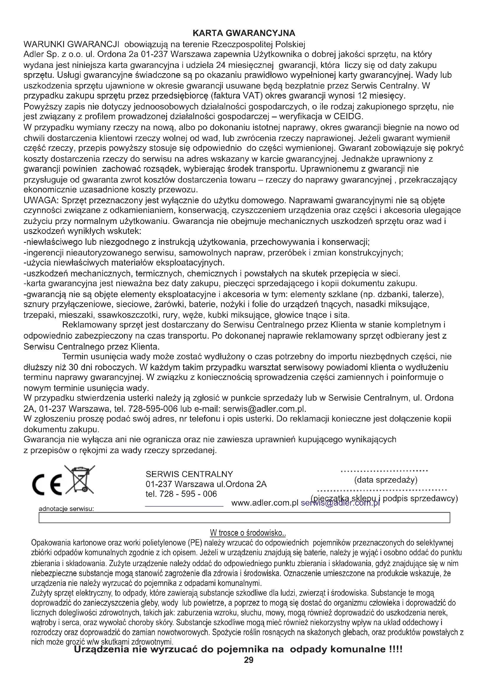 Zaščita okolja Prosimo ločite kartonske škatle od plastičnih vreč, ter jih odvrzite v primerne koše za smeti. Odslužene naprave zavrzite v zbirne centre zaradi nevarnih komponent, ki lahko ogrožajo okolje. Naprave ne zavrzite v navaden koš za smeti. Naprava spada v II izolacijski razred. - Elektromagnetni kompatibilnosti (EMC) Naprava je skladna z direktivami EU o: Naprava ima oznako CE na tipski ploščici. - Nizki napetosti (LVD)29 -gwarancją nie są objęte elementy eksploatacyjne i akcesoria w tym: elementy szklane (np. dzbanki, talerze), sznury przyłączeniowe, sieciowe, żarówki, baterie, nożyki i folie do urządzeń tnących, nasadki miksujące, trzepaki, mieszaki, ssawkoszczotki, rury, węże, kubki miksujące, głowice tnące i sita. Powyższy zapis nie dotyczy jednoosobowych działalności gospodarczych, o ile rodzaj zakupionego sprzętu, nie jest związany z profilem prowadzonej działalności gospodarczej – weryfikacja w CEIDG. KARTA GWARANCYJNA -niewłaściwego lub niezgodnego z instrukcją użytkowania, przechowywania i konserwacji; -ingerencji nieautoryzowanego serwisu, samowolnych napraw, przeróbek i zmian konstrukcyjnych; WARUNKI GWARANCJI obowiązują na terenie Rzeczpospolitej Polskiej Adler Sp. z o.o. ul. Ordona 2a 01-237 Warszawa zapewnia Użytkownika o dobrej jakości sprzętu, na który wydana jest niniejsza karta gwarancyjna i udziela 24 miesięcznej gwarancji, która liczy się od daty zakupu sprzętu. Usługi gwarancyjne świadczone są po okazaniu prawidłowo wypełnionej karty gwarancyjnej. Wady lub uszkodzenia sprzętu ujawnione w okresie gwarancji usuwane będą bezpłatnie przez Serwis Centralny. W przypadku zakupu sprzętu przez przedsiębiorcę (faktura VAT) okres gwarancji wynosi 12 miesięcy. W przypadku wymiany rzeczy na nową, albo po dokonaniu istotnej naprawy, okres gwarancji biegnie na nowo od chwili dostarczenia klientowi rzeczy wolnej od wad, lub zwrócenia rzeczy naprawionej. Jeżeli gwarant wymienił część rzeczy, przepis powyższy stosuje się odpowiednio do części wymienionej. Gwarant zobowiązuje się pokryć koszty dostarczenia rzeczy do serwisu na adres wskazany w karcie gwarancyjnej. Jednakże uprawniony z gwarancji powinien zachować rozsądek, wybierając środek transportu. Uprawnionemu z gwarancji nie przysługuje od gwaranta zwrot kosztów dostarczenia towaru – rzeczy do naprawy gwarancyjnej , przekraczający ekonomicznie uzasadnione koszty przewozu. -użycia niewłaściwych materiałów eksploatacyjnych. UWAGA: Sprzęt przeznaczony jest wyłącznie do użytku domowego. Naprawami gwarancyjnymi nie są objęte czynności związane z odkamienianiem, konserwacją, czyszczeniem urządzenia oraz części i akcesoria ulegające zużyciu przy normalnym użytkowaniu. Gwarancja nie obejmuje mechanicznych uszkodzeń sprzętu oraz wad i uszkodzeń wynikłych wskutek: -uszkodzeń mechanicznych, termicznych, chemicznych i powstałych na skutek przepięcia w sieci. Reklamowany sprzęt jest dostarczany do Serwisu Centralnego przez Klienta w stanie kompletnym i odpowiednio zabezpieczony na czas transportu. Po dokonanej naprawie reklamowany sprzęt odbierany jest z Serwisu Centralnego przez Klienta. Termin usunięcia wady może zostać wydłużony o czas potrzebny do importu niezbędnych części, nie dłuższy niż 30 dni roboczych. W każdym takim przypadku warsztat serwisowy powiadomi klienta o wydłużeniu terminu naprawy gwarancyjnej. W związku z koniecznością sprowadzenia części zamiennych i poinformuje o nowym terminie usunięcia wady. W przypadku stwierdzenia usterki należy ją zgłosić w punkcie sprzedaży lub w Serwisie Centralnym, ul. Ordona 2A, 01-237 Warszawa, tel. 728-595-006 lub e-mail: serwis@adler.com.pl. -karta gwarancyjna jest nieważna bez daty zakupu, pieczęci sprzedającego i kopii dokumentu zakupu. W zgłoszeniu proszę podać swój adres, nr telefonu i opis usterki. Do reklamacji konieczne jest dołączenie kopii dokumentu zakupu. Gwarancja nie wyłącza ani nie ogranicza oraz nie zawiesza uprawnień kupującego wynikających z przepisów o rękojmi za wady rzeczy sprzedanej. SERWIS CENTRALNY 01-237 Warszawa ul.Ordona 2A tel. 728 - 595 - 006 www.adler.com.pl serwis@adler.com.pl (data sprzedaży) (pieczątka sklepu i podpis sprzedawcy) adnotacje serwisu: Urządzenia nie wyrzucać do pojemnika na odpady komunalne !!!! Zużyty sprzęt elektryczny, to odpady, które zawierają substancje szkodliwe dla ludzi, zwierząt i środowiska. Substancje te mogą doprowadzić do zanieczyszczenia gleby, wody lub powietrze, a poprzez to mogą się dostać do organizmu człowieka i doprowadzić do licznych dolegliwości zdrowotnych, takich jak: zaburzenia wzroku, słuchu, mowy, mogą również doprowadzić do uszkodzenia nerek, wątroby i serca, oraz wywołać choroby skóry. Substancje szkodliwe mogą mieć również niekorzystny wpływ na układ oddechowy i rozrodczy oraz doprowadzić do zamian nowotworowych. Spożycie roślin rosnących na skażonych glebach, oraz produktów powstałych z nich może grozić w/w skutkami zdrowotnymi. W trosce o środowisko.. Opakowania kartonowe oraz worki polietylenowe (PE) należy wrzucać do odpowiednich pojemników przeznaczonych do selektywnej zbiórki odpadów komunalnych zgodnie z ich opisem. Jeżeli w urządzeniu znajdują się baterie, należy je wyjąć i osobno oddać do punktu zbierania i składowania. Zużyte urządzenie należy oddać do odpowiedniego punktu zbierania i składowania, gdyż znajdujące się w nim niebezpieczne substancje mogą stanowić zagrożenie dla zdrowia i środowiska. Oznaczenie umieszczone na produkcie wskazuje, że urządzenia nie należy wyrzucać do pojemnika z odpadami komunalnymi.30