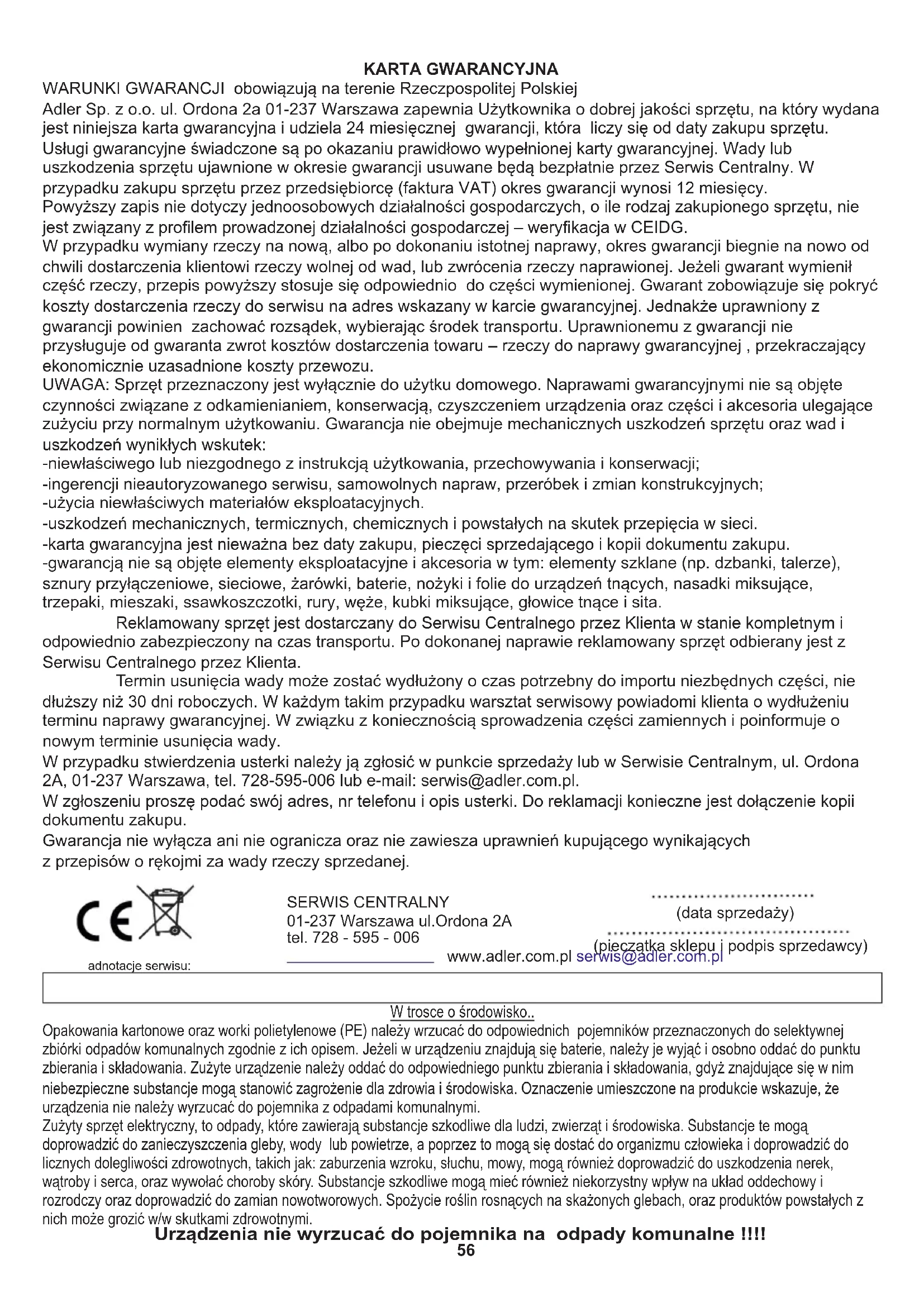 W trosce o środowisko.. Opakowania kartonowe oraz worki polietylenowe (PE) należy wrzucać do odpowiednich pojemników przeznaczonych do selektywnej zbiórki odpadów komunalnych zgodnie z ich opisem. Jeżeli w urządzeniu znajdują się baterie, należy je wyjąć i osobno oddać do punktu zbierania i składowania. Zużyte urządzenie należy oddać do odpowiedniego punktu zbierania i składowania, gdyż znajdujące się w nim niebezpieczne substancje mogą stanowić zagrożenie dla zdrowia i środowiska. Oznaczenie umieszczone na produkcie wskazuje, że urządzenia nie należy wyrzucać do pojemnika z odpadami komunalnymi. Zużyty sprzęt elektryczny, to odpady, które zawierają substancje szkodliwe dla ludzi, zwierząt i środowiska. Substancje te mogą doprowadzić do zanieczyszczenia gleby, wody lub powietrze, a poprzez to mogą się dostać do organizmu człowieka i doprowadzić do licznych dolegliwości zdrowotnych, takich jak: zaburzenia wzroku, słuchu, mowy, mogą również doprowadzić do uszkodzenia nerek, wątroby i serca, oraz wywołać choroby skóry. Substancje szkodliwe mogą mieć również niekorzystny wpływ na układ oddechowy i rozrodczy oraz doprowadzić do zamian nowotworowych. Spożycie roślin rosnących na skażonych glebach, oraz produktów powstałych z nich może grozić w/w skutkami zdrowotnymi. KARTA GWARANCYJNA WARUNKI GWARANCJI obowiązują na terenie Rzeczpospolitej Polskiej W przypadku wymiany rzeczy na nową, albo po dokonaniu istotnej naprawy, okres gwarancji biegnie na nowo od chwili dostarczenia klientowi rzeczy wolnej od wad, lub zwrócenia rzeczy naprawionej. Jeżeli gwarant wymienił część rzeczy, przepis powyższy stosuje się odpowiednio do części wymienionej. Gwarant zobowiązuje się pokryć koszty dostarczenia rzeczy do serwisu na adres wskazany w karcie gwarancyjnej. Jednakże uprawniony z gwarancji powinien zachować rozsądek, wybierając środek transportu. Uprawnionemu z gwarancji nie przysługuje od gwaranta zwrot kosztów dostarczenia towaru – rzeczy do naprawy gwarancyjnej , przekraczający ekonomicznie uzasadnione koszty przewozu. Adler Sp. z o.o. ul. Ordona 2a 01-237 Warszawa zapewnia Użytkownika o dobrej jakości sprzętu, na który wydana jest niniejsza karta gwarancyjna i udziela 24 miesięcznej gwarancji, która liczy się od daty zakupu sprzętu. Usługi gwarancyjne świadczone są po okazaniu prawidłowo wypełnionej karty gwarancyjnej. Wady lub uszkodzenia sprzętu ujawnione w okresie gwarancji usuwane będą bezpłatnie przez Serwis Centralny. W przypadku zakupu sprzętu przez przedsiębiorcę (faktura VAT) okres gwarancji wynosi 12 miesięcy. -ingerencji nieautoryzowanego serwisu, samowolnych napraw, przeróbek i zmian konstrukcyjnych; Termin usunięcia wady może zostać wydłużony o czas potrzebny do importu niezbędnych części, nie dłuższy niż 30 dni roboczych. W każdym takim przypadku warsztat serwisowy powiadomi klienta o wydłużeniu terminu naprawy gwarancyjnej. W związku z koniecznością sprowadzenia części zamiennych i poinformuje o nowym terminie usunięcia wady. -karta gwarancyjna jest nieważna bez daty zakupu, pieczęci sprzedającego i kopii dokumentu zakupu. W zgłoszeniu proszę podać swój adres, nr telefonu i opis usterki. Do reklamacji konieczne jest dołączenie kopii dokumentu zakupu. -niewłaściwego lub niezgodnego z instrukcją użytkowania, przechowywania i konserwacji; Reklamowany sprzęt jest dostarczany do Serwisu Centralnego przez Klienta w stanie kompletnym i odpowiednio zabezpieczony na czas transportu. Po dokonanej naprawie reklamowany sprzęt odbierany jest z Serwisu Centralnego przez Klienta. Powyższy zapis nie dotyczy jednoosobowych działalności gospodarczych, o ile rodzaj zakupionego sprzętu, nie jest związany z profilem prowadzonej działalności gospodarczej – weryfikacja w CEIDG. UWAGA: Sprzęt przeznaczony jest wyłącznie do użytku domowego. Naprawami gwarancyjnymi nie są objęte czynności związane z odkamienianiem, konserwacją, czyszczeniem urządzenia oraz części i akcesoria ulegające zużyciu przy normalnym użytkowaniu. Gwarancja nie obejmuje mechanicznych uszkodzeń sprzętu oraz wad i uszkodzeń wynikłych wskutek: -użycia niewłaściwych materiałów eksploatacyjnych. -gwarancją nie są objęte elementy eksploatacyjne i akcesoria w tym: elementy szklane (np. dzbanki, talerze), sznury przyłączeniowe, sieciowe, żarówki, baterie, nożyki i folie do urządzeń tnących, nasadki miksujące, trzepaki, mieszaki, ssawkoszczotki, rury, węże, kubki miksujące, głowice tnące i sita. W przypadku stwierdzenia usterki należy ją zgłosić w punkcie sprzedaży lub w Serwisie Centralnym, ul. Ordona 2A, 01-237 Warszawa, tel. 728-595-006 lub e-mail: serwis@adler.com.pl. z przepisów o rękojmi za wady rzeczy sprzedanej. -uszkodzeń mechanicznych, termicznych, chemicznych i powstałych na skutek przepięcia w sieci. Gwarancja nie wyłącza ani nie ogranicza oraz nie zawiesza uprawnień kupującego wynikających SERWIS CENTRALNY 01-237 Warszawa ul.Ordona 2A tel. 728 - 595 - 006 www.adler.com.pl serwis@adler.com.pl (data sprzedaży) (pieczątka sklepu i podpis sprzedawcy) adnotacje serwisu: Urządzenia nie wyrzucać do pojemnika na odpady komunalne !!!!57