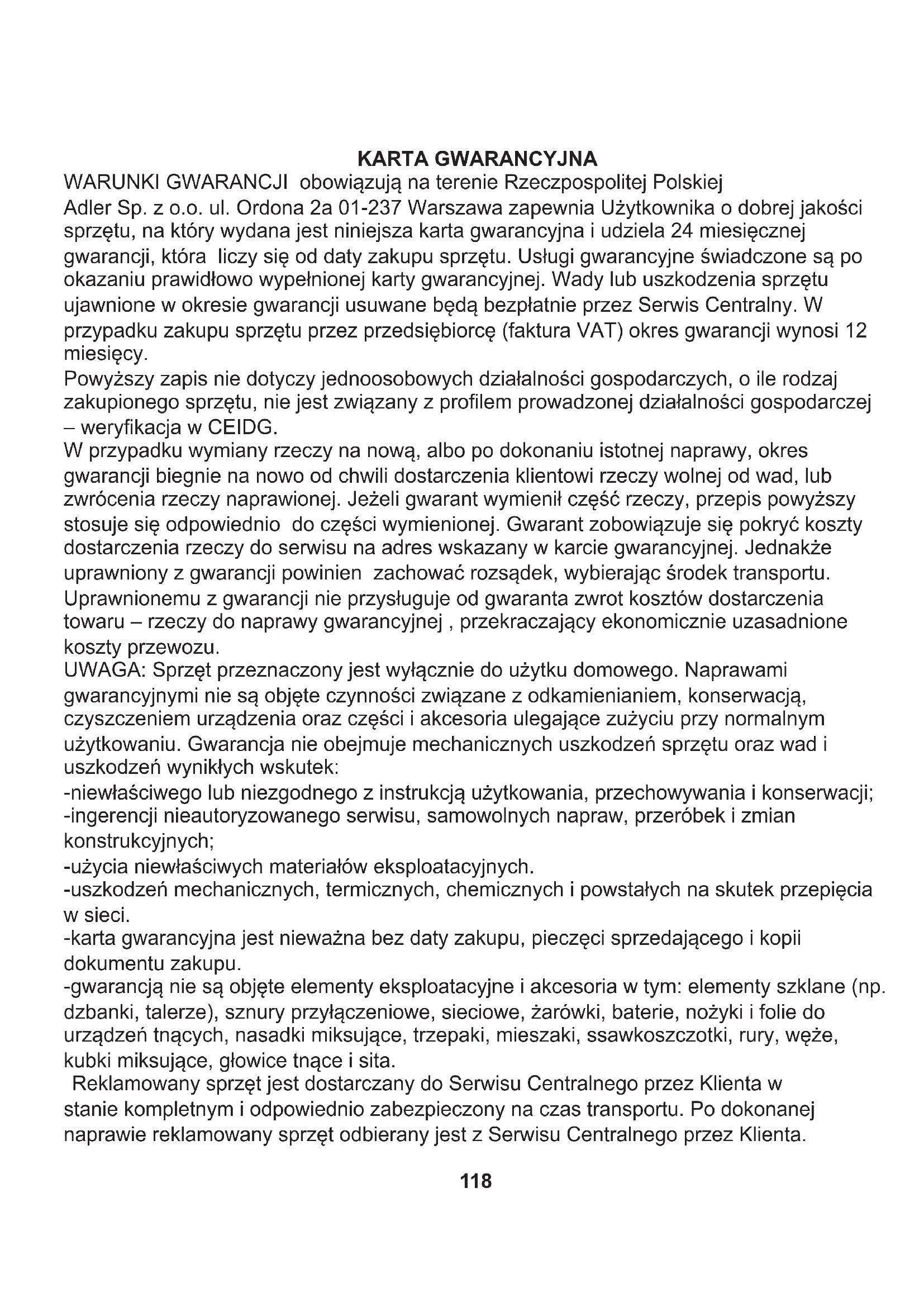 UWAGA: Sprzęt przeznaczony jest wyłącznie do użytku domowego. Naprawami gwarancyjnymi nie są objęte czynności związane z odkamienianiem, konserwacją, czyszczeniem urządzenia oraz części i akcesoria ulegające zużyciu przy normalnym użytkowaniu. Gwarancja nie obejmuje mechanicznych uszkodzeń sprzętu oraz wad i uszkodzeń wynikłych wskutek: W przypadku wymiany rzeczy na nową, albo po dokonaniu istotnej naprawy, okres gwarancji biegnie na nowo od chwili dostarczenia klientowi rzeczy wolnej od wad, lub zwrócenia rzeczy naprawionej. Jeżeli gwarant wymienił część rzeczy, przepis powyższy stosuje się odpowiednio do części wymienionej. Gwarant zobowiązuje się pokryć koszty dostarczenia rzeczy do serwisu na adres wskazany w karcie gwarancyjnej. Jednakże uprawniony z gwarancji powinien zachować rozsądek, wybierając środek transportu. Uprawnionemu z gwarancji nie przysługuje od gwaranta zwrot kosztów dostarczenia towaru – rzeczy do naprawy gwarancyjnej , przekraczający ekonomicznie uzasadnione koszty przewozu. -niewłaściwego lub niezgodnego z instrukcją użytkowania, przechowywania i konserwacji; -ingerencji nieautoryzowanego serwisu, samowolnych napraw, przeróbek i zmian konstrukcyjnych; KARTA GWARANCYJNA WARUNKI GWARANCJI obowiązują na terenie Rzeczpospolitej Polskiej Adler Sp. z o.o. ul. Ordona 2a 01-237 Warszawa zapewnia Użytkownika o dobrej jakości sprzętu, na który wydana jest niniejsza karta gwarancyjna i udziela 24 miesięcznej gwarancji, która liczy się od daty zakupu sprzętu. Usługi gwarancyjne świadczone są po okazaniu prawidłowo wypełnionej karty gwarancyjnej. Wady lub uszkodzenia sprzętu ujawnione w okresie gwarancji usuwane będą bezpłatnie przez Serwis Centralny. W przypadku zakupu sprzętu przez przedsiębiorcę (faktura VAT) okres gwarancji wynosi 12 miesięcy. Powyższy zapis nie dotyczy jednoosobowych działalności gospodarczych, o ile rodzaj zakupionego sprzętu, nie jest związany z profilem prowadzonej działalności gospodarczej – weryfikacja w CEIDG. -użycia niewłaściwych materiałów eksploatacyjnych. -uszkodzeń mechanicznych, termicznych, chemicznych i powstałych na skutek przepięcia w sieci. -karta gwarancyjna jest nieważna bez daty zakupu, pieczęci sprzedającego i kopii dokumentu zakupu. -gwarancją nie są objęte elementy eksploatacyjne i akcesoria w tym: elementy szklane (np. dzbanki, talerze), sznury przyłączeniowe, sieciowe, żarówki, baterie, nożyki i folie do urządzeń tnących, nasadki miksujące, trzepaki, mieszaki, ssawkoszczotki, rury, węże, kubki miksujące, głowice tnące i sita. Reklamowany sprzęt jest dostarczany do Serwisu Centralnego przez Klienta w stanie kompletnym i odpowiednio zabezpieczony na czas transportu. Po dokonanej naprawie reklamowany sprzęt odbierany jest z Serwisu Centralnego przez Klienta.119 W przypadku stwierdzenia usterki należy ją zgłosić w punkcie sprzedaży lub w Serwisie Centralnym, ul. Ordona 2A, 01-237 Warszawa, tel. 728-595-006 lub e-mail: serwis@adler.com.pl. Termin usunięcia wady może zostać wydłużony o czas potrzebny do importu niezbędnych części, nie dłuższy niż 30 dni roboczych. W każdym takim przypadku warsztat serwisowy powiadomi klienta o wydłużeniu terminu naprawy gwarancyjnej. W związku z koniecznością sprowadzenia części zamiennych i poinformuje o nowym terminie usunięcia wady. Gwarancja nie wyłącza ani nie ogranicza oraz nie zawiesza uprawnień kupującego wynikających W zgłoszeniu proszę podać swój adres, nr telefonu i opis usterki. Do reklamacji konieczne jest dołączenie kopii dokumentu zakupu. z przepisów o rękojmi za wady rzeczy sprzedanej. SERWIS CENTRALNY 01-237 Warszawa ul.Ordona 2A tel. 728 - 595 - 006 www.adler.com.pl serwis@adler.com.pl (data sprzedaży) (pieczątka sklepu i podpis sprzedawcy) adnotacje serwisu: Urządzenia nie wyrzucać do pojemnika na odpady komunalne !!!! W trosce o środowisko.. Opakowania kartonowe prosimy przekazać na makulaturę.Worki polietylenowe (PE) wrzucać do pojemnika na plastikZużyte urządzenie należy oddać do odpowiedniego punktu składowania, gdyż znajdujące się w urządzeniu niebezpieczne składniki mogą stanowić zagrożenie dla środowiska. Urządzenie elektryczne należy oddać tak aby ograniczyćjego ponowne użycie i wykorzystanie. Jeżeli w urządzeniuznajdują się baterie należy je wyjąć i oddać do punktu składowania osobno.120 POLSKI