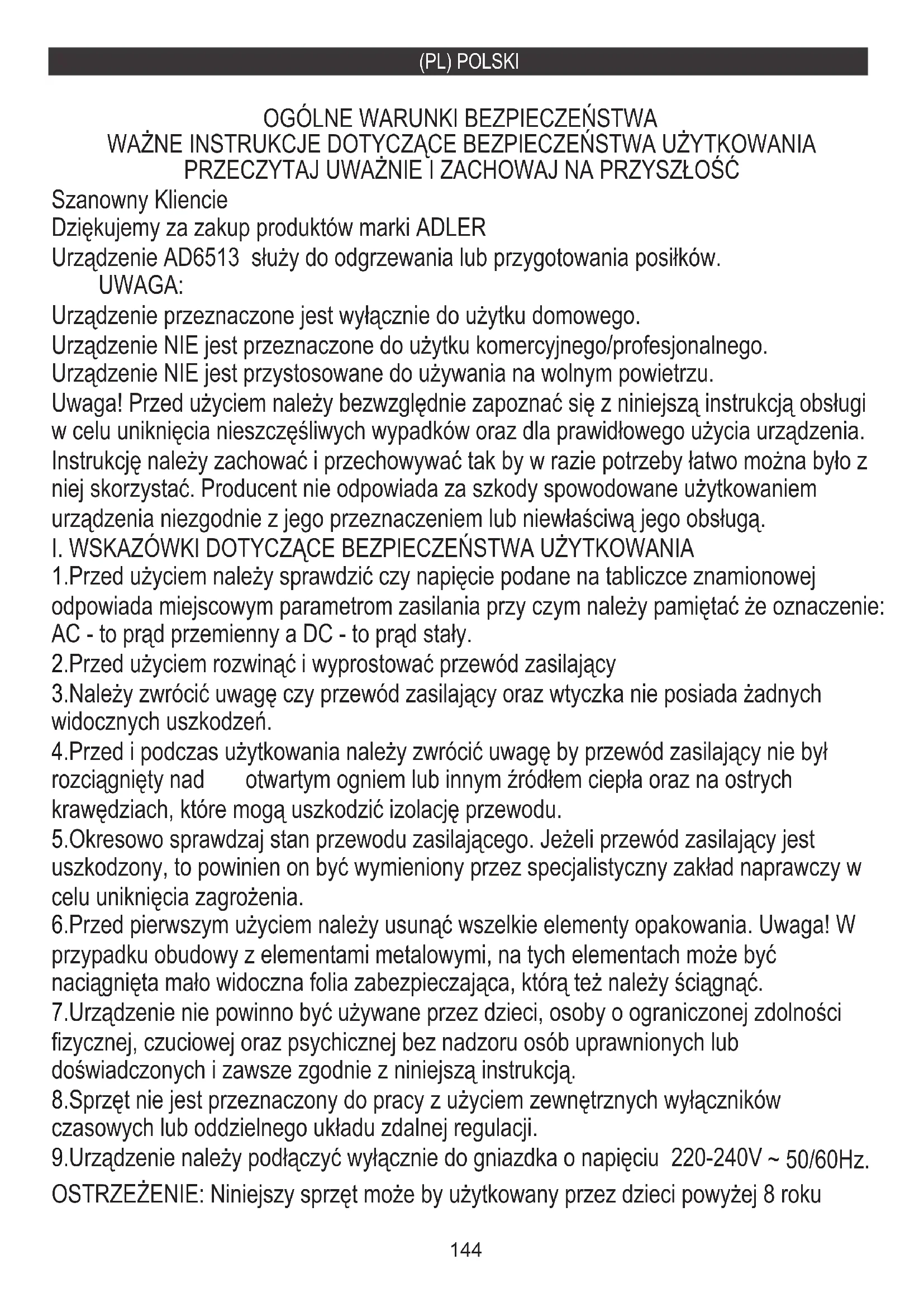 5.Okresowo sprawdzaj stan przewodu zasilającego. Jeżeli przewód zasilający jest uszkodzony, to powinien on być wymieniony przez specjalistyczny zakład naprawczy w celu uniknięcia zagrożenia. Urządzenie przeznaczone jest wyłącznie do użytku domowego. Urządzenie NIE jest przeznaczone do użytku komercyjnego/profesjonalnego. Uwaga! Przed użyciem należy bezwzględnie zapoznać się z niniejszą instrukcją obsługi w celu uniknięcia nieszczęśliwych wypadków oraz dla prawidłowego użycia urządzenia. Instrukcję należy zachować i przechowywać tak by w razie potrzeby łatwo można było z niej skorzystać. Producent nie odpowiada za szkody spowodowane użytkowaniem urządzenia niezgodnie z jego przeznaczeniem lub niewłaściwą jego obsługą. UWAGA: OSTRZEŻENIE: Niniejszy sprzęt może by użytkowany przez dzieci powyżej 8 roku Urządzenie AD6513 służy do odgrzewania lub przygotowania posiłków. Urządzenie NIE jest przystosowane do używania na wolnym powietrzu. 1.Przed użyciem należy sprawdzić czy napięcie podane na tabliczce znamionowej odpowiada miejscowym parametrom zasilania przy czym należy pamiętać że oznaczenie: AC - to prąd przemienny a DC - to prąd stały. 7.Urządzenie nie powinno być używane przez dzieci, osoby o ograniczonej zdolności fizycznej, czuciowej oraz psychicznej bez nadzoru osób uprawnionych lub doświadczonych i zawsze zgodnie z niniejszą instrukcją. 2.Przed użyciem rozwinąć i wyprostować przewód zasilający 8.Sprzęt nie jest przeznaczony do pracy z użyciem zewnętrznych wyłączników czasowych lub oddzielnego układu zdalnej regulacji. 9.Urządzenie należy podłączyć wyłącznie do gniazdka o napięciu 220-240V ~ 50/60Hz.