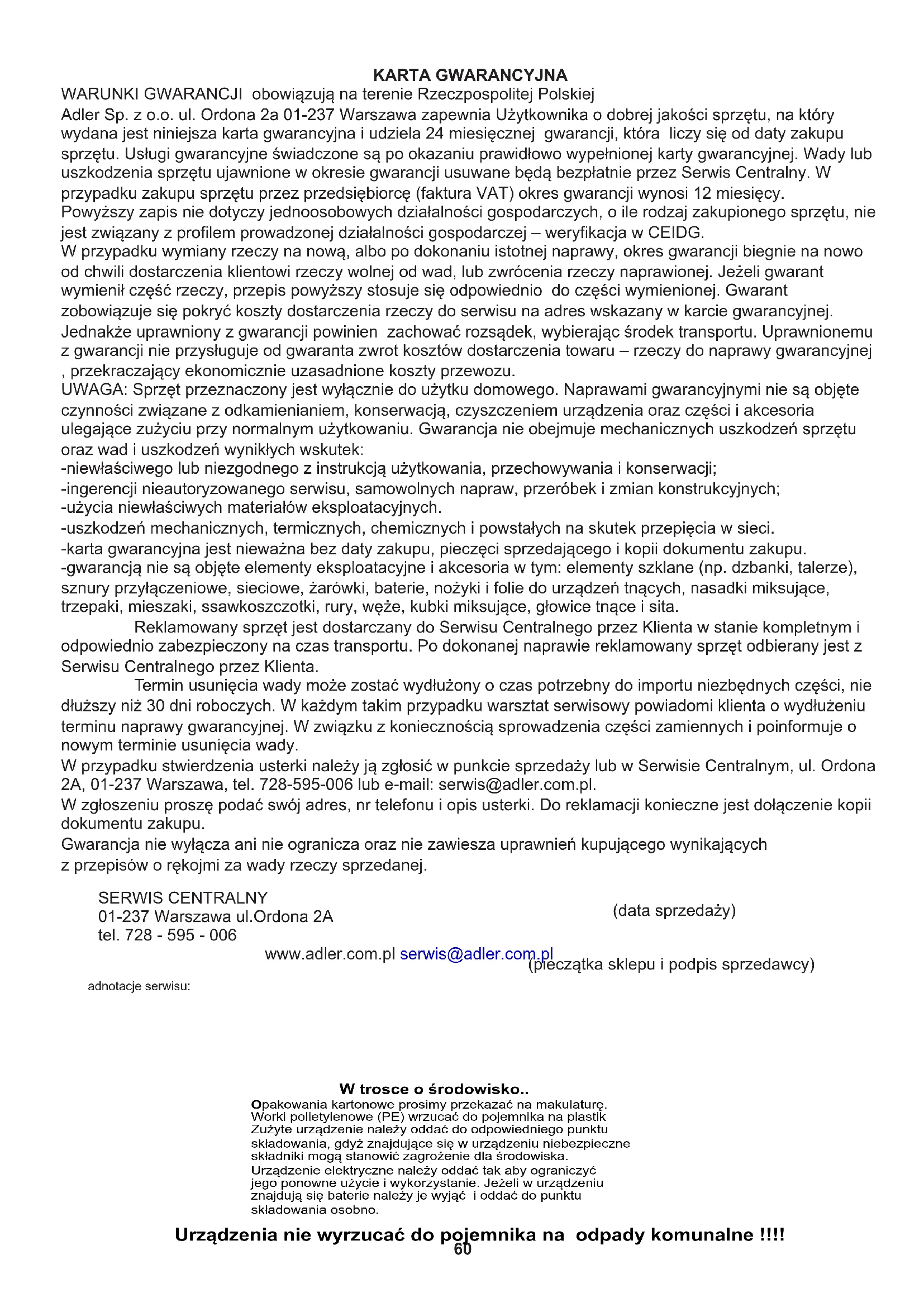 За да защитите околната си среда: моля, отделете картонените кутии и найлоновите торбички и ги изхвърлете в съответните кошчета за отпадъци. Използваният уред трябва да бъде доставен до специалните пунктове за събиране, които могат да повлияят на околната среда. Не изхвърляйте този уред в обикновен кош за отпадъци.60 UWAGA: Sprzęt przeznaczony jest wyłącznie do użytku domowego. Naprawami gwarancyjnymi nie są objęte czynności związane z odkamienianiem, konserwacją, czyszczeniem urządzenia oraz części i akcesoria ulegające zużyciu przy normalnym użytkowaniu. Gwarancja nie obejmuje mechanicznych uszkodzeń sprzętu oraz wad i uszkodzeń wynikłych wskutek: -niewłaściwego lub niezgodnego z instrukcją użytkowania, przechowywania i konserwacji; -ingerencji nieautoryzowanego serwisu, samowolnych napraw, przeróbek i zmian konstrukcyjnych; -użycia niewłaściwych materiałów eksploatacyjnych. WARUNKI GWARANCJI obowiązują na terenie Rzeczpospolitej Polskiej KARTA GWARANCYJNA Adler Sp. z o.o. ul. Ordona 2a 01-237 Warszawa zapewnia Użytkownika o dobrej jakości sprzętu, na który wydana jest niniejsza karta gwarancyjna i udziela 24 miesięcznej gwarancji, która liczy się od daty zakupu sprzętu. Usługi gwarancyjne świadczone są po okazaniu prawidłowo wypełnionej karty gwarancyjnej. Wady lub uszkodzenia sprzętu ujawnione w okresie gwarancji usuwane będą bezpłatnie przez Serwis Centralny. W przypadku zakupu sprzętu przez przedsiębiorcę (faktura VAT) okres gwarancji wynosi 12 miesięcy. Powyższy zapis nie dotyczy jednoosobowych działalności gospodarczych, o ile rodzaj zakupionego sprzętu, nie jest związany z profilem prowadzonej działalności gospodarczej – weryfikacja w CEIDG. W przypadku wymiany rzeczy na nową, albo po dokonaniu istotnej naprawy, okres gwarancji biegnie na nowo od chwili dostarczenia klientowi rzeczy wolnej od wad, lub zwrócenia rzeczy naprawionej. Jeżeli gwarant wymienił część rzeczy, przepis powyższy stosuje się odpowiednio do części wymienionej. Gwarant zobowiązuje się pokryć koszty dostarczenia rzeczy do serwisu na adres wskazany w karcie gwarancyjnej. Jednakże uprawniony z gwarancji powinien zachować rozsądek, wybierając środek transportu. Uprawnionemu z gwarancji nie przysługuje od gwaranta zwrot kosztów dostarczenia towaru – rzeczy do naprawy gwarancyjnej , przekraczający ekonomicznie uzasadnione koszty przewozu. Reklamowany sprzęt jest dostarczany do Serwisu Centralnego przez Klienta w stanie kompletnym i odpowiednio zabezpieczony na czas transportu. Po dokonanej naprawie reklamowany sprzęt odbierany jest z Serwisu Centralnego przez Klienta. W zgłoszeniu proszę podać swój adres, nr telefonu i opis usterki. Do reklamacji konieczne jest dołączenie kopii dokumentu zakupu. z przepisów o rękojmi za wady rzeczy sprzedanej. Gwarancja nie wyłącza ani nie ogranicza oraz nie zawiesza uprawnień kupującego wynikających Termin usunięcia wady może zostać wydłużony o czas potrzebny do importu niezbędnych części, nie dłuższy niż 30 dni roboczych. W każdym takim przypadku warsztat serwisowy powiadomi klienta o wydłużeniu terminu naprawy gwarancyjnej. W związku z koniecznością sprowadzenia części zamiennych i poinformuje o nowym terminie usunięcia wady. W przypadku stwierdzenia usterki należy ją zgłosić w punkcie sprzedaży lub w Serwisie Centralnym, ul. Ordona 2A, 01-237 Warszawa, tel. 728-595-006 lub e-mail: serwis@adler.com.pl. -uszkodzeń mechanicznych, termicznych, chemicznych i powstałych na skutek przepięcia w sieci. -karta gwarancyjna jest nieważna bez daty zakupu, pieczęci sprzedającego i kopii dokumentu zakupu. -gwarancją nie są objęte elementy eksploatacyjne i akcesoria w tym: elementy szklane (np. dzbanki, talerze), sznury przyłączeniowe, sieciowe, żarówki, baterie, nożyki i folie do urządzeń tnących, nasadki miksujące, trzepaki, mieszaki, ssawkoszczotki, rury, węże, kubki miksujące, głowice tnące i sita. SERWIS CENTRALNY 01-237 Warszawa ul.Ordona 2A tel. 728 - 595 - 006 www.adler.com.pl serwis@adler.com.pl (data sprzedaży) (pieczątka sklepu i podpis sprzedawcy) adnotacje serwisu: Urządzenia nie wyrzucać do pojemnika na odpady komunalne !!!! W trosce o środowisko.. Opakowania kartonowe prosimy przekazać na makulaturę.Worki polietylenowe (PE) wrzucać do pojemnika na plastikZużyte urządzenie należy oddać do odpowiedniego punktu składowania, gdyż znajdujące się w urządzeniu niebezpieczne składniki mogą stanowić zagrożenie dla środowiska. Urządzenie elektryczne należy oddać tak aby ograniczyćjego ponowne użycie i wykorzystanie. Jeżeli w urządzeniuznajdują się baterie należy je wyjąć i oddać do punktu składowania osobno.61 (PL) POLSKI