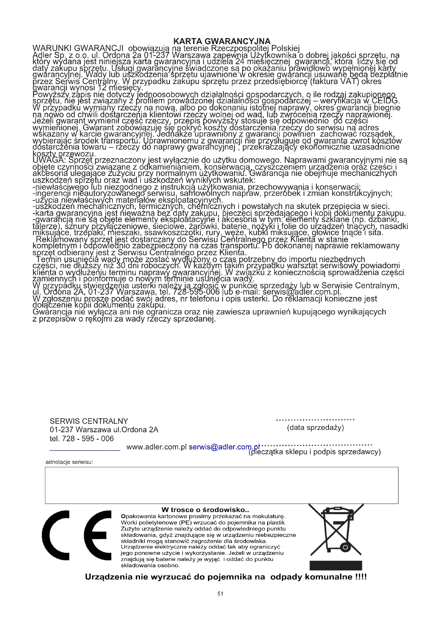 ﯾﺪﮭﺗ تﺎﻧﻮﻜﻤﻟا ﻞﻜﺸﺗ ﺪﻗ زﺎﮭﺠﻟا ﻲﻓ تﺎﯾرﺎﻄﺑ كﺎﻨھ نﺎﻛ اذإ .ﺎﮭﻣاﺪﺨﺘﺳاو ﺎﮭﻣاﺪﺨﺘﺳا ةدﺎﻋإ ،.ﻞﺼﻔﻨﻣ ﻞﻜﺸﺑ ﺔﻧﺰﺨﻤﻟا ﺔﻄﻘﻨﻟا ﻰﻟإ ﺎﮭﺋﺎﻄﻋإو ﺎﮭﺟاﺮﺧإ ﻚﯿﻠﻌﻓ .لﺧادﻟﺎﺑ لﺎﻌﺗﺷﻻا دﯾدﺷ لﺋﺎﺳ !!رﯾذﺣﺗ51 KARTA GWARANCYJNA WARUNKI GWARANCJI obowiązują na terenie Rzeczpospolitej Polskiej Adler Sp. z o.o. ul. Ordona 2a 01-237 Warszawa zapewnia Użytkownika o dobrej jakości sprzętu, na który wydana jest niniejsza karta gwarancyjna i udziela 24 miesięcznej gwarancji, która liczy się od daty zakupu sprzętu. Usługi gwarancyjne świadczone są po okazaniu prawidłowo wypełnionej karty gwarancyjnej. Wady lub uszkodzenia sprzętu ujawnione w okresie gwarancji usuwane będą bezpłatnie przez Serwis Centralny. W przypadku zakupu sprzętu przez przedsiębiorcę (faktura VAT) okres gwarancji wynosi 12 miesięcy. Powyższy zapis nie dotyczy jednoosobowych działalności gospodarczych, o ile rodzaj zakupionego sprzętu, nie jest związany z profilem prowadzonej działalności gospodarczej – weryfikacja w CEIDG. W przypadku wymiany rzeczy na nową, albo po dokonaniu istotnej naprawy, okres gwarancji biegnie na nowo od chwili dostarczenia klientowi rzeczy wolnej od wad, lub zwrócenia rzeczy naprawionej. Jeżeli gwarant wymienił część rzeczy, przepis powyższy stosuje się odpowiednio do części wymienionej. Gwarant zobowiązuje się pokryć koszty dostarczenia rzeczy do serwisu na adres wskazany w karcie gwarancyjnej. Jednakże uprawniony z gwarancji powinien zachować rozsądek, wybierając środek transportu. Uprawnionemu z gwarancji nie przysługuje od gwaranta zwrot kosztów dostarczenia towaru – rzeczy do naprawy gwarancyjnej , przekraczający ekonomicznie uzasadnione koszty przewozu. UWAGA: Sprzęt przeznaczony jest wyłącznie do użytku domowego. Naprawami gwarancyjnymi nie są objęte czynności związane z odkamienianiem, konserwacją, czyszczeniem urządzenia oraz części i akcesoria ulegające zużyciu przy normalnym użytkowaniu. Gwarancja nie obejmuje mechanicznych uszkodzeń sprzętu oraz wad i uszkodzeń wynikłych wskutek: -niewłaściwego lub niezgodnego z instrukcją użytkowania, przechowywania i konserwacji; -ingerencji nieautoryzowanego serwisu, samowolnych napraw, przeróbek i zmian konstrukcyjnych; -użycia niewłaściwych materiałów eksploatacyjnych. -uszkodzeń mechanicznych, termicznych, chemicznych i powstałych na skutek przepięcia w sieci. -karta gwarancyjna jest nieważna bez daty zakupu, pieczęci sprzedającego i kopii dokumentu zakupu. -gwarancją nie są objęte elementy eksploatacyjne i akcesoria w tym: elementy szklane (np. dzbanki, talerze), sznury przyłączeniowe, sieciowe, żarówki, baterie, nożyki i folie do urządzeń tnących, nasadki miksujące, trzepaki, mieszaki, ssawkoszczotki, rury, węże, kubki miksujące, głowice tnące i sita. Reklamowany sprzęt jest dostarczany do Serwisu Centralnego przez Klienta w stanie kompletnym i odpowiednio zabezpieczony na czas transportu. Po dokonanej naprawie reklamowany sprzęt odbierany jest z Serwisu Centralnego przez Klienta. Termin usunięcia wady może zostać wydłużony o czas potrzebny do importu niezbędnych części, nie dłuższy niż 30 dni roboczych. W każdym takim przypadku warsztat serwisowy powiadomi klienta o wydłużeniu terminu naprawy gwarancyjnej. W związku z koniecznością sprowadzenia części zamiennych i poinformuje o nowym terminie usunięcia wady. W przypadku stwierdzenia usterki należy ją zgłosić w punkcie sprzedaży lub w Serwisie Centralnym, ul. Ordona 2A, 01-237 Warszawa, tel. 728-595-006 lub e-mail: serwis@adler.com.pl. W zgłoszeniu proszę podać swój adres, nr telefonu i opis usterki. Do reklamacji konieczne jest dołączenie kopii dokumentu zakupu. Gwarancja nie wyłącza ani nie ogranicza oraz nie zawiesza uprawnień kupującego wynikających z przepisów o rękojmi za wady rzeczy sprzedanej. SERWIS CENTRALNY 01-237 Warszawa ul.Ordona 2A tel. 728 - 595 - 006 www.adler.com.pl serwis@adler.com.pl (data sprzedaży) (pieczątka sklepu i podpis sprzedawcy) adnotacje serwisu: Urządzenia nie wyrzucać do pojemnika na odpady komunalne !!!! W trosce o środowisko.. Opakowania kartonowe prosimy przekazać na makulaturę.Worki polietylenowe (PE) wrzucać do pojemnika na plastikZużyte urządzenie należy oddać do odpowiedniego punktu składowania, gdyż znajdujące się w urządzeniu niebezpieczne składniki mogą stanowić zagrożenie dla środowiska. Urządzenie elektryczne należy oddać tak aby ograniczyćjego ponowne użycie i wykorzystanie. Jeżeli w urządzeniuznajdują się baterie należy je wyjąć i oddać do punktu składowania osobno.52 WARUNKI BEZPIECZEŃSTWA. WAŻNE INSTRUKCJE DOTYCZĄCE BEZPIECZEŃSTWA UŻYTKOWANIA PROSIMY UWAŻNIE PRZECZYTAĆ I ZACHOWAĆ NA PRZYSZŁOŚĆ Warunki gwarancji są inne, jeśli urządzenie jest wykorzystywane do celów komercyjnych.