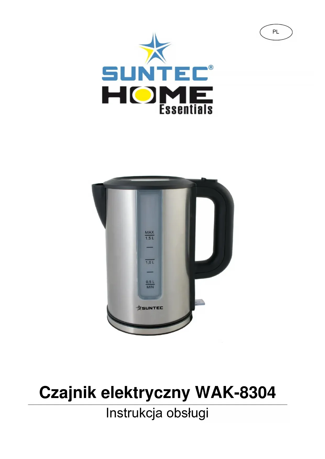 Corpo Coperchio Finestra Tasto di apertura del coperchio Impugnatura di trasporto Interruttore ON / OFF BaseCzajnik elektryczny WAK-8304 Instrukcja obsługi PLBARDZO WAŻNE! Dziękujemy za zakup tego urządzenia marki Suntec Wellness. Przed dokładnym przeczytaniem instrukcji obsługi prosimy, aby nie stosować urządzenia. Prosimy przechowywać niniejszą instrukcję obsługi w razie ewentualnych roszczeń gwarancyjnych oraz jako zbiór informacji o produkcie. Ogólne wskazówki bezpieczeństwa Niniejsze urządzenie może być obsługiwane przez dzieci w wieku powyżej 8 lat, a także przez osoby o ograniczonej sprawności fizycznej, sensorycznej i umysłowej oraz osoby nieposiadające dostatecznego doświadczenia i/lub wiedzy tylko pod nadzorem i pod warunkiem, że zostały one pouczone na temat bezpiecznego użytkowania urządzenia i że zrozumiały wynikające z tego zagrożenia. Dzieci nie mogą bawić się tym urządzeniem. Czyszczenie i prace konserwacyjne należące do obowiązków użytkownika nie mogą być wykonywane przez dzieci bez nadzoru. Urządzenie można stosować tylko w gospodarstwie domowym i tylko w celach zgodnych z jego przeznaczeniem. Należy sprawdzić, czy podane napięcie sieciowe jest zgodne ze źródłem zasilania. Nie dotykać gorących powierzchni. Używać wyłącznie uchwytów i przycisków. Urządzenie używać wyłącznie na płaskich płaszczyznach, aby uniknąć przechylenia urządzenia. Nie używać urządzenia na wolnym powietrzu lub w pobliżu źródeł ciepła. Urządzenia nie wolno przechowywać na zewnątrz oraz w miejscach, w których występują ekstremalnetemperatury lub wysoka wilgotność powietrza. Należy unikać sytuacji, gdzie kabel zwisa przez krawędź stołu lub powierzchnię roboczą, dotyka gorące powierzchnie lub wchodzi w kontakt z gorącymi elementami. Nie umieszczać urządzenia pod zasłonami lub firanami lub w ich pobliżu. Nie stosować do obsługi urządzenia jednostki do zdalnego sterowania lub zegara sterującego. Zastosowanie przedłużacza lub podobnych elementów nie jest dozwolone. Zastosowanie dodatkowych, nierekomendowanych przez producenta akcesoriów może prowadzić do obrażeń i utraty roszczeń gwarancyjnych. Uszkodzone kable sieciowe muszą być wymieniane przez autoryzowanego specjalistę. Nigdy nie używać urządzenia z wadliwym kablem sieciowym lub wtyczką. Wyciągnąć wtyczkę sieciową z gniazdka elektrycznego: – w razie wystąpienia usterki, – jeżeli urządzenie nie będzie używane przez dłuższy czas, – przed każdym czyszczeniem. Nie ciągnąć nigdy za przewód zasilający, lecz za wtyczkę. W celu ochrony przed porażeniem prądem nie zanurzać kabla, wtyczki lub urządzenia w wodzie lub podobnych płynach. Przed demontażem lub montażem części pozostawić urządzenie do ochłodzenia. Przed przenoszeniem, transportowaniem, czyszczeniem lub przechowywaniem urządzenia pozostawić je do ochłodzenia.Podzespoły