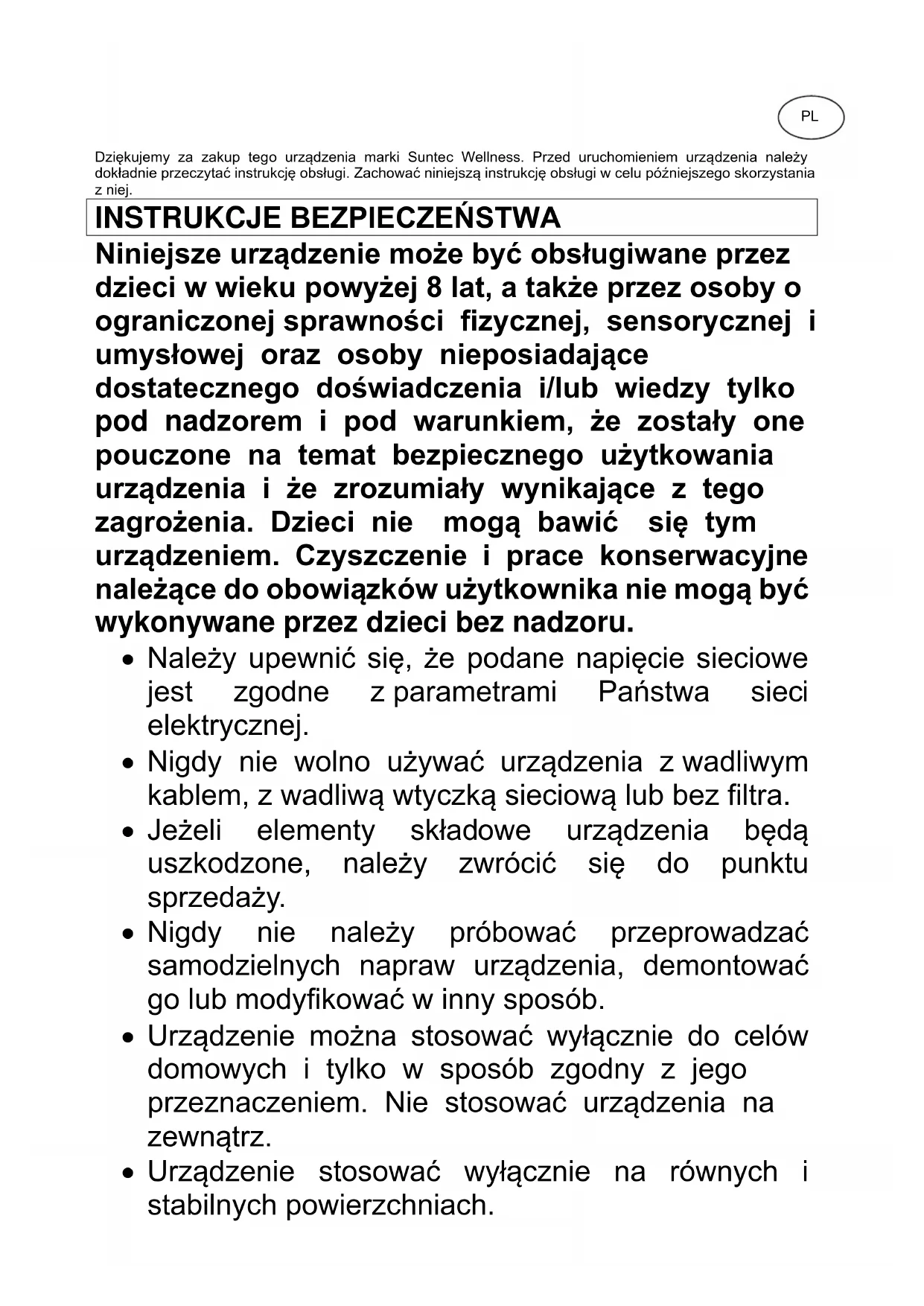 Dziękujemy za zakup tego urządzenia marki Suntec Wellness. Przed uruchomieniem urządzenia należy dokładnie przeczytać instrukcję obsługi. Zachować niniejszą instrukcję obsługi w celu późniejszego skorzystania z niej.