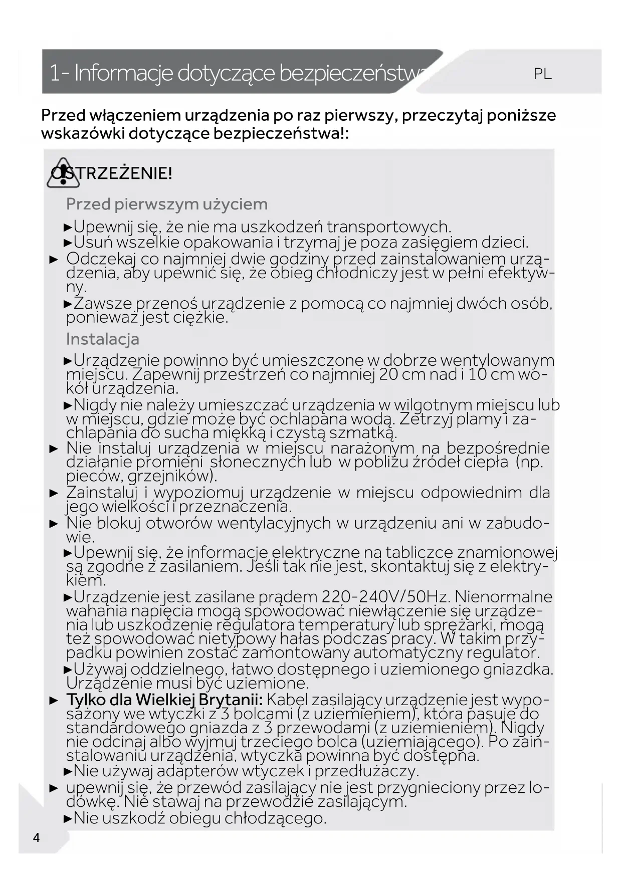 Przed włączeniem urządzenia po raz pierwszy, przeczytaj poniższe wskazówki dotyczące bezpieczeństwa!: OSTRZEŻENIE! Przed pierwszym użyciem ▶ Upewnij się, że nie ma uszkodzeń transportowych. ▶ Usuń wszelkie opakowania i trzymaj je poza zasięgiem dzieci. ▶ Odczekaj co najmniej dwie godziny przed zainstalowaniem urzą- dzenia, aby upewnić się, że obieg chłodniczy jest w pełni efektyw- ny. ▶ Zawsze przenoś urządzenie z pomocą co najmniej dwóch osób, ponieważ jest ciężkie. Instalacja ▶ Urządzenie powinno być umieszczone w dobrze wentylowanym miejscu. Zapewnij przestrzeń co najmniej 20 cm nad i 10 cm wo- kół urządzenia. ▶ Nigdy nie należy umieszczać urządzenia w wilgotnym miejscu lub w miejscu, gdzie może być ochlapana wodą. Zetrzyj plamy i za- chlapania do sucha miękką i czystą szmatką. ▶ Nie instaluj urządzenia w miejscu narażonym na bezpośrednie działanie promieni słonecznych lub w pobliżu źródeł ciepła (np. pieców, grzejników). ▶ Zainstaluj i wypoziomuj urządzenie w miejscu odpowiednim dla jego wielkości i przeznaczenia. ▶ Nie blokuj otworów wentylacyjnych w urządzeniu ani w zabudo- wie. ▶ Upewnij się, że informacje elektryczne na tabliczce znamionowej są zgodne z zasilaniem. Jeśli tak nie jest, skontaktuj się z elektry- kiem. ▶ Urządzenie jest zasilane prądem 220-240V/50Hz. Nienormalne wahania napięcia mogą spowodować niewłączenie się urządze- nia lub uszkodzenie regulatora temperatury lub sprężarki, mogą też spowodować nietypowy hałas podczas pracy. W takim przy- padku powinien zostać zamontowany automatyczny regulator. ▶ Używaj oddzielnego, łatwo dostępnego i uziemionego gniazdka. Urządzenie musi być uziemione. ▶ Tylko dla Wielkiej Brytanii: Kabel zasilający urządzenie jest wypo- sażony we wtyczki z 3 bolcami (z uziemieniem), która pasuje do standardowego gniazda z 3 przewodami (z uziemieniem). Nigdy nie odcinaj albo wyjmuj trzeciego bolca (uziemiającego). Po zain- stalowaniu urządzenia, wtyczka powinna być dostępna. ▶ Nie używaj adapterów wtyczek i przedłużaczy. ▶ upewnij się, że przewód zasilający nie jest przygnieciony przez lo- dówkę. Nie stawaj na przewodzie zasilającym. ▶ Nie uszkodź obiegu chłodzącego. 4PL