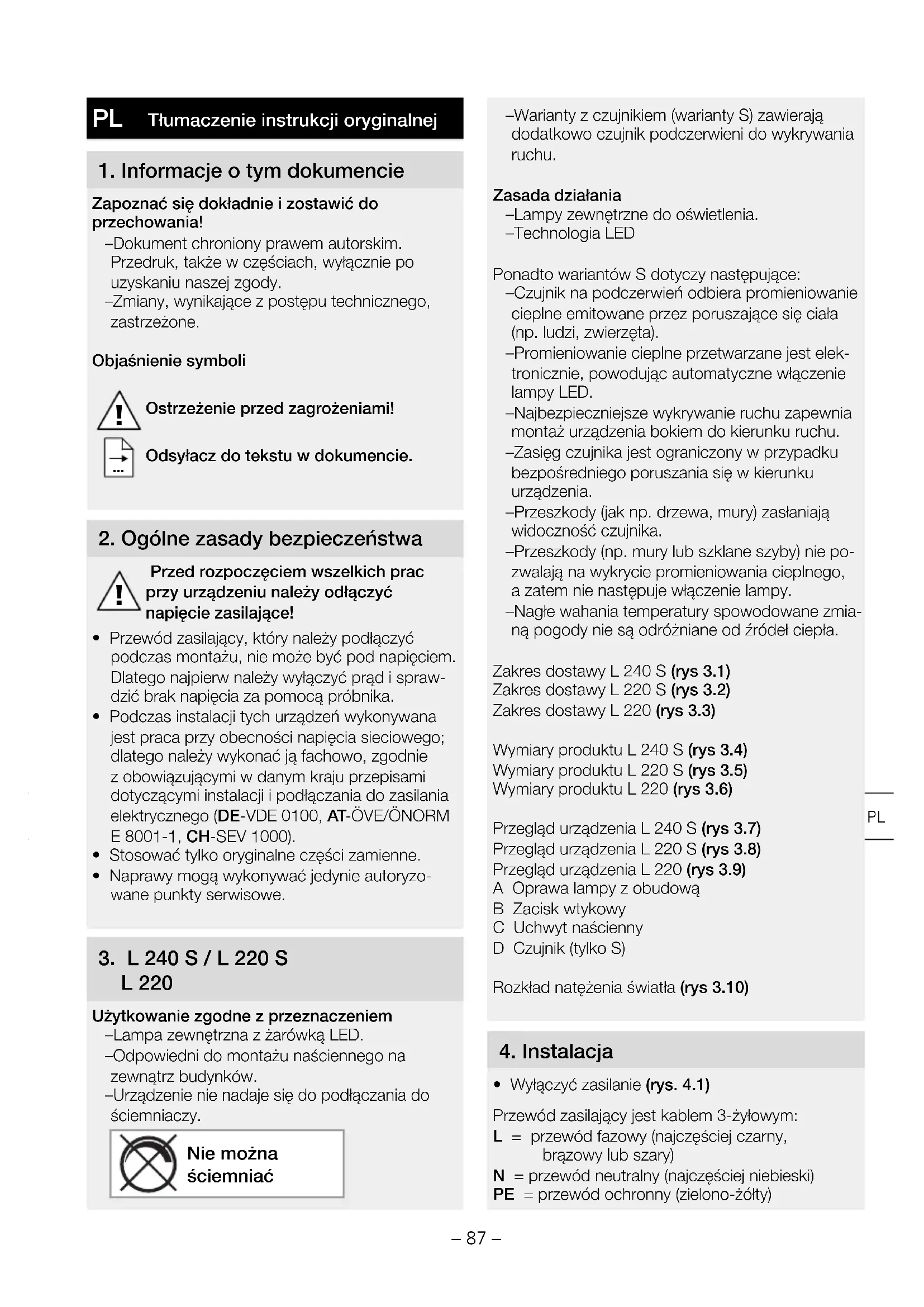 L 220 Użytkowanie zgodne zprzeznaczeniem – Lampa zewnętrzna zżarówką LED. – Odpowiedni do montażu naściennego na zewnątrz budynków. – Urządzenie nie nadaje się do podłączania do ściemniaczy. Nie można ściemniać – Warianty z czujnikiem (warianty S) zawierają dodatkowo czujnik podczerwieni do wykrywania ruchu. Zasada działania – Lampy zewnętrzne do oświetlenia. – Technologia LED Ponadto wariantów S dotyczy następujące: – Czujnik na podczerwień odbiera promieniowanie cieplne emitowane przez poruszające się ciała (np. ludzi, zwierzęta). – Promieniowanie cieplne przetwarzane jest elek- tronicznie, powodując automatyczne włączenie lampy LED. – Najbezpieczniejsze wykrywanie ruchu zapewnia montaż urządzenia bokiem do kierunku ruchu. – Zasięg czujnika jest ograniczony w przypadku bezpośredniego poruszania się w kierunku urządzenia. – Przeszkody (jak np. drzewa, mury) zasłaniają widoczność czujnika. – Przeszkody (np. mury lub szklane szyby) nie po- zwalają na wykrycie promieniowania cieplnego, azatem nie następuje włączenie lampy. – Nagłe wahania temperatury spowodowane zmia- ną pogody nie są odróżniane od źródeł ciepła. Zakres dostawy L 240 S (rys 3.1) Zakres dostawy L 220 S (rys 3.2) Zakres dostawy L 220 (rys 3.3) Wymiary produktu L 240 S (rys 3.4) Wymiary produktu L 220 S (rys 3.5) Wymiary produktu L 220 (rys 3.6) Przegląd urządzenia L 240 S (rys 3.7) Przegląd urządzenia L 220 S (rys 3.8) Przegląd urządzenia L 220 (rys 3.9) A Oprawa lampy z obudową B Zacisk wtykowy C Uchwyt naścienny D Czujnik (tylko S) Rozkład natężenia światła (rys 3.10)