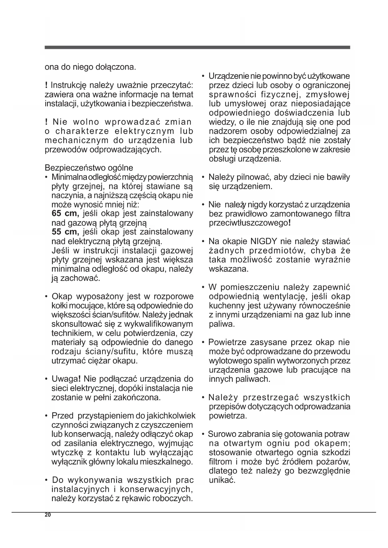 - Het huidige apparaat mag alleen door kinderen van 8 jaar en ouder en door personen met een beperkt lichamelijk, sensorieel of geestelijk vermogen, of zonder ervaring en kennis worden gebruikt, mits ze onder adequaat toezicht zijn, of mits ze zijn onderricht m.b.t. het veilige gebruik van het apparaat en zich bewust zijn van de betreffende gevaren. Voorkom dat kinderen met het apparaat spelen. De reinigings- en onderhoudshandelingen mogen niet door kinderen worden uitgevoerd, tenzij onder toezicht. Ostrzeżenia ! Instrukcję należy zachować w celu późniejszego korzystania. W przypadku sprzedaży, odstąpienia lub przeniesienia urządzenia, należy upewnić się, że jest20 ona do niego dołączona. ! Instrukcję należy uważnie przeczytać: zawiera ona ważne informacje na temat instalacji, użytkowania i bezpieczeństwa. ! Nie wolno wprowadzać zmian o charakterze elektrycznym lub mechanicznym do urządzenia lub przewodów odprowadzających. Bezpieczeństwo ogólne