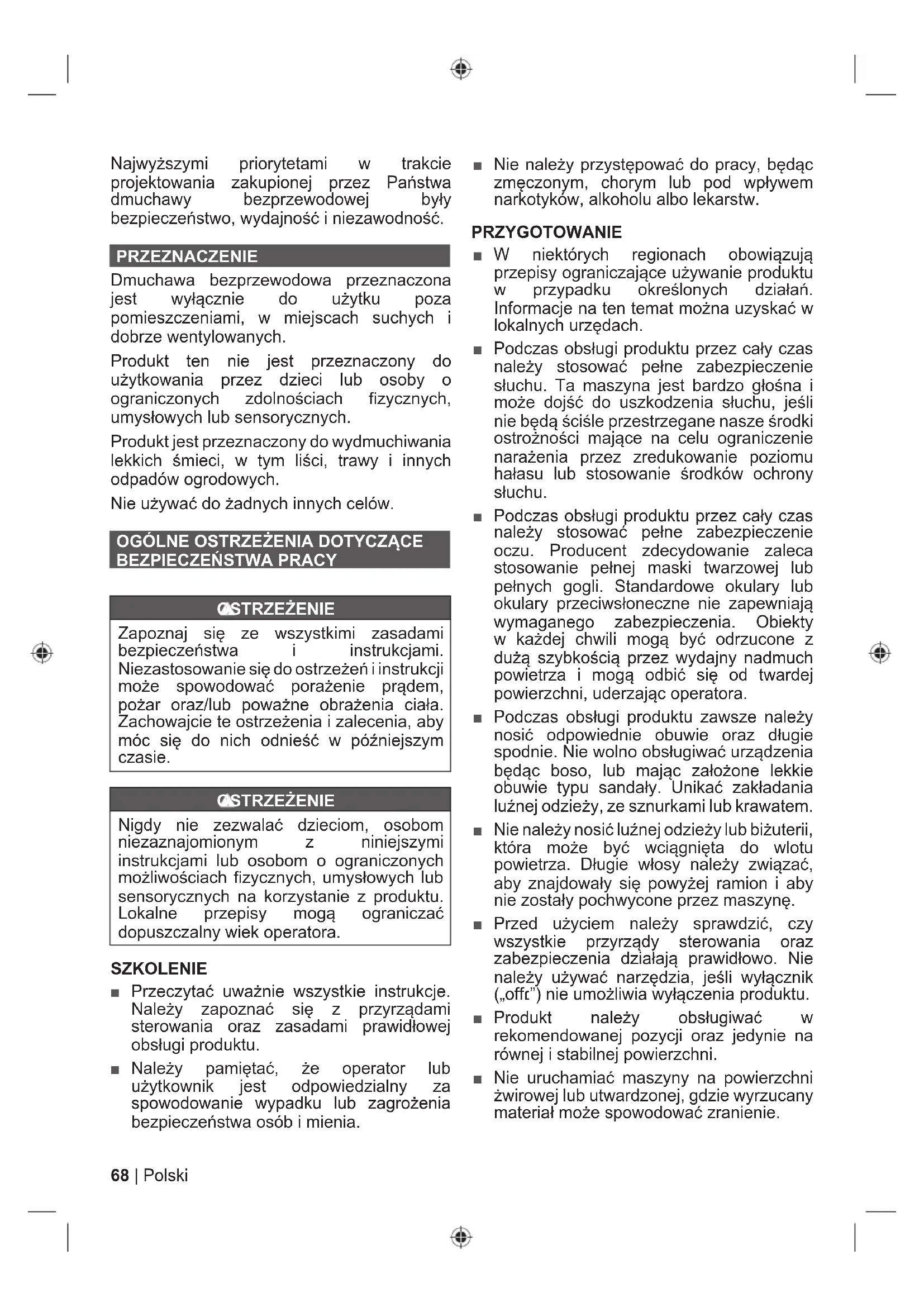OSTRZEŻENIE Zapoznaj się ze wszystkimi zasadami bezpieczeństwa i instrukcjami. Niezastosowanie się do ostrzeżeń i instrukcji może spowodować porażenie prądem, pożar oraz/lub poważne obrażenia ciała. Zachowajcie te ostrzeżenia i zalecenia, aby móc się do nich odnieść w późniejszym czasie. OSTRZEŻENIE Nigdy nie zezwalać dzieciom, osobom niezaznajomionym z niniejszymi instrukcjami lub osobom o ograniczonych możliwościach fi zycznych, umysłowych lub sensorycznych na korzystanie z produktu. Lokalne przepisy mogą ograniczać dopuszczalny wiek operatora. SZKOLENIE ■ Przeczytać uważnie wszystkie instrukcje. Należy zapoznać się z przyrządami sterowania oraz zasadami prawidłowej obsługi produktu. ■ Należy pamiętać, że operator lub użytkownik jest odpowiedzialny za spowodowanie wypadku lub zagrożenia bezpieczeństwa osób i mienia. ■ Nie należy przystępować do pracy, będąc zmęczonym, chorym lub pod wpływem narkotyków, alkoholu albo lekarstw. PRZYGOTOWANIE ■ W niektórych regionach obowiązują przepisy ograniczające używanie produktu w przypadku określonych działań. Informacje na ten temat można uzyskać w lokalnych urzędach. ■ Podczas obsługi produktu przez cały czas należy stosować pełne zabezpieczenie słuchu. Ta maszyna jest bardzo głośna i może dojść do uszkodzenia słuchu, jeśli nie będą ściśle przestrzegane nasze środki ostrożności mające na celu ograniczenie narażenia przez zredukowanie poziomu hałasu lub stosowanie środków ochrony słuchu. ■ Podczas obsługi produktu przez cały czas należy stosować pełne zabezpieczenie oczu. Producent zdecydowanie zaleca stosowanie pełnej maski twarzowej lub pełnych gogli. Standardowe okulary lub okulary przeciwsłoneczne nie zapewniają wymaganego zabezpieczenia. Obiekty w każdej chwili mogą być odrzucone z dużą szybkością przez wydajny nadmuch powietrza i mogą odbić się od twardej powierzchni, uderzając operatora. ■ Podczas obsługi produktu zawsze należy nosić odpowiednie obuwie oraz długie spodnie. Nie wolno obsługiwać urządzenia będąc boso, lub mając założone lekkie obuwie typu sandały. Unikać zakładania luźnej odzieży, ze sznurkami lub krawatem. ■ Nie należy nosić luźnej odzieży lub biżuterii, która może być wciągnięta do wlotu powietrza. Długie włosy należy związać, aby znajdowały się powyżej ramion i aby nie zostały pochwycone przez maszynę. ■ Przed użyciem należy sprawdzić, czy wszystkie przyrządy sterowania oraz zabezpieczenia działają prawidłowo. Nie należy używać narzędzia, jeśli wyłącznik („off׆”) nie umożliwia wyłączenia produktu. ■ Produkt należy obsługiwać w rekomendowanej pozycji oraz jedynie na równej i stabilnej powierzchni. ■ Nie uruchamiać maszyny na powierzchni żwirowej lub utwardzonej, gdzie wyrzucany materiał może spowodować zranienie.69 Polski |