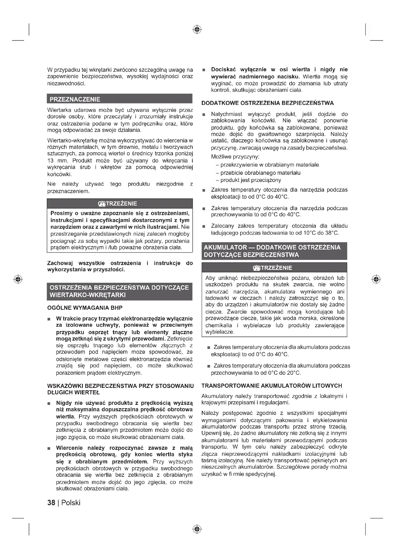 ■ Natychmiast wyłączyć produkt, jeśli dojdzie do zablokowania końcówki. Nie włączać ponownie produktu, gdy końcówka są zablokowane, ponieważ może dojść do gwałtownego szarpnięcia. Należy ustalić, dlaczego końcówka są zablokowane i usunąć przyczynę, zwracają uwagę na zasady bezpieczeństwa. Możliwe przyczyny: – przekrzywienie w obrabianym materiale – przebicie obrabianego materiału – produkt jest przeciążony ■ Zakres temperatury otoczenia dla narzędzia podczas eksploatacji to od 0°C do 40°C. ■ Zakres temperatury otoczenia dla narzędzia podczas przechowywania to od 0°C do 40°C. ■ Zalecany zakres temperatury otoczenia dla układu ładującego podczas ładowania to od 10°C do 38°C.