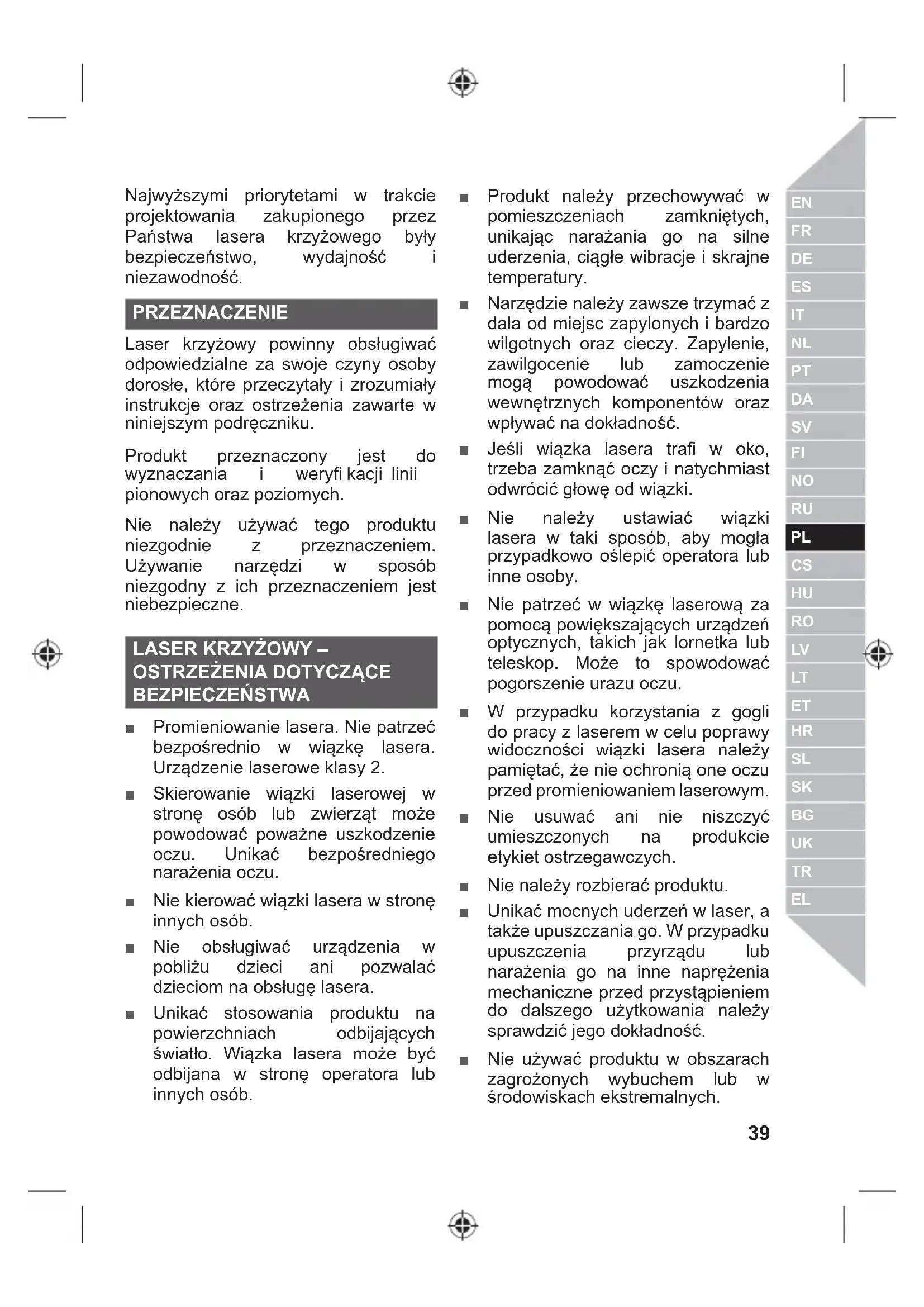 NajwyĪszymi priorytetami w trakcie projektowania zakupionego przez PaĔstwa lasera krzyĪowego byáy bezpieczeĔstwo, wydajnoĞü i niezawodnoĞü. PRZEZNACZENIE Laser krzyĪowy powinny obsáugiwaü odpowiedzialne za swoje czyny osoby dorosáe, które przeczytaáy i zrozumiaáy instrukcje oraz ostrzeĪenia zawarte w niniejszym podrĊczniku. Produkt przeznaczony jest do wyznaczania i wery¿ kacji linii pionowych oraz poziomych. Nie naleĪy uĪywaü tego produktu niezgodnie z przeznaczeniem. UĪywanie narzĊdzi w sposób niezgodny z ich przeznaczeniem jest niebezpieczne. LASER KRZYĩOWY – OSTRZEĩENIA DOTYCZĄCE BEZPIECZEēSTWA Ŷ Promieniowanie lasera. Nie patrzeü bezpoĞrednio w wiązkĊ lasera. Urządzenie laserowe klasy 2. Ŷ Skierowanie wiązki laserowej w stronĊ osób lub zwierząt moĪe powodowaü powaĪne uszkodzenie oczu. Unikaü bezpoĞredniego naraĪenia oczu. Ŷ Nie kierowaü wiązki lasera w stronĊ innych osób. Ŷ Nie obsáugiwaü urządzenia w pobliĪu dzieci ani pozwalaü dzieciom na obsáugĊ lasera. Ŷ Unikaü stosowania produktu na powierzchniach odbijających Ğwiatáo. Wiązka lasera moĪe byü odbijana w stronĊ operatora lub innych osób. Ŷ Produkt naleĪy przechowywaü w pomieszczeniach zamkniĊtych, unikając naraĪania go na silne uderzenia, ciągáe wibracje i skrajne temperatury. Ŷ NarzĊdzie naleĪy zawsze trzymaü z dala od miejsc zapylonych i bardzo wilgotnych oraz cieczy. Zapylenie, zawilgocenie lub zamoczenie mogą powodowaü uszkodzenia wewnĊtrznych komponentów oraz wpáywaü na dokáadnoĞü. Ŷ JeĞli wiązka lasera trafi w oko, trzeba zamknąü oczy i natychmiast odwróciü gáowĊ od wiązki. Ŷ Nie naleĪy ustawiaü wiązki lasera w taki sposób, aby mogáa przypadkowo oĞlepiü operatora lub inne osoby. Ŷ Nie patrzeü w wiązkĊ laserową za pomocą powiĊkszających urządzeĔ optycznych, takich jak lornetka lub teleskop. MoĪe to spowodowaü pogorszenie urazu oczu. Ŷ W przypadku korzystania z gogli do pracy z laserem w celu poprawy widocznoĞci wiązki lasera naleĪy pamiĊtaü, Īe nie ochronią one oczu przed promieniowaniem laserowym. Ŷ Nie usuwaü ani nie niszczyü umieszczonych na produkcie etykiet ostrzegawczych. Ŷ Nie naleĪy rozbieraü produktu. Ŷ Unikaü mocnych uderzeĔ w laser, a takĪe upuszczania go. W przypadku upuszczenia przyrządu lub naraĪenia go na inne naprĊĪenia mechaniczne przed przystąpieniem do dalszego uĪytkowania naleĪy sprawdziü jego dokáadnoĞü. Ŷ Nie uĪywaü produktu w obszarach zagroĪonych wybuchem lub w Ğrodowiskach ekstremalnych.40 | Polski