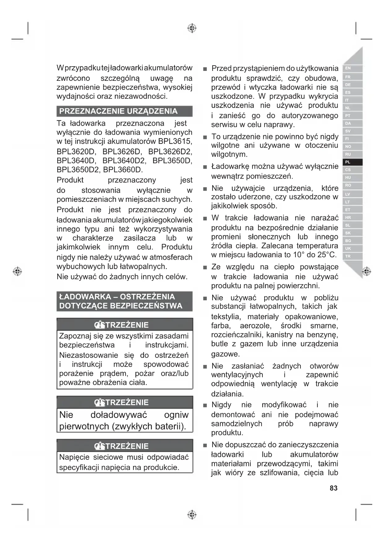 Ta ładowarka przeznaczona jest wyłącznie do ładowania wymienionych w tej instrukcji akumulatorów BPL3615, BPL3620D, BPL3626D, BPL3626D2, BPL3640D, BPL3640D2, BPL3650D, BPL3650D2, BPL3660D. Produkt przeznaczony jest do stosowania wyłącznie w pomieszczeniach w miejscach suchych. Produkt nie jest przeznaczony do ładowania akumulatorów jakiegokolwiek innego typu ani też wykorzystywania w charakterze zasilacza lub w jakimkolwiek innym celu. Produktu nigdy nie należy używać w atmosferach wybuchowych lub łatwopalnych. Nie używać do żadnych innych celów.