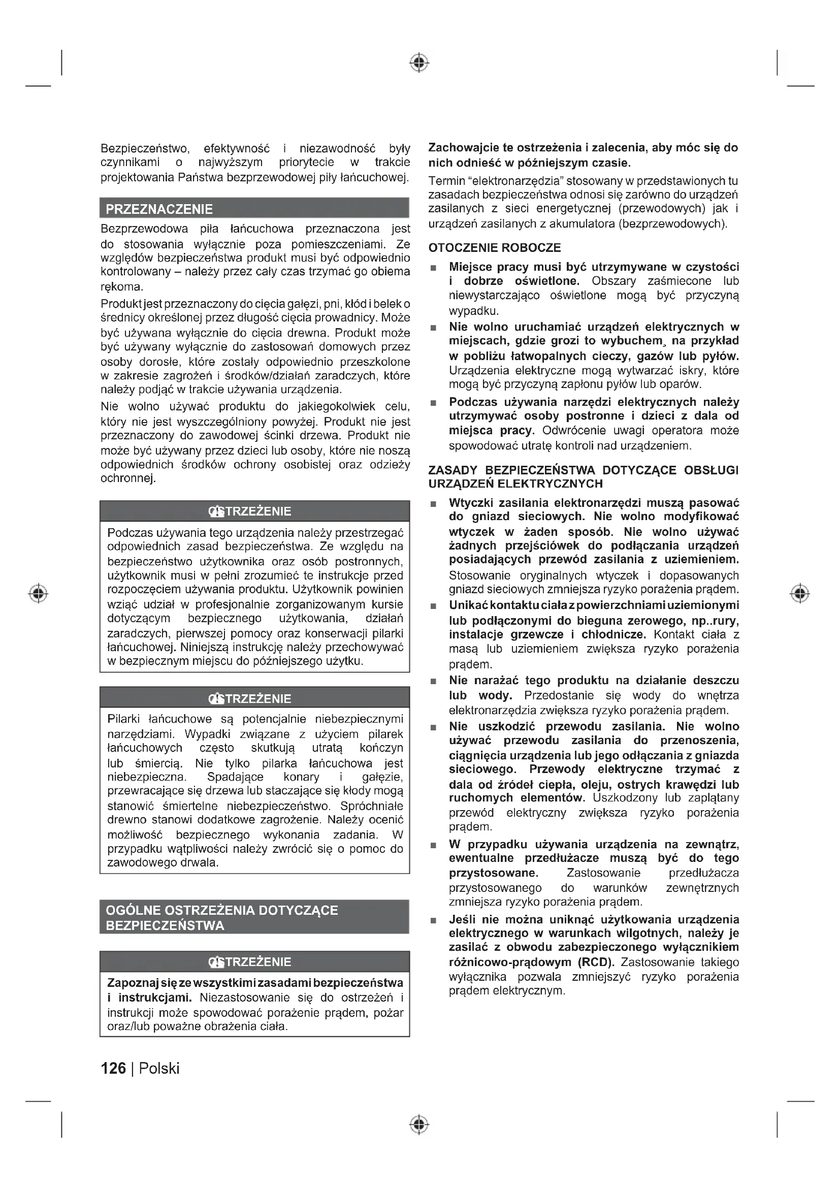 Указывает потенциально опасную ситуацию, которая, если не избежать, может кончаться смертельным или серьезным ущербом. ПРЕДОСТЕРЕЖЕНИЕ Указывает потенциально опасную ситуацию, которая, если не избежать, может кончаться малым или уменьшенным ущербом. ПРЕДОСТЕРЕЖЕНИЕ Употребляется без предупреждающего знака Указывает на ситуацию, которая может привести к повреждению имущества.126 | Polski Bezpieczeństwo, efektywność i niezawodność były czynnikami o najwyższym priorytecie w trakcie projektowania Państwa bezprzewodowej piły łańcuchowej. PRZEZNACZENIE Bezprzewodowa piła łańcuchowa przeznaczona jest do stosowania wyłącznie poza pomieszczeniami. Ze względów bezpieczeństwa produkt musi być odpowiednio kontrolowany – należy przez cały czas trzymać go obiema rękoma. Produkt jest przeznaczony do cięcia gałęzi, pni, kłód i belek o średnicy określonej przez długość cięcia prowadnicy. Może być używana wyłącznie do cięcia drewna. Produkt może być używany wyłącznie do zastosowań domowych przez osoby dorosłe, które zostały odpowiednio przeszkolone w zakresie zagrożeń i środków/działań zaradczych, które należy podjąć w trakcie używania urządzenia. Nie wolno używać produktu do jakiegokolwiek celu, który nie jest wyszczególniony powyżej. Produkt nie jest przeznaczony do zawodowej ścinki drzewa. Produkt nie może być używany przez dzieci lub osoby, które nie noszą odpowiednich środków ochrony osobistej oraz odzieży ochronnej. OSTRZEŻENIE Podczas używania tego urządzenia należy przestrzegać odpowiednich zasad bezpieczeństwa. Ze względu na bezpieczeństwo użytkownika oraz osób postronnych, użytkownik musi w pełni zrozumieć te instrukcje przed rozpoczęciem używania produktu. Użytkownik powinien wziąć udział w profesjonalnie zorganizowanym kursie dotyczącym bezpiecznego użytkowania, działań zaradczych, pierwszej pomocy oraz konserwacji pilarki łańcuchowej. Niniejszą instrukcję należy przechowywać w bezpiecznym miejscu do późniejszego użytku. OSTRZEŻENIE Pilarki łańcuchowe są potencjalnie niebezpiecznymi narzędziami. Wypadki związane z użyciem pilarek łańcuchowych często skutkują utratą kończyn lub śmiercią. Nie tylko pilarka łańcuchowa jest niebezpieczna. Spadające konary i gałęzie, przewracające się drzewa lub staczające się kłody mogą stanowić śmiertelne niebezpieczeństwo. Spróchniałe drewno stanowi dodatkowe zagrożenie. Należy ocenić możliwość bezpiecznego wykonania zadania. W przypadku wątpliwości należy zwrócić się o pomoc do zawodowego drwala.