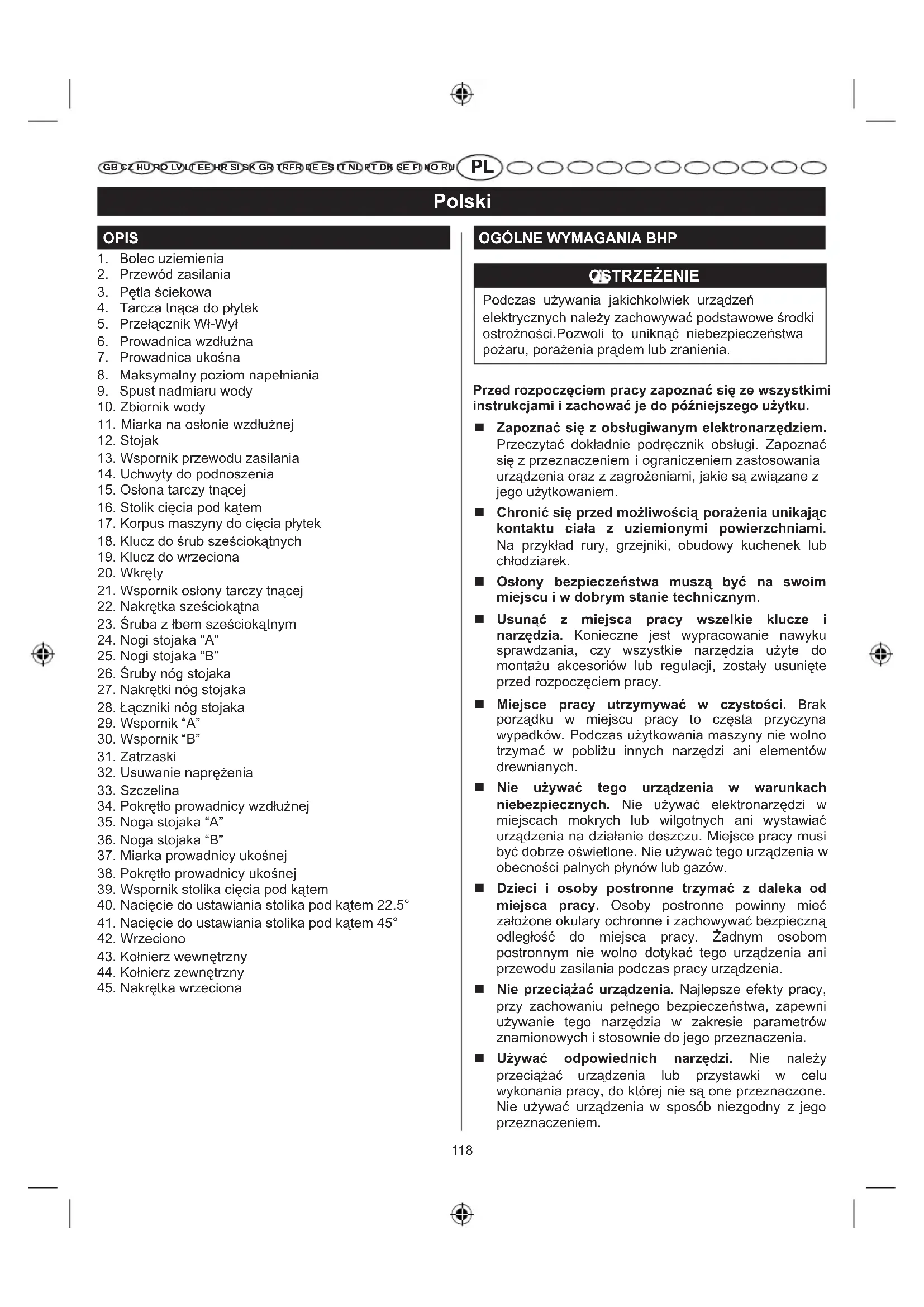 GB CZ HU RO LV LT EE HR SI SK GR TRFR DE ES IT NL PT DK SE FI NO RU Stosować odpowiednie przedłużacze. Należy upewnić się, że stosowany przedłużacz jest w dobrym stanie technicznym. Stosować przewody zasilające o odpowiedniej obciążalności. Zbyt mały przekrój przewodu zasilania spowoduje spadek napięcia, utratę mocy i przegrzewanie się urządzenia. Należy zakładać odpowiednią odzież ochronną. Nie zakładać luźnego ubioru, rękawiczek, naszyjników ani biżuterii. Mogą zostać one wciągnięte przez ruchome elementy urządzenia. Podczas pracy na zewnątrz pomieszczeń zaleca się zakładać gumowe rękawice i obuwie z podeszwą antypoślizgową (gumową). Długie włosy należy zabezpieczyć odpowiednim nakryciem głowy. Podczas pracy należy mieć założone okulary ochronne z osłonami bocznymi. Zwykłe okulary nie zapewniają odpowiedniej ochrony, NIE są to okulary ochronne. Zabezpieczyć obrabiany przedmiot. Jeśli to możliwe i praktyczne, stosować uchwyty lub zaciski mocujące obrabiany element, bezpieczniej jest mieć obydwie ręce wolne do obsługi urządzenia. Nie sięgać zbyt daleko. Należy cały czas pewnie opierać stopy i utrzymywać równowagę. Narzędzia konserwować z zachowaniem ostrożności. Narzędzia muszą być ostre i czyste – gwarantuje to wydajną i bezpieczną pracę. Przestrzegać instrukcji smarowania i wymiany przystawek i akcesoriów. Systematycznie kontrolować stan przewodów zasilających, a w przypadku stwierdzenia ich uszkodzenia, niezwłocznie dokonać naprawy w autoryzowanym serwisie. Przedłużacze należy systematycznie kontrolować i wymieniać w przypadku uszkodzenia. Rękojeści utrzymywać w czystości.Muszą być zawsze suche, wolne od oleju i smarów. Odłączać nieużywane narzędzia. Gdy urządzenia nie są używane, przed przystąpieniem do naprawy, przed zmianą przystawek lub akcesoriów, ostrzy, noży, osłon itp., należy je odłączyć od zasilania. Przed przystąpieniem do regulacji, serwisu lub konserwacji należy wyjąć wtyczkę z gniazda sieciowego. Unikać możliwości przypadkowego uruchomienia urządzenia. Przed podłączeniem urządzenia do prądu należy upewnić się, że wyłącznik znajduje się w położeniu wyłączonym. Stosować wyłącznie akcesoria zalecane przez producenta. Zapoznać się z podręcznikiem obsługi odnośnie zalecanych akcesoriów. Zastosowanie niewłaściwych akcesoriów grozi zranieniem. Nie wolno stawać na maszynie. Przewrócenie maszyny lub przypadkowy kontakt z tarczą grozi poważnym zranieniem. Kontrolować stan techniczny poszczególnych elementów. Przed użyciem narzędzia, osłony lub innego elementu, który został uszkodzony, należy mieć pewność, że jego zastosowanie nie zmniejszy poziomu bezpieczeństwa i że będzie on funkcjonować poprawnie. Sprawdzić wyrównanie elementów ruchomych, sprawdzić, czy wirują/poruszają się swobodnie, sprawdzić czy nie ma jakichkolwiek uszkodzeń, czy montaż jest poprawny. Należy uwzględnić wszystkie aspekty mające wpływ na bezpieczną prace urządzenia.Uszkodzone elementy należy naprawić lub wymienić w autoryzowanym serwisie, o ile nie podano inaczej w tym podręczniku. Zachowywać prawidłowy kierunek posuwu obrabianego elementu. Dosunąć obrabiany element do tarczy tnącej w kierunku przeciwnym do obrotów tarczy tnącej. Nie wolno zostawiać maszyny podczas pracy bez nadzoru. Wyłączyć zasilanie. Nie zostawiać urządzenia bez nadzoru, aż do całkowitego zatrzymania ruchu tarczy tnącej. Chronić układ oddechowy. W przypadku występowania zapylenia podczas cięcia, zakładać maskę przeciwpyłową lub osłonę na twarz. Chronić słuch. W przypadku dłuższego czasu pracy, zakładać środki ochrony słuchu. Nie uszkodzić przewodu zasilania. Nie ciągnąć za przewód zasilania w celu wyjęcia wtyczki z gniazda sieciowego. Przewód zasilania trzymać z dala od oleju, źródeł ciepła i ostrych krawędzi. Osłona tarczy tnącej powinna być zawsze na swoim miejscu, w dobrym stanie technicznym. Dłonie trzymać z dala od obszaru cięcia. Trzymać dłonie z dala od tarczy tnącej. Nie wolno sięgać pod obrabiany przedmiot, obok tarczy tnącej lub ponad nią, gdy tarcza się obraca. Nie należy próbować usuwać odpadków powstających podczas cięcia, gdy tarcza tnąca się obraca. Po wyłączeniu tarcza tnąca obraca się jeszcze przez pewien czas. Nie używać tego urządzenia w miejscach zagrożonych wybuchem. Iskry wytwarzane podczas pracy sinika mogą spowodować wybuch. Systematycznie kontrolować stan przewodów zasilających. W przypadku stwierdzenia uszkodzenia, niezwłocznie dokonać naprawy w autoryzowanym serwisie. Przedłużacze należy systematycznie kontrolować i wymieniać w przypadku uszkodzenia. Uziemić wszystkie narzędzia. Jeśli maszyna jest wyposażona we wtyczkę z uziemieniem, należy ją podłączyć do gniazda z uziemieniem.120 Polski
