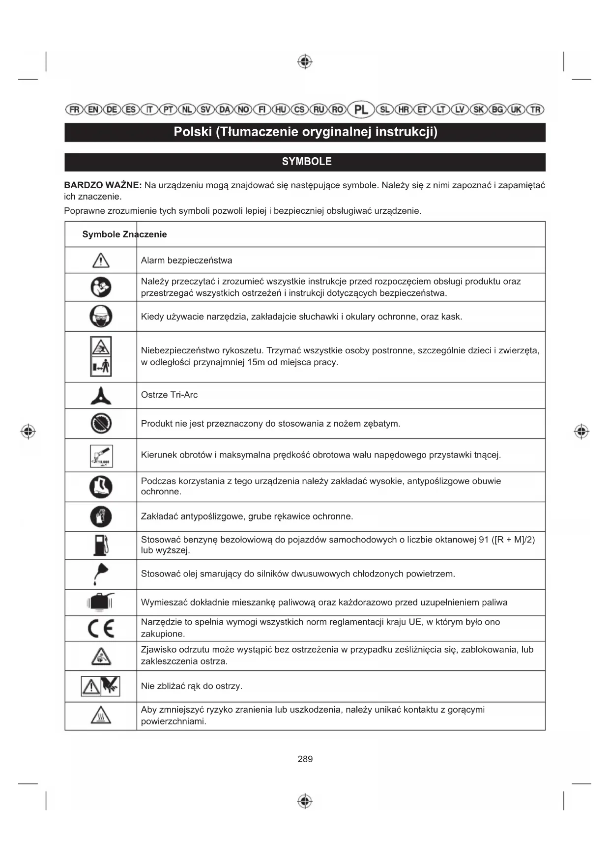pociągnij za uchwyt rozrusznika 10 – 15 razy. Spowoduje to usunięcie nadmiaru paliwa z silnika. Usunąć paliwo z urządzenia. Wyczyścić i założyć na miejsce świecę zapłonową. Przed uruchomieniem silnika wytrzeć ewentualnie rozlane paliwo i odsunąć się przynajmniej 9 m od miejsca tankowania. Pociągnąć linkę rozrusznika trzykrotnie, gdy wskazówka przepustnicy będzie znajdować się z położeniu . Jeżeli silnik nie uruchomi się, przestawić dźwignię ssania w położenie i rozpocząć standardową procedurę rozruchową. Jeżeli mimo to silnik nie daje się uruchomić, to należy powtórzyć powyższą procedurę, lecz przy założonej nowej świecy. Linka rozruchowa stawia większy opór przy ciągnięciu niż gdy była nowa. Skontaktować się z dealerem serwisu. Stare paliwo. Stosować wyłącznie świeże paliwo wymieszane z zalecanym olejem. Paliwo starsze niż 30 dni może uniemożliwić uruchomienie urządzenia. Silnik się uruchamia lecz nie przyspiesza należycie. Rozgrzanie silnika trwa około 3 minut. Poczekać, aż silnik całkowicie się rozgrzeje. Jeżeli silnik nie zacznie przyspieszać po upływie 3 minut, skontaktować się z serwisem. Silnik uruchamia się, ale działa wyłącznie na wysokich obrotach przy przepustnicy otwartej do połowy. Gaźnik wymaga regulacji. Skontaktować się z dealerem serwisu.308 Polski (Tłumaczenie oryginalnej instrukcji) Silnik nie uzyskuje pełnych obrotów i/lub wydziela zbyt dużo dymu. Sprawdźcie mieszankę paliwową. Używać świeżego paliwa i poprawić stosunek mieszanki ilości oleju do silników 2-suwowych /ilości paliwa. Brudny filtr powietrza. Wyczyścić filtr powietrza. Odnieście się do rozdziału niniejszego podręcznika "Obsługa - czyszczenie filtra powietrza." Siatka iskrochwytu jest brudna. Skontaktować się z dealerem serwisu. Silnik zapala, pracuje i przyspiesza, ale gaśnie przy wolnych obrotach. Śruba biegu jałowego na gaźniku wymaga regulacji. Skontaktować się z dealerem serwisu. Nóż nadal obraca się na biegu jałowym. Gaźnik wymaga regulacji. Skontaktować się z dealerem serwisu. Żyłka nie wysuwa się. Żyłka zgrzana sama ze sobą. Nasmarowa ć aerozolem silikonowym. Niewystarczająca ilość żyłki na szpuli. Założyć więcej żyłki. Odnieść się do rozdziału niniejszego podręcznika zatytułowanego "Konserwacja". Żyłka zużyła się i jest zbyt krótka. Ciągnąć za żyłki, na przemian naciskając i zwalniając kopułkę do zwalniania żyłki. Żyłka zaplątana na szpuli. Usunąć żyłkę ze szpuli i nawinąć ponownie. Odnieść się do rozdziału niniejszego podręcznika zatytułowanego "Konserwacja". Zbyt niska pr ędkość obrotowa silnika. Posuwać żyłkę przy w pełni otwartej przepustnicy.309 Slovensko (Prevod originalnih navodil) SIMBOLI POMEMBNO: Na izdelku so lahko uporabljeni naslednji simboli. Prosimo, preučite jih in se naučite njihovih pomenov. Pravilno razumevanje sporočila teh simbolov vam omogoča boljše in varnejše uporabljanje orodja. Simboli Razlaga Varnostni alarm Pred uporabo izdelka morate prebrati in razumeti vsa navodila, upoštevati vsa opozorila in varnostne napotke. Pri uporabi tega stroja morate nositi zaščitna očala in opremo za varovanje sluha in glave. Nevarnost odbijanja. Prisotni, še posebej otroci in živali, naj bodo med obratovanjem oddaljeni vsaj 15m od delovnega območja. Tri-Arc rezilo Izdelek ni predviden za uporabo z žagastim rezilom. Smer vrtenja in maksimalna hitrost gredi za rezalni nastavek. Ko uporabljate to opremo, nosite zaščitno obutev, ki ne drsi. Nosite si nedrseče, močne delovne zaščitne rokavice. Uporabljajte neosvinčen bencin, namenjen za motorna vozila, z oktanskim številom 91 ([R+M]/2) ali višje. Uporabljajte olje za 2-taktne motorje z zračnim hlajenjem. Pred vsakim točenjem goriva dobro premešajte mešanico goriva Ustreza vsem predpisanim standardom v državi članici EU, kjer je bil kupljen izdelek. Pride lahko do povratnega udarca rezila, ki je posledica ujetja, zaustavitve ali zadetja rezila ob oviro. Roke držite proč od rezil. Da zmanjšate tveganje poškodb ali škode, preprečite stik z vročo površino. Položaj teka310 Slovensko (Prevod originalnih navodil) Ročico dušilne lopute premaknite v položaj »FULL« (polna zadušitev). Ročico dušilne lopute premaknite v položaj »HALF« (polovična zadušitev). 10-krat pritisnite črpalni mehurček. Plin zaklenite v ustrezen položaj, tako da pritisnete gumb za zaporo plina. Čas čakanja 10 sekund