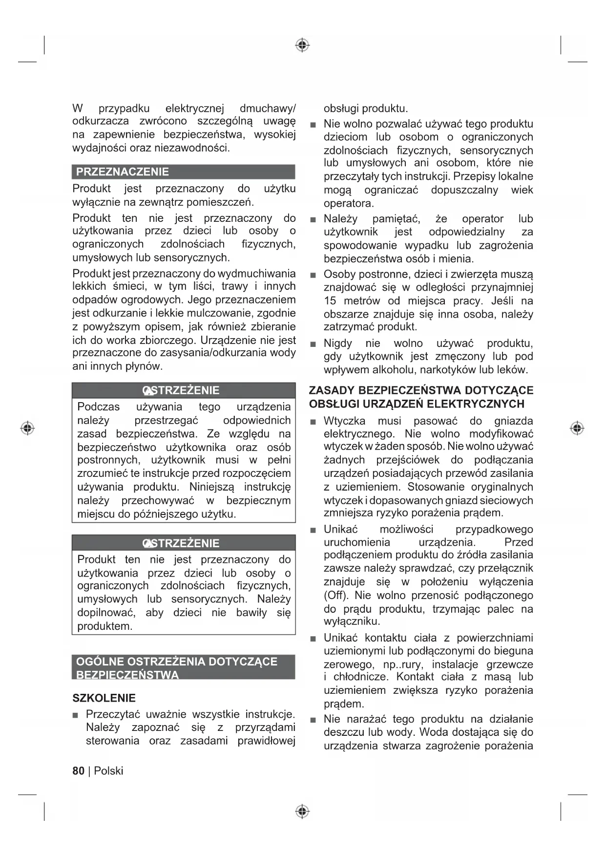 14 2780 | Polski W przypadku elektrycznej dmuchawy/ odkurzacza zwrócono szczególną uwagę na zapewnienie bezpieczeństwa, wysokiej wydajności oraz niezawodności. PRZEZNACZENIE Produkt jest przeznaczony do użytku wyłącznie na zewnątrz pomieszczeń. Produkt ten nie jest przeznaczony do użytkowania przez dzieci lub osoby o ograniczonych zdolnościach fi zycznych, umysłowych lub sensorycznych. Produkt jest przeznaczony do wydmuchiwania lekkich śmieci, w tym liści, trawy i innych odpadów ogrodowych. Jego przeznaczeniem jest odkurzanie i lekkie mulczowanie, zgodnie z powyższym opisem, jak również zbieranie ich do worka zbiorczego. Urządzenie nie jest przeznaczone do zasysania/odkurzania wody ani innych płynów. OSTRZEŻENIE Podczas używania tego urządzenia należy przestrzegać odpowiednich zasad bezpieczeństwa. Ze względu na bezpieczeństwo użytkownika oraz osób postronnych, użytkownik musi w pełni zrozumieć te instrukcje przed rozpoczęciem używania produktu. Niniejszą instrukcję należy przechowywać w bezpiecznym miejscu do późniejszego użytku. OSTRZEŻENIE Produkt ten nie jest przeznaczony do użytkowania przez dzieci lub osoby o ograniczonych zdolnościach fi zycznych, umysłowych lub sensorycznych. Należy dopilnować, aby dzieci nie bawiły się produktem.