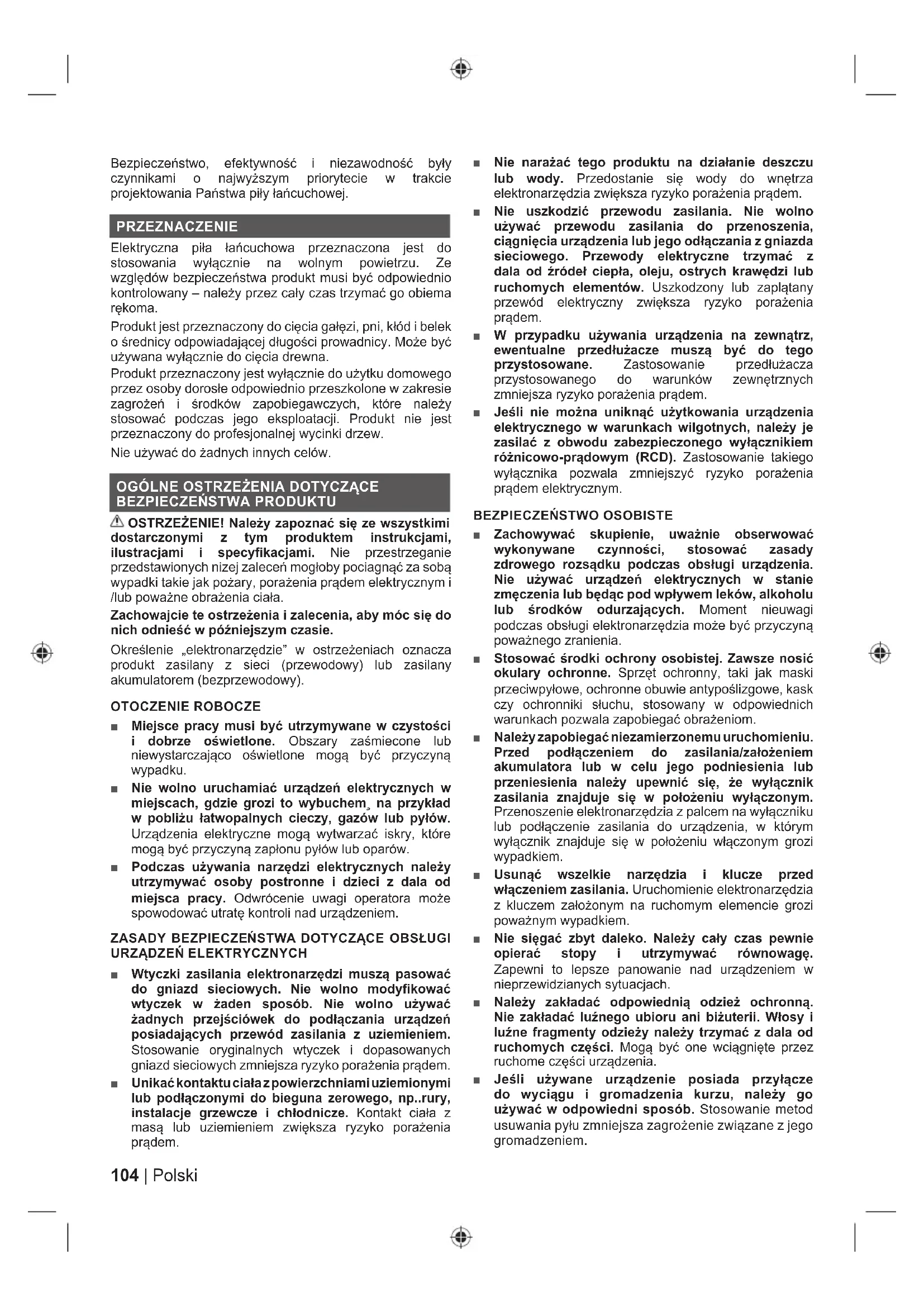 ELEKTRYCZNYCH ■ Nie przeciążać urządzenia. Używać odpowiedniego narzędzia do odpowiedniego rodzaju prac. Najlepsze efekty pracy, przy zachowaniu pełnego bezpieczeństwa, zapewni używanie urządzeń w zakresie parametrów znamionowych i stosownie do ich przeznaczenia. ■ Nie używać tego urządzenia, jeśli wyłącznik nie pracuje poprawnie. Używanie elektronarzędzia bez sprawnego wyłącznika jest zbyt niebezpieczne - należy oddać je do naprawy. ■ Przed przystąpieniem do regulacji lub wymiany akcesoriów bądź przed rozpoczęciem przechowywania należy odłączyć wtyczkę od źródła zasilania i/lub (o ile jest to możliwe) odłączyć akumulator od narzędzia z napędem. Tego rodzaju środki zapobiegawcze pozwolą zmniejszyć ryzyko przypadkowego uruchomienia elektronarzędzia. ■ Nieużywane urządzenia należy przechowywać poza zasięgiem dzieci. Nie wolno zezwalać osobom nie obeznanym z obsługą urządzeń elektrycznych na ich używane. Urządzenia elektryczne mogą być niebezpieczne w rękach osób nieposiadających odpowiedniego przygotowania. ■ Narzędzia z napędem i akcesoria należy utrzymywać w dobrym stanie technicznym. Należy sprawdzać wyrównanie elementów ruchomych, sprawdzać, czy nie ma jakichkolwiek uszkodzeń, uwzględniać wszelkie aspekty mające wpływ na bezpieczną prace urządzenia. W przypadku stwierdzenia uszkodzeń, oddać urządzenie do naprawy. Wiele wypadków spowodowane jest używaniem urządzeń w niewłaściwym stanie technicznym. ■ Elementy tnące muszą być ostre i czyste. Odpowiednio ostre krawędzie tnące ułatwią prowadzenie urządzenia i są bardziej odporne na uszkodzenie. ■ Wszelkie urządzenia, przystawki, akcesoria itp. należy używać zgodnie z dołączonymi instrukcjami obsługi, z uwzględnieniem warunków i charakteru wykonywanej pracy. Używanie narzędzi w sposób niezgodny z ich przeznaczeniem grozi poważnym niebezpieczeństwem. ■ Uchwyty i powierzchnie do trzymania muszą zawsze być suche, czyste i wolne od smaru oraz oleju. Śliskie uchwyty i powierzchnie do trzymania nie umożliwiają bezpiecznej obsługi i kontrolowania narzędzia w nieoczekiwanych sytuacjach. KONSERWACJA ■ Urządzenie elektryczne powinno być naprawiane przez wykwalifikowany personel, z zastosowaniem identycznych części zamiennych. Dzięki temu zapewnione będzie bezpieczeństwo użytkowania urządzenia. PIŁA ŁAŃCUCHOWA – OGÓLNE OSTRZEŻENIA