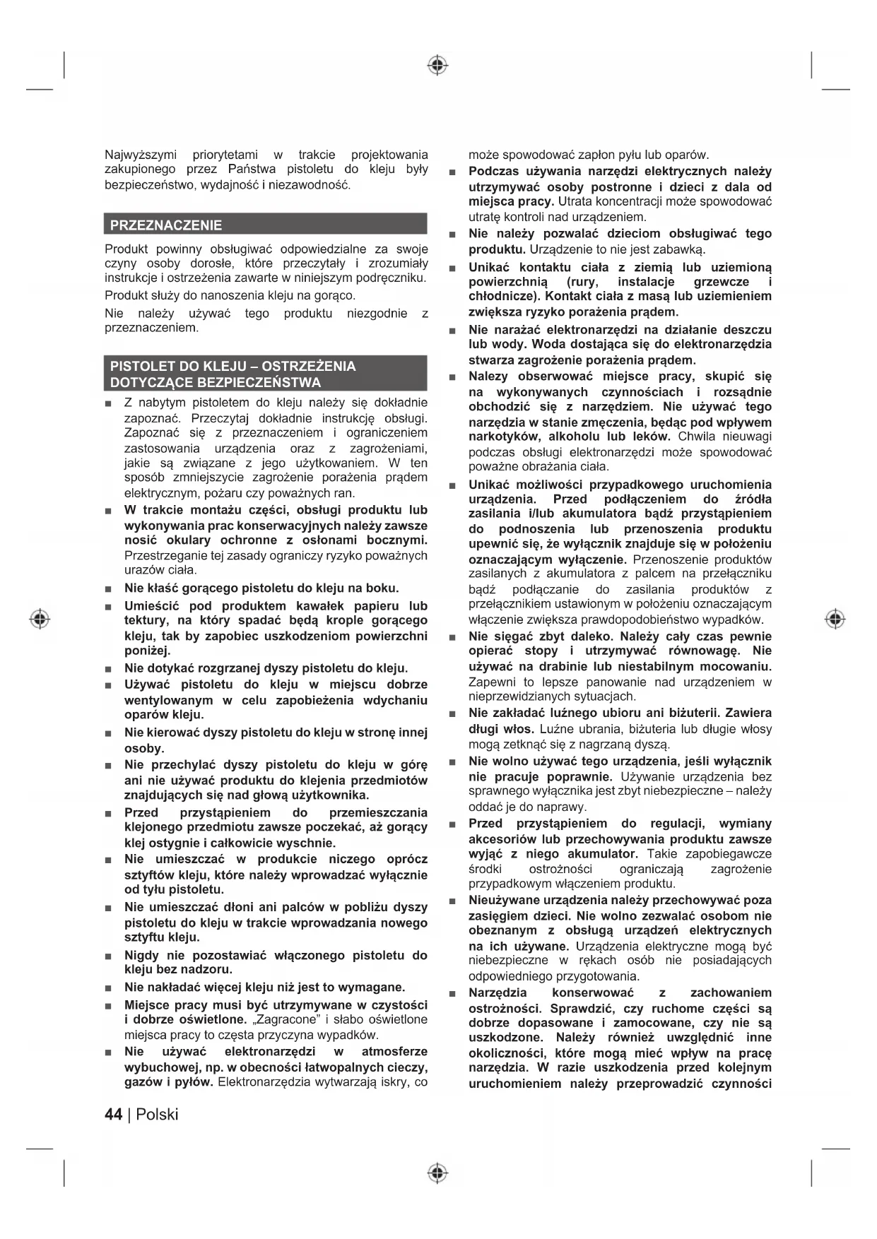 ■ Z nabytym pistoletem do kleju należy się dokładnie zapoznać. Przeczytaj dokładnie instrukcję obsługi. Zapoznać się z przeznaczeniem i ograniczeniem zastosowania urządzenia oraz z zagrożeniami, jakie są związane z jego użytkowaniem. W ten sposób zmniejszycie zagrożenie porażenia prądem elektrycznym, pożaru czy poważnych ran. ■ W trakcie montażu części, obsługi produktu lub wykonywania prac konserwacyjnych należy zawsze nosić okulary ochronne z osłonami bocznymi. Przestrzeganie tej zasady ograniczy ryzyko poważnych urazów ciała. ■ Nie kłaść gorącego pistoletu do kleju na boku. ■ Umieścić pod produktem kawałek papieru lub tektury, na który spadać będą krople gorącego kleju, tak by zapobiec uszkodzeniom powierzchni poniżej. ■ Nie dotykać rozgrzanej dyszy pistoletu do kleju. ■ Używać pistoletu do kleju w miejscu dobrze wentylowanym w celu zapobieżenia wdychaniu oparów kleju. ■ Nie kierować dyszy pistoletu do kleju w stronę innej osoby. ■ Nie przechylać dyszy pistoletu do kleju w górę ani nie używać produktu do klejenia przedmiotów znajdujących się nad głową użytkownika. ■ Przed przystąpieniem do przemieszczania klejonego przedmiotu zawsze poczekać, aż gorący klej ostygnie i całkowicie wyschnie. ■ Nie umieszczać w produkcie niczego oprócz sztyftów kleju, które należy wprowadzać wyłącznie od tyłu pistoletu. ■ Nie umieszczać dłoni ani palców w pobliżu dyszy pistoletu do kleju w trakcie wprowadzania nowego sztyftu kleju. ■ Nigdy nie pozostawiać włączonego pistoletu do kleju bez nadzoru. ■ Nie nakładać więcej kleju niż jest to wymagane. ■ Miejsce pracy musi być utrzymywane w czystości i dobrze oświetlone. „Zagracone” i słabo oświetlone miejsca pracy to częsta przyczyna wypadków. ■ Nie używać elektronarzędzi w atmosferze wybuchowej, np. w obecności łatwopalnych cieczy, gazów i pyłów. Elektronarzędzia wytwarzają iskry, co może spowodować zapłon pyłu lub oparów. ■ Podczas używania narzędzi elektrycznych należy utrzymywać osoby postronne i dzieci z dala od miejsca pracy. Utrata koncentracji może spowodować utratę kontroli nad urządzeniem. ■ Nie należy pozwalać dzieciom obsługiwać tego produktu. Urządzenie to nie jest zabawką. ■ Unikać kontaktu ciała z ziemią lub uziemioną powierzchnią (rury, instalacje grzewcze i chłodnicze). Kontakt ciała z masą lub uziemieniem zwiększa ryzyko porażenia prądem. ■ Nie narażać elektronarzędzi na działanie deszczu lub wody. Woda dostająca się do elektronarzędzia stwarza zagrożenie porażenia prądem. ■ Nalezy obserwować miejsce pracy, skupić się na wykonywanych czynnościach i rozsądnie obchodzić się z narzędziem. Nie używać tego narzędzia w stanie zmęczenia, będąc pod wpływem narkotyków, alkoholu lub leków. Chwila nieuwagi podczas obsługi elektronarzędzi może spowodować poważne obrażania ciała. ■ Unikać możliwości przypadkowego uruchomienia urządzenia. Przed podłączeniem do źródła zasilania i/lub akumulatora bądź przystąpieniem do podnoszenia lub przenoszenia produktu upewnić się, że wyłącznik znajduje się w położeniu oznaczającym wyłączenie. Przenoszenie produktów zasilanych z akumulatora z palcem na przełączniku bądź podłączanie do zasilania produktów z przełącznikiem ustawionym w położeniu oznaczającym włączenie zwiększa prawdopodobieństwo wypadków. ■ Nie sięgać zbyt daleko. Należy cały czas pewnie opierać stopy i utrzymywać równowagę. Nie używać na drabinie lub niestabilnym mocowaniu. Zapewni to lepsze panowanie nad urządzeniem w nieprzewidzianych sytuacjach. ■ Nie zakładać luźnego ubioru ani biżuterii. Zawiera długi włos. Luźne ubrania, biżuteria lub długie włosy mogą zetknąć się z nagrzaną dyszą. ■ Nie wolno używać tego urządzenia, jeśli wyłącznik nie pracuje poprawnie. Używanie urządzenia bez sprawnego wyłącznika jest zbyt niebezpieczne – należy oddać je do naprawy. ■ Przed przystąpieniem do regulacji, wymiany akcesoriów lub przechowywania produktu zawsze wyjąć z niego akumulator. Takie zapobiegawcze środki ostrożności ograniczają zagrożenie przypadkowym włączeniem produktu. ■ Nieużywane urządzenia należy przechowywać poza zasięgiem dzieci. Nie wolno zezwalać osobom nie obeznanym z obsługą urządzeń elektrycznych na ich używane. Urządzenia elektryczne mogą być niebezpieczne w rękach osób nie posiadających odpowiedniego przygotowania. ■ Narzędzia konserwować z zachowaniem ostrożności. Sprawdzić, czy ruchome części są dobrze dopasowane i zamocowane, czy nie są uszkodzone. Należy również uwzględnić inne okoliczności, które mogą mieć wpływ na pracę narzędzia. W razie uszkodzenia przed kolejnym uruchomieniem należy przeprowadzić czynności45 Polski |