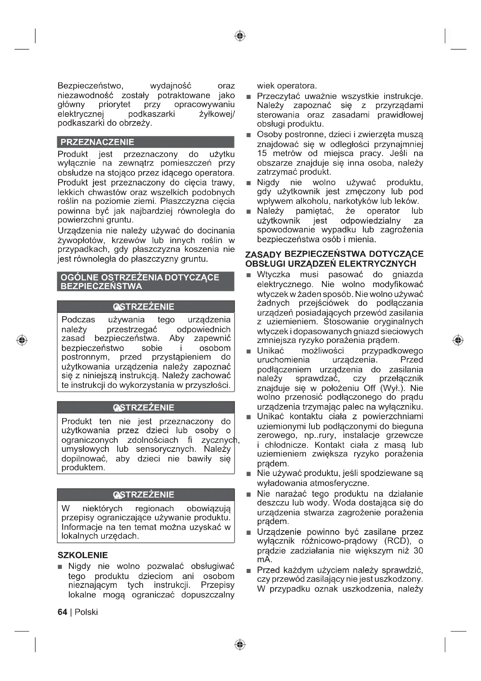 14 2764 | Polski BezpieczeĔstwo, wydajnoĞü oraz niezawodnoĞü zostaáy potraktowane jako gáówny priorytet przy opracowywaniu elektrycznej podkaszarki Īyákowej/ podkaszarki do obrzeĪy. PRZEZNACZENIE Produkt jest przeznaczony do uĪytku wyáącznie na zewnątrz pomieszczeĔ przy obsáudze na stojąco przez idącego operatora. Produkt jest przeznaczony do ciĊcia trawy, lekkich chwastów oraz wszelkich podobnych roĞlin na poziomie ziemi. Páaszczyzna ciĊcia powinna byü jak najbardziej równolegáa do powierzchni gruntu. Urządzenia nie naleĪy uĪywaü do docinania Īywopáotów, krzewów lub innych roĞlin w przypadkach, gdy páaszczyzna koszenia nie jest równolegáa do páaszczyzny gruntu. OGÓLNE OSTRZEĩENIA DOTYCZĄCE BEZPIECZEēSTWA OSTRZEĩENIE Podczas uĪywania tego urządzenia naleĪy przestrzegaü odpowiednich zasad bezpieczeĔstwa. Aby zapewniü bezpieczeĔstwo sobie i osobom postronnym, przed przystąpieniem do uĪytkowania urządzenia naleĪy zapoznaü siĊ z niniejszą instrukcją. NaleĪy zachowaü te instrukcji do wykorzystania w przyszáoĞci. OSTRZEĩENIE Produkt ten nie jest przeznaczony do uĪytkowania przez dzieci lub osoby o ograniczonych zdolnoĞciach zycznych, umysáowych lub sensorycznych. NaleĪy dopilnowaü, aby dzieci nie bawiáy siĊ produktem. OSTRZEĩENIE W niektórych regionach obowiązują przepisy ograniczające uĪywanie produktu. Informacje na ten temat moĪna uzyskaü w lokalnych urzĊdach. SZKOLENIE Ŷ Nigdy nie wolno pozwalaü obsáugiwaü tego produktu dzieciom ani osobom nieznającym tych instrukcji. Przepisy lokalne mogą ograniczaü dopuszczalny wiek operatora. Ŷ Przeczytaü uwaĪnie wszystkie instrukcje. NaleĪy zapoznaü siĊ z przyrządami sterowania oraz zasadami prawidáowej obsáugi produktu. Ŷ Osoby postronne, dzieci i zwierzĊta muszą znajdowaü siĊ w odlegáoĞci przynajmniej 15 metrów od miejsca pracy. JeĞli na obszarze znajduje siĊ inna osoba, naleĪy zatrzymaü produkt. Ŷ Nigdy nie wolno uĪywaü produktu, gdy uĪytkownik jest zmĊczony lub pod wpáywem alkoholu, narkotyków lub leków. Ŷ NaleĪy pamiĊtaü, Īe operator lub uĪytkownik jest odpowiedzialny za spowodowanie wypadku lub zagroĪenia bezpieczeĔstwa osób i mienia. ZASADY BEZPIECZEēSTWA DOTYCZĄCE OBSàUGI URZĄDZEē ELEKTRYCZNYCH Ŷ Wtyczka musi pasowaü do gniazda elektrycznego. Nie wolno modyfikowaü wtyczek w Īaden sposób. Nie wolno uĪywaü Īadnych przejĞciówek do podáączania urządzeĔ posiadających przewód zasilania z uziemieniem. Stosowanie oryginalnych wtyczek i dopasowanych gniazd sieciowych zmniejsza ryzyko poraĪenia prądem. Ŷ Unikaü moĪliwoĞci przypadkowego uruchomienia urządzenia. Przed podáączeniem urządzenia do zasilania naleĪy sprawdzaü, czy przeáącznik znajduje siĊ w poáoĪeniu Off (Wyá.). Nie wolno przenosiü podáączonego do prądu urządzenia trzymając palec na wyáączniku. Ŷ Unikaü kontaktu ciaáa z powierzchniami uziemionymi lub podáączonymi do bieguna zerowego, np..rury, instalacje grzewcze i cháodnicze. Kontakt ciaáa z masą lub uziemieniem zwiĊksza ryzyko poraĪenia prądem. Ŷ Nie uĪywaü produktu, jeĞli spodziewane są wyáadowania atmosferyczne. Ŷ Nie naraĪaü tego produktu na dziaáanie deszczu lub wody. Woda dostająca siĊ do urządzenia stwarza zagroĪenie poraĪenia prądem. Ŷ Urządzenie powinno byü zasilane przez wyáącznik róĪnicowo-prądowy (RCD), o prądzie zadziaáania nie wiĊkszym niĪ 30 mA. Ŷ Przed kaĪdym uĪyciem naleĪy sprawdziü, czy przewód zasilający nie jest uszkodzony. W przypadku oznak uszkodzenia, naleĪy65 Polski |