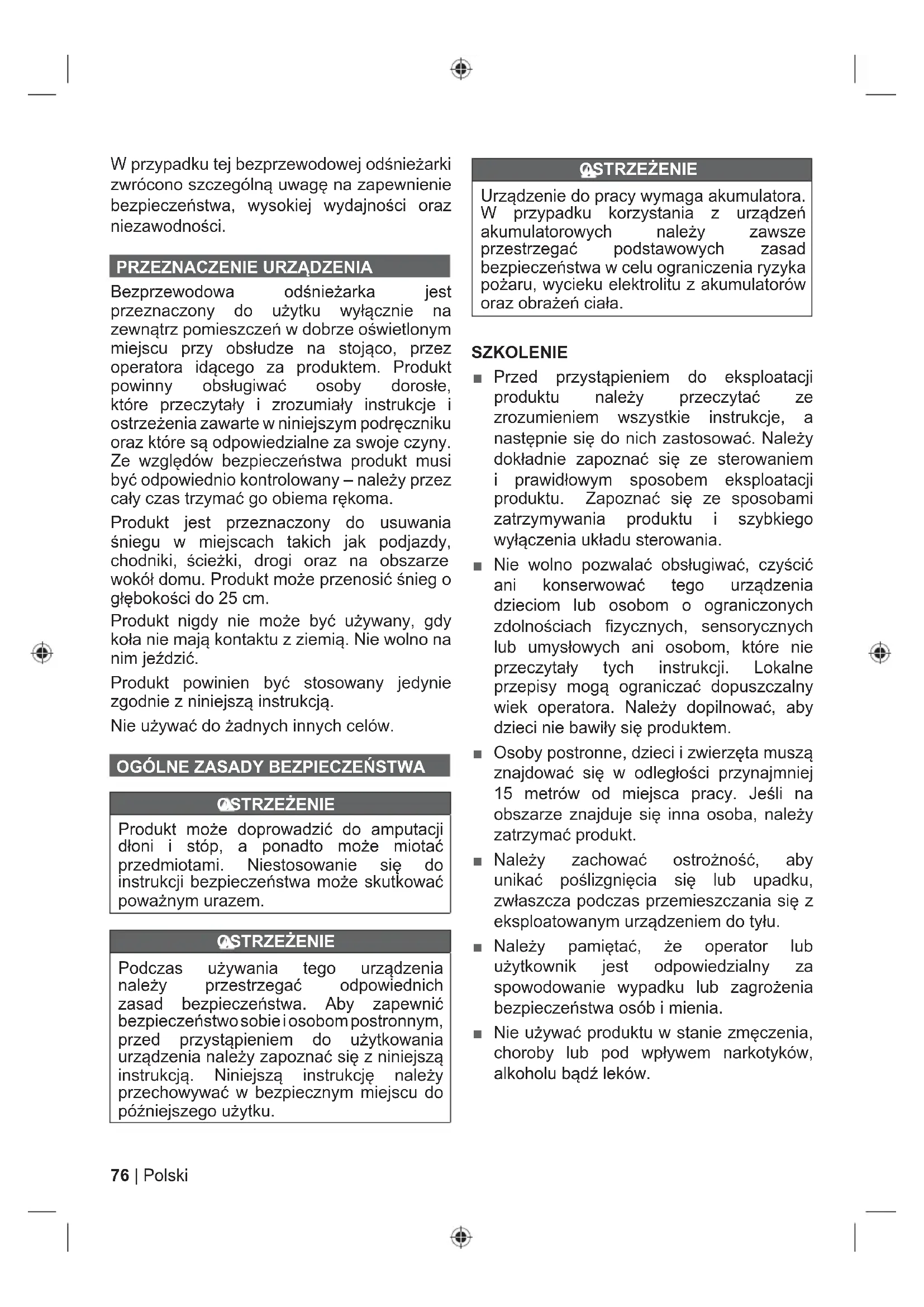 Bezprzewodowa odśnieżarka jest przeznaczony do użytku wyłącznie na zewnątrz pomieszczeń w dobrze oświetlonym miejscu przy obsłudze na stojąco, przez operatora idącego za produktem. Produkt powinny obsługiwać osoby dorosłe, które przeczytały i zrozumiały instrukcje i ostrzeżenia zawarte w niniejszym podręczniku oraz które są odpowiedzialne za swoje czyny. Ze względów bezpieczeństwa produkt musi być odpowiednio kontrolowany – należy przez cały czas trzymać go obiema rękoma. Produkt jest przeznaczony do usuwania śniegu w miejscach takich jak podjazdy, chodniki, ścieżki, drogi oraz na obszarze wokół domu. Produkt może przenosić śnieg o głębokości do 25 cm. Produkt nigdy nie może być używany, gdy koła nie mają kontaktu z ziemią. Nie wolno na nim jeździ