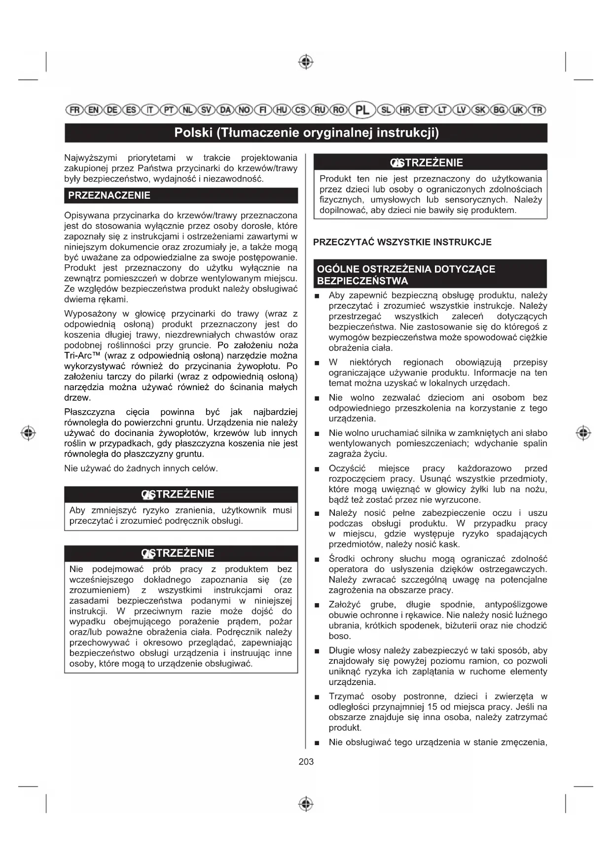 AVERTISMENT Capacul de alimentare cu combustibil care prezintă scurgeri este un pericol de incendiu şi trebuie înlocuit imediat.202 Română (Traducere din versiunea originală a instrucţiunilor) Capacul de alimentare cu carburant conţine un fi ltru care nu necesită service şi o supapă de reţinere. Un fi ltru de combustibil înfundat va duce la scăderea performanţei motorului. În cazul în care performanţa este îmbunătăţită în cazul în care capacul de alimentare cu carburant este slăbit, supapa de reţinere poate fi defectă sau fi ltrul poate fi înfundat. Înlocuiţi capacul de alimentare cu carburant. BUJIE Acest motor utilizează o bujie L8RTF/NHSP LD sau L8RTF/BOSCH (sau compatibilă) cu distanța de 0,5 mm între electrozi. Utilizaţi o piesă de schimb identică. ATENŢIE Aveţi grijă să introduceţi bujia corect; în caz contrar. Alinierea greşită a fi leturilor va deteriora grav motorul.203 Polski (Tłumaczenie oryginalnej instrukcji) Najwyższymi priorytetami w trakcie projektowania zakupionej przez Państwa przycinarki do krzewów/trawy były bezpieczeństwo, wydajność i niezawodność. PRZEZNACZENIE Opisywana przycinarka do krzewów/trawy przeznaczona jest do stosowania wyłącznie przez osoby dorosłe, które zapoznały się z instrukcjami i ostrzeżeniami zawartymi w niniejszym dokumencie oraz zrozumiały je, a także mogą być uważane za odpowiedzialne za swoje postępowanie. Produkt jest przeznaczony do użytku wyłącznie na zewnątrz pomieszczeń w dobrze wentylowanym miejscu. Ze względów bezpieczeństwa produkt należy obsługiwać dwiema rękami. Wyposażony w głowicę przycinarki do trawy (wraz z odpowiednią osłoną) produkt przeznaczony jest do koszenia długiej trawy, niezdrewniałych chwastów oraz podobnej roślinności przy gruncie. Po założeniu noża Tri-Arc™ (wraz z odpowiednią osłoną) narzędzie można wykorzystywać również do przycinania żywopłotu. Po założeniu tarczy do pilarki (wraz z odpowiednią osłoną) narzędzia można używać również do ścinania małych drzew. Płaszczyzna cięcia powinna być jak najbardziej równoległa do powierzchni gruntu. Urządzenia nie należy używać do docinania żywopłotów, krzewów lub innych roślin w przypadkach, gdy płaszczyzna koszenia nie jest równoległa do płaszczyzny gruntu. Nie używać do żadnych innych celów. OSTRZEŻENIE Aby zmniejszyć ryzyko zranienia, użytkownik musi przeczytać i zrozumieć podręcznik obsługi. OSTRZEŻENIE Nie podejmować prób pracy z produktem bez wcześniejszego dokładnego zapoznania się (ze zrozumieniem) z wszystkimi instrukcjami oraz zasadami bezpieczeństwa podanymi w niniejszej instrukcji. W przeciwnym razie może dojść do wypadku obejmującego porażenie prądem, pożar oraz/lub poważne obrażenia ciała. Podręcznik należy przechowywać i okresowo przeglądać, zapewniając bezpieczeństwo obsługi urządzenia i instruując inne osoby, które mogą to urządzenie obsługiwać. OSTRZEŻENIE Produkt ten nie jest przeznaczony do użytkowania przez dzieci lub osoby o ograniczonych zdolnościach fizycznych, umysłowych lub sensorycznych. Należy dopilnować, aby dzieci nie bawiły się produktem.