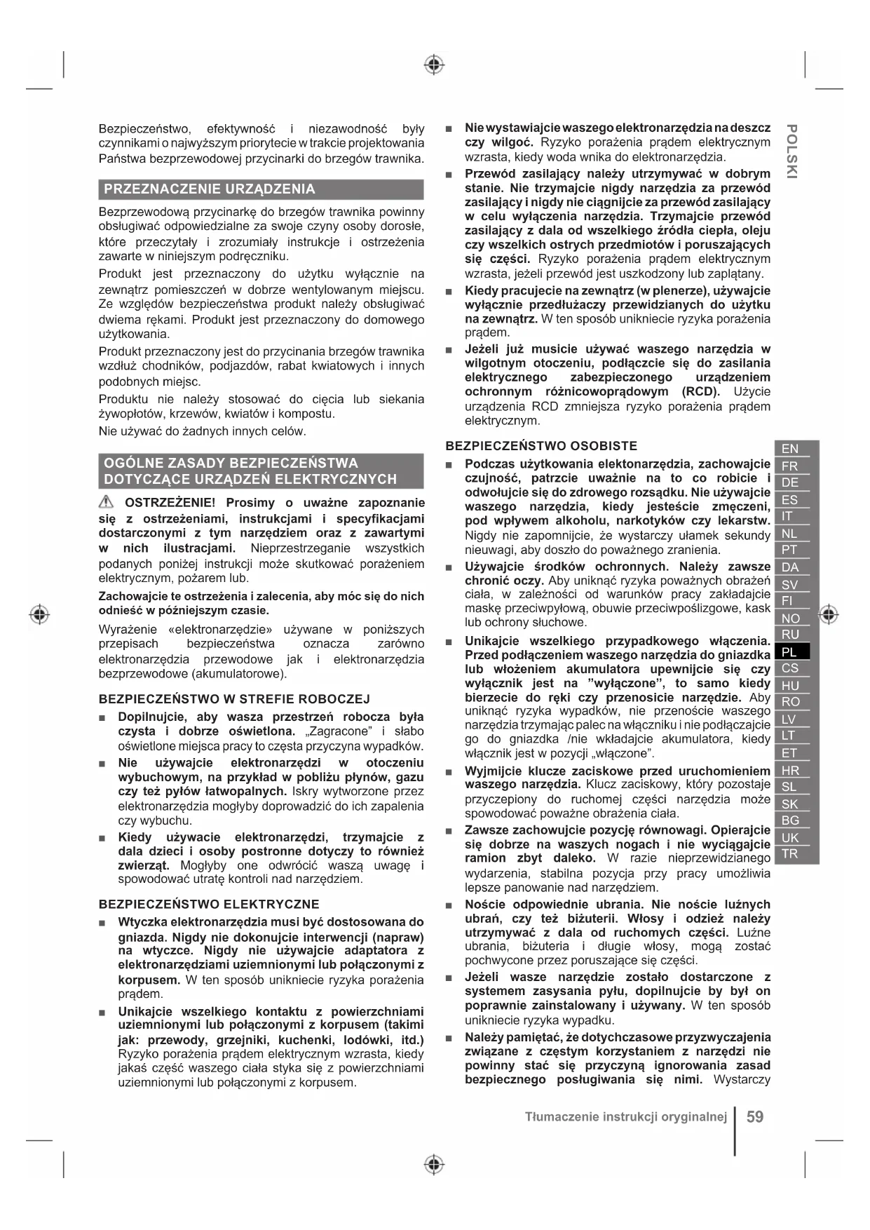 Перевод оригинальных инструкцийBezpieczeństwo, efektywność i niezawodność były czynnikami o najwyższym priorytecie w trakcie projektowania Państwa bezprzewodowej przycinarki do brzegów trawnika.