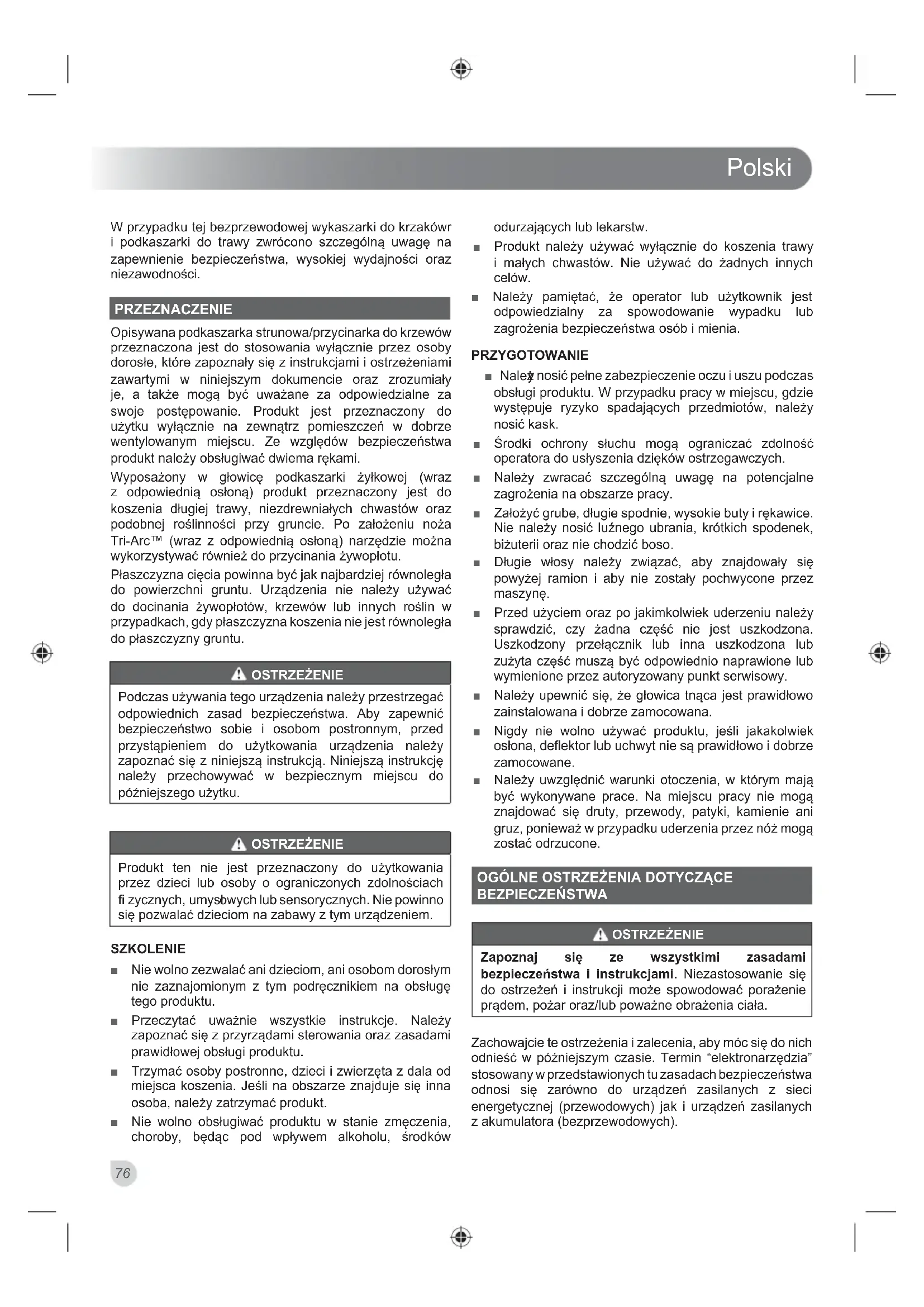 W przypadku tej bezprzewodowej wykaszarki do krzakówr i podkaszarki do trawy zwrócono szczególną uwagę na zapewnienie bezpieczeństwa, wysokiej wydajności oraz niezawodności. PRZEZNACZENIE Opisywana podkaszarka strunowa/przycinarka do krzewów przeznaczona jest do stosowania wyłącznie przez osoby dorosłe, które zapoznały się z instrukcjami i ostrzeżeniami zawartymi w niniejszym dokumencie oraz zrozumiały je, a także mogą być uważane za odpowiedzialne za swoje postępowanie. Produkt jest przeznaczony do użytku wyłącznie na zewnątrz pomieszczeń w dobrze wentylowanym miejscu. Ze względów bezpieczeństwa produkt należy obsługiwać dwiema rękami. Wyposażony w głowicę podkaszarki żyłkowej (wraz z odpowiednią osłoną) produkt przeznaczony jest do koszenia długiej trawy, niezdrewniałych chwastów oraz podobnej roślinności przy gruncie. Po założeniu noża Tri-Arc™ (wraz z odpowiednią osłoną) narzędzie można wykorzystywać również do przycinania żywopłotu. Płaszczyzna cięcia powinna być jak najbardziej równoległa do powierzchni gruntu. Urządzenia nie należy używać do docinania żywopłotów, krzewów lub innych roślin w przypadkach, gdy płaszczyzna koszenia nie jest równoległa do płaszczyzny gruntu. OSTRZEŻENIE Podczas używania tego urządzenia należy przestrzegać odpowiednich zasad bezpieczeństwa. Aby zapewnić bezpieczeństwo sobie i osobom postronnym, przed przystąpieniem do użytkowania urządzenia należy zapoznać się z niniejszą instrukcją. Niniejszą instrukcję należy przechowywać w bezpiecznym miejscu do późniejszego użytku. OSTRZEŻENIE Produkt ten nie jest przeznaczony do użytkowania przez dzieci lub osoby o ograniczonych zdolnościach fi zycznych, umysł owych lub sensorycznych. Nie powinno się pozwalać dzieciom na zabawy z tym urządzeniem. SZKOLENIE ■ Nie wolno zezwalać ani dzieciom, ani osobom dorosłym nie zaznajomionym z tym podręcznikiem na obsługę tego produktu. ■ Przeczytać uważnie wszystkie instrukcje. Należy zapoznać się z przyrządami sterowania oraz zasadami prawidłowej obsługi produktu. ■ Trzymać osoby postronne, dzieci i zwierzęta z dala od miejsca koszenia. Jeśli na obszarze znajduje się inna osoba, należy zatrzymać produkt. ■ Nie wolno obsługiwać produktu w stanie zmęczenia, choroby, będąc pod wpływem alkoholu, środków odurzających lub lekarstw. ■ Produkt należy używać wyłącznie do koszenia trawy i małych chwastów. Nie używać do żadnych innych celów. ■ Należy pamiętać, że operator lub użytkownik jest odpowiedzialny za spowodowanie wypadku lub zagrożenia bezpieczeństwa osób i mienia. PRZYGOTOWANIE ■ Należ y nosić pełne zabezpieczenie oczu i uszu podczas obsługi produktu. W przypadku pracy w miejscu, gdzie występuje ryzyko spadających przedmiotów, należy nosić kask. ■ Środki ochrony słuchu mogą ograniczać zdolność operatora do usłyszenia dzięków ostrzegawczych. ■ Należy zwracać szczególną uwagę na potencjalne zagrożenia na obszarze pracy. ■ Założyć grube, długie spodnie, wysokie buty i rękawice. Nie należy nosić luźnego ubrania, krótkich spodenek, biżuterii oraz nie chodzić boso. ■ Długie włosy należy związać, aby znajdowały się powyżej ramion i aby nie zostały pochwycone przez maszynę. ■ Przed użyciem oraz po jakimkolwiek uderzeniu należy sprawdzić, czy żadna część nie jest uszkodzona. Uszkodzony przełącznik lub inna uszkodzona lub zużyta część muszą być odpowiednio naprawione lub wymienione przez autoryzowany punkt serwisowy. ■ Należy upewnić się, że głowica tnąca jest prawidłowo zainstalowana i dobrze zamocowana. ■ Nigdy nie wolno używać produktu, jeśli jakakolwiek osłona, deflektor lub uchwyt nie są prawidłowo i dobrze zamocowane. ■ Należy uwzględnić warunki otoczenia, w którym mają być wykonywane prace. Na miejscu pracy nie mogą znajdować się druty, przewody, patyki, kamienie ani gruz, ponieważ w przypadku uderzenia przez nóż mogą zostać odrzucone.