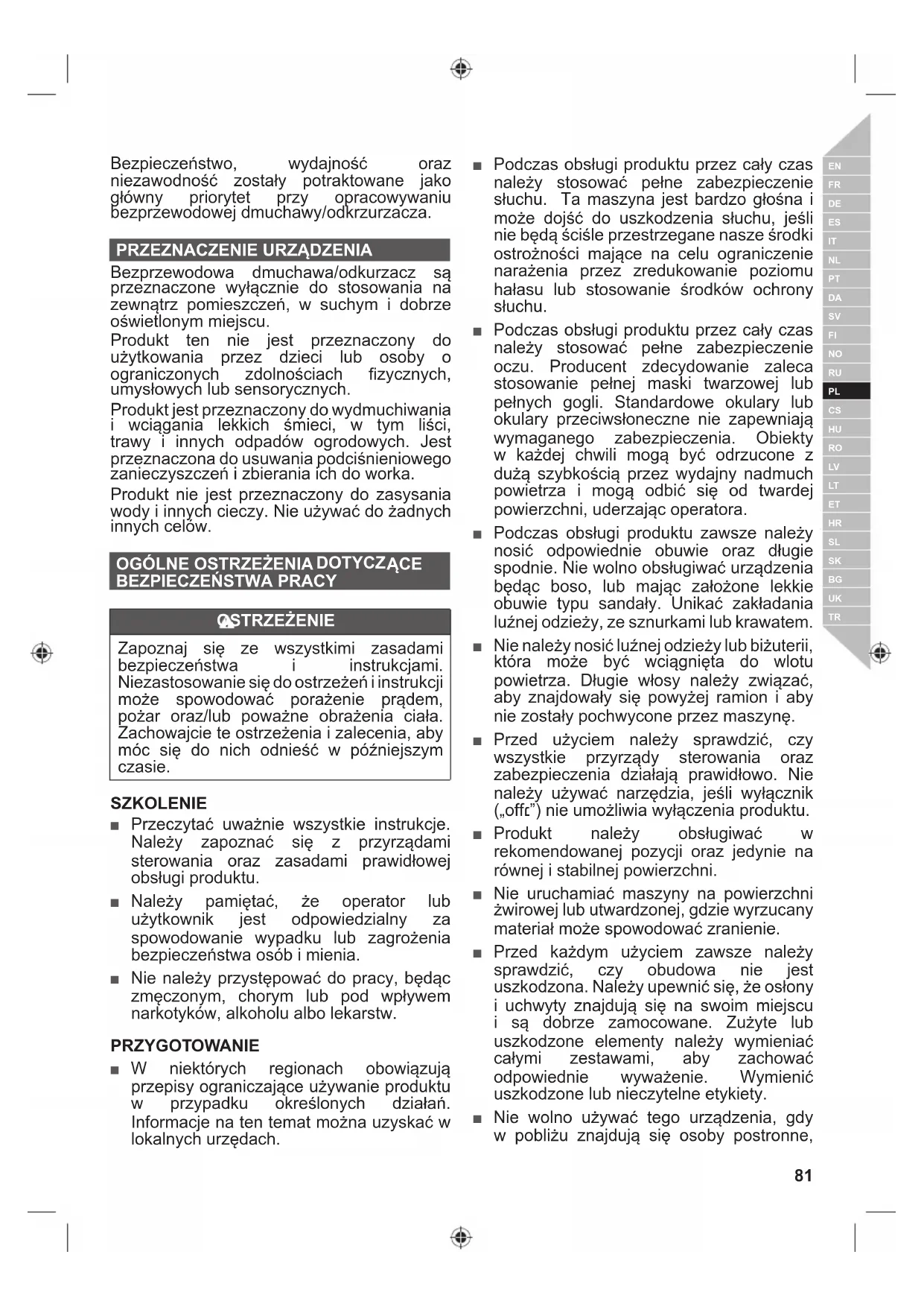 Bezprzewodowa dmuchawa/odkurzacz są przeznaczone wyłącznie do stosowania na zewnątrz pomieszczeń, w suchym i dobrze oświetlonym miejscu. Produkt ten nie jest przeznaczony do użytkowania przez dzieci lub osoby o ograniczonych zdolnościach fi zycznych, umysłowych lub sensorycznych. Produkt jest przeznaczony do wydmuchiwania i wciągania lekkich śmieci, w tym liści, trawy i innych odpadów ogrodowych. Jest przeznaczona do usuwania podciśnieniowego zanieczyszczeń i zbierania ich do worka. Produkt nie jest przeznaczony do zasysania wody i innych cieczy. Nie używać do żadnych innych celów.