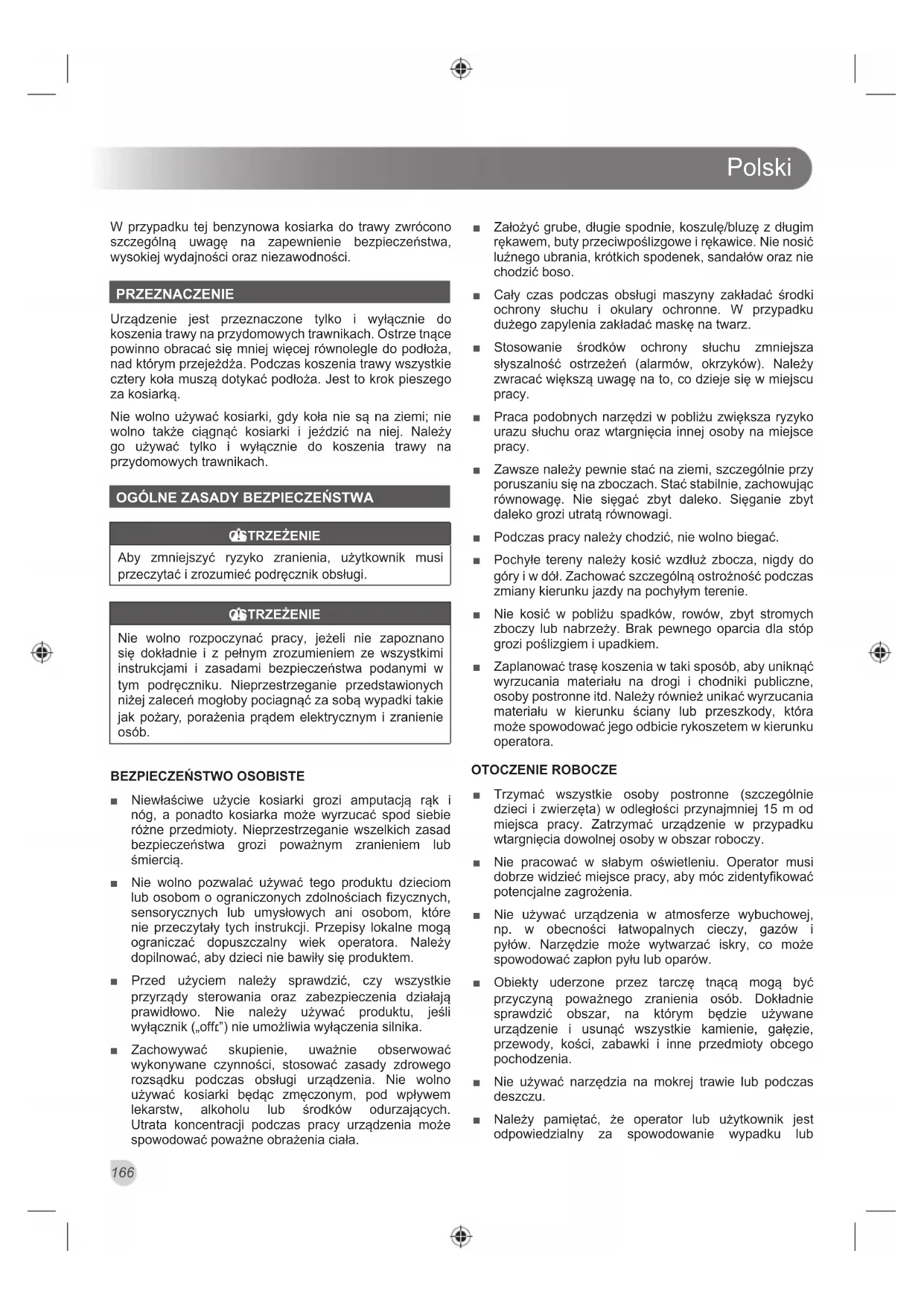 ■ Niewłaściwe użycie kosiarki grozi amputacją rąk i nóg, a ponadto kosiarka może wyrzucać spod siebie różne przedmioty. Nieprzestrzeganie wszelkich zasad bezpieczeństwa grozi poważnym zranieniem lub śmiercią. ■ Nie wolno pozwalać używać tego produktu dzieciom lub osobom o ograniczonych zdolnościach fizycznych, sensorycznych lub umysłowych ani osobom, które nie przeczytały tych instrukcji. Przepisy lokalne mogą ograniczać dopuszczalny wiek operatora. Należy dopilnować, aby dzieci nie bawiły się produktem. ■ Przed użyciem należy sprawdzić, czy wszystkie przyrządy sterowania oraz zabezpieczenia działają prawidłowo. Nie należy używać produktu, jeśli wyłącznik („off׆”) nie umożliwia wyłączenia silnika. ■ Zachowywać skupienie, uważnie obserwować wykonywane czynności, stosować zasady zdrowego rozsądku podczas obsługi urządzenia. Nie wolno używać kosiarki będąc zmęczonym, pod wpływem lekarstw, alkoholu lub środków odurzających. Utrata koncentracji podczas pracy urządzenia może spowodować poważne obrażenia ciała. ■ Założyć grube, długie spodnie, koszulę/bluzę z długim rękawem, buty przeciwpoślizgowe i rękawice. Nie nosić luźnego ubrania, krótkich spodenek, sandałów oraz nie chodzić boso. ■ Cały czas podczas obsługi maszyny zakładać środki ochrony słuchu i okulary ochronne. W przypadku dużego zapylenia zakładać maskę na twarz. ■ Stosowanie środków ochrony słuchu zmniejsza słyszalność ostrzeżeń (alarmów, okrzyków). Należy zwracać większą uwagę na to, co dzieje się w miejscu pracy. ■ Praca podobnych narzędzi w pobliżu zwiększa ryzyko urazu słuchu oraz wtargnięcia innej osoby na miejsce pracy. ■ Zawsze należy pewnie stać na ziemi, szczególnie przy poruszaniu się na zboczach. Stać stabilnie, zachowując równowagę. Nie sięgać zbyt daleko. Sięganie zbyt daleko grozi utratą równowagi. ■ Podczas pracy należy chodzić, nie wolno biegać. ■ Pochyłe tereny należy kosić wzdłuż zbocza, nigdy do góry i w dół. Zachować szczególną ostrożność podczas zmiany kierunku jazdy na pochyłym terenie. ■ Nie kosić w pobliżu spadków, rowów, zbyt stromych zboczy lub nabrzeży. Brak pewnego oparcia dla stóp grozi poślizgiem i upadkiem. ■ Zaplanować trasę koszenia w taki sposób, aby uniknąć wyrzucania materiału na drogi i chodniki publiczne, osoby postronne itd. Należy również unikać wyrzucania materiału w kierunku ściany lub przeszkody, która może spowodować jego odbicie rykoszetem w kierunku operatora. OTOCZENIE ROBOCZE ■ Trzymać wszystkie osoby postronne (szczególnie dzieci i zwierzęta) w odległości przynajmniej 15 m od miejsca pracy. Zatrzymać urządzenie w przypadku wtargnięcia dowolnej osoby w obszar roboczy. ■ Nie pracować w słabym oświetleniu. Operator musi dobrze widzieć miejsce pracy, aby móc zidentyfikować potencjalne zagrożenia. ■ Nie używać urządzenia w atmosferze wybuchowej, np. w obecności łatwopalnych cieczy, gazów i pyłów. Narzędzie może wytwarzać iskry, co może spowodować zapłon pyłu lub oparów. ■ Obiekty uderzone przez tarczę tnącą mogą być przyczyną poważnego zranienia osób. Dokładnie sprawdzić obszar, na którym będzie używane urządzenie i usunąć wszystkie kamienie, gałęzie, przewody, kości, zabawki i inne przedmioty obcego pochodzenia. ■ Nie używać narzędzia na mokrej trawie lub podczas deszczu. ■ Należy pamiętać, że operator lub użytkownik jest odpowiedzialny za spowodowanie wypadku lubPolski