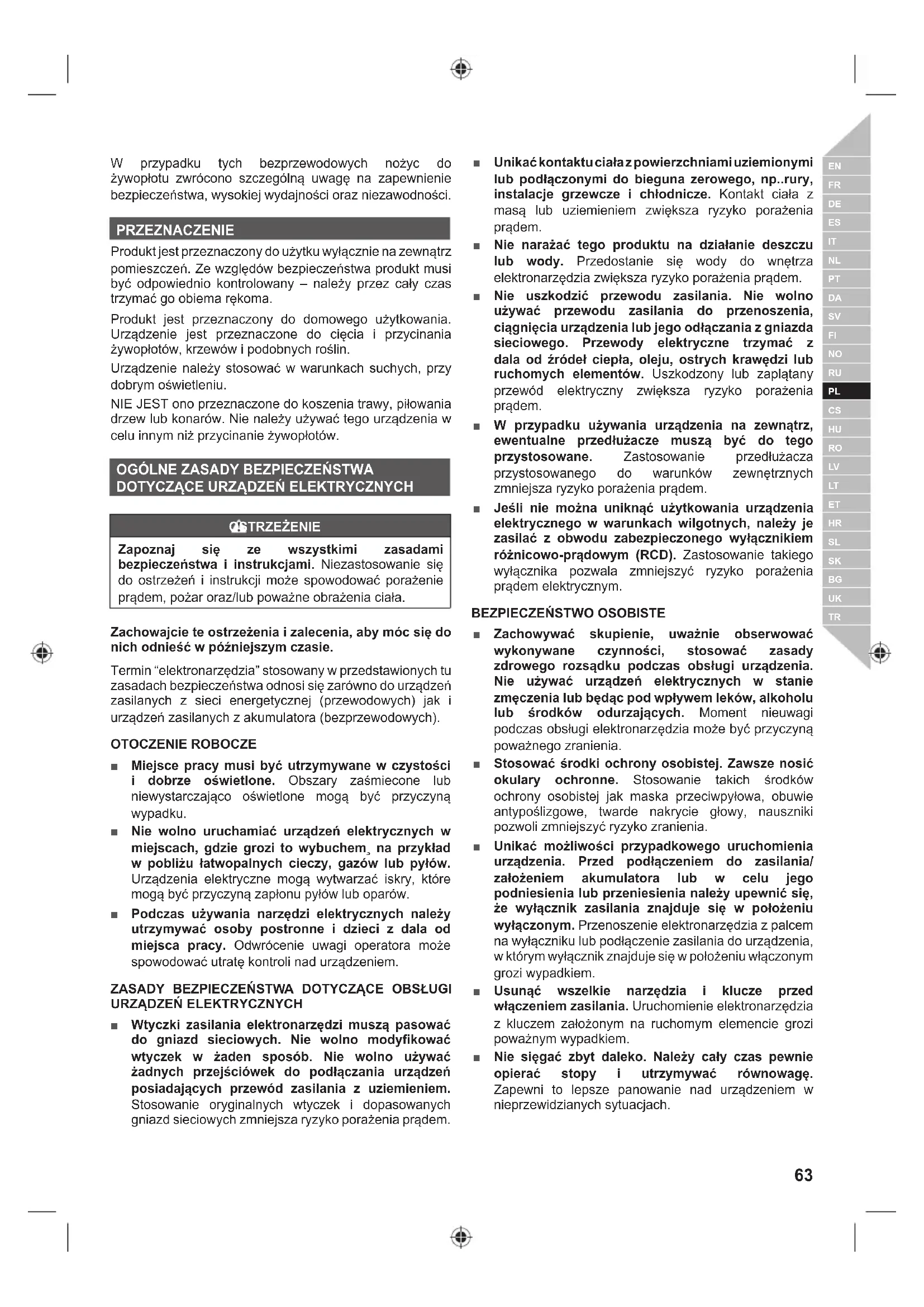 OBSŁUGI NOŻYC DO ŻYWOPŁOTU ■ Wszystkie kończyny należy trzymać z dala od ostrza. Nie usuwać nagromadzonej ścinki ani nie trzymać gałęzi do przecięcia w rękach gdy ostrza pracują. Przed przystąpieniem do usuwania nagromadzonego materiału upewnić się, że urządzenie jest wyłączone. Chwila nieuwagi podczas obsługi urządzenia może spowodować poważne urazy ciała. ■ Przycinarkę należy przenosić trzymając za rękojeść, ostrza nie mogą pracować. Do transportu lub przechowywania zakładać osłonę na element tnący. Odpowiednie obchodzenie się z przycinarką pozwoli zmniejszyć ryzyko zranienia przez jej ostrza. ■ Elektronarzędzie należy trzymać wyłącznie za przewidziane do tego celu izolowane uchwyty, ponieważ istnieje ryzyko przypadkowego zetknięcia się ostrza z niewidocznym przewodem elektrycznym lub własnym przewodem. Kontakt ostrza z przewodem pod napięciem może spowodować przepływ prądu przez metalowe elementy urządzenia i porażenie operatora.