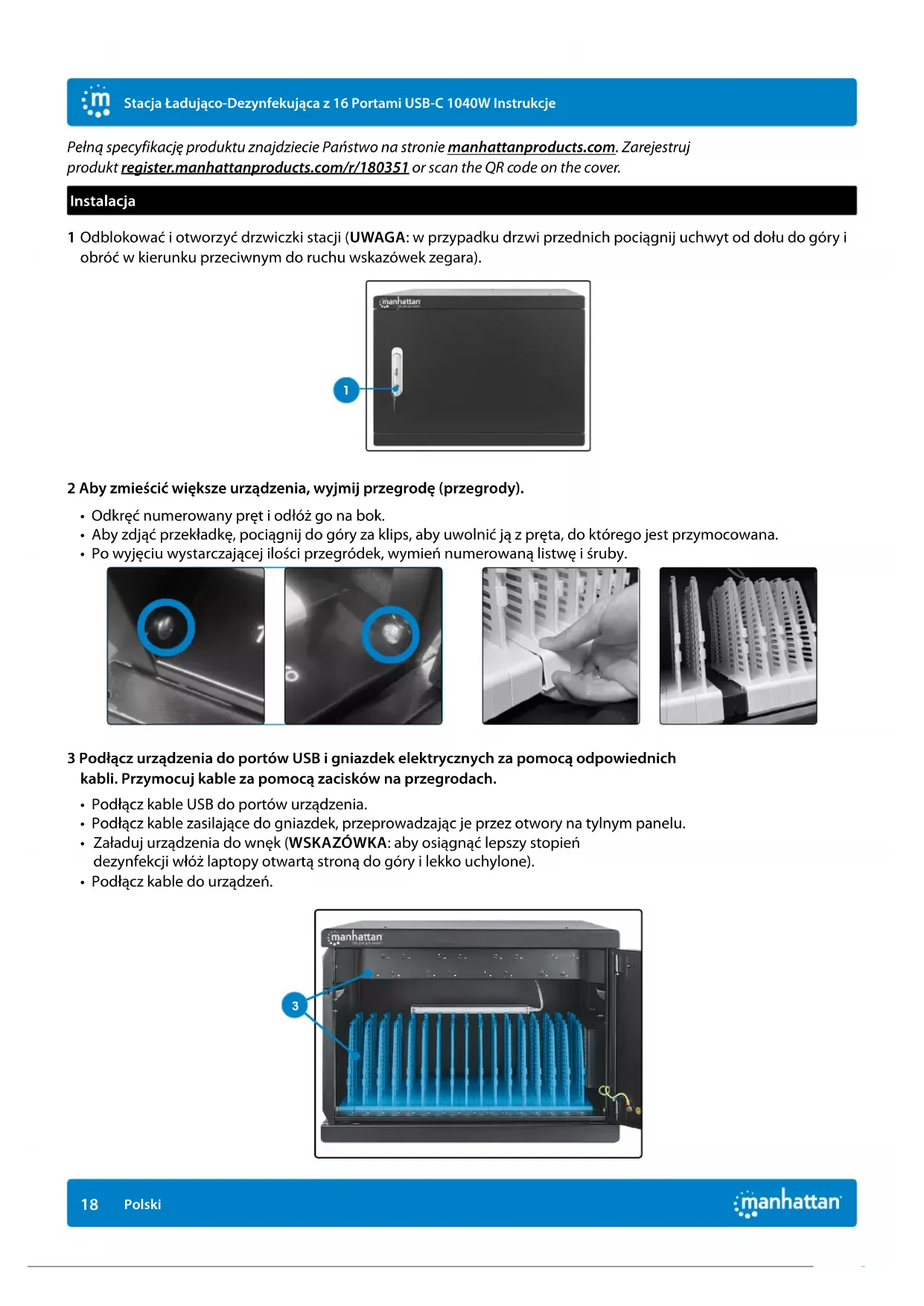Armoire de chargement UVC à forte puissance avec 16 ports USB-C - 1040 W FrançaisPełną specyfikację produktu znajdziecie Państwo na stronie manhattanproducts.com. Zarejestruj produkt register.manhattanproducts.com/r/180351 or scan the QR code on the cover. Instalacja 1 Odblokować i otworzyć drzwiczki stacji (UWAGA: w przypadku drzwi przednich pociągnij uchwyt od dołu do góry i obróć w kierunku przeciwnym do ruchu wskazówek zegara). 2 Aby zmieścić większe urządzenia, wyjmij przegrodę (przegrody).